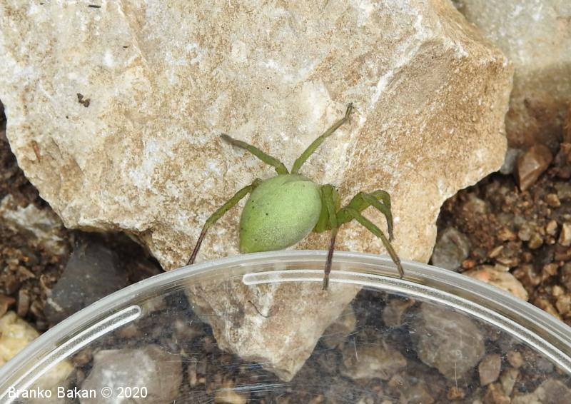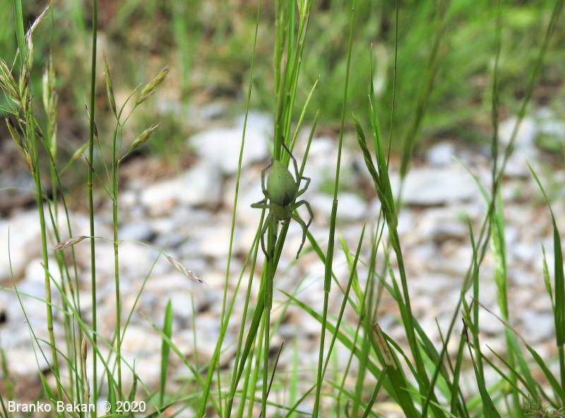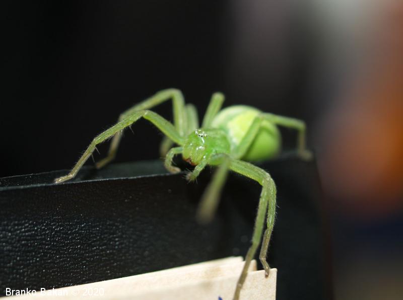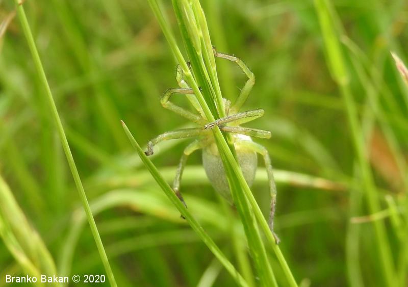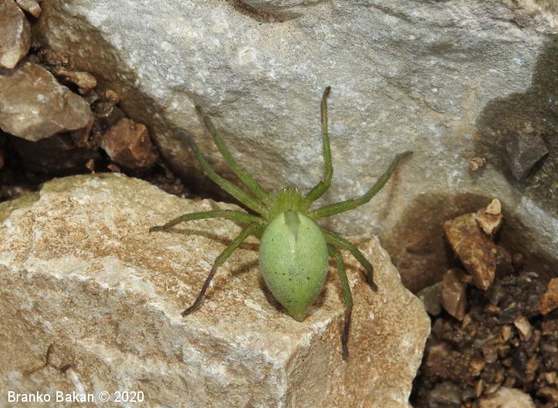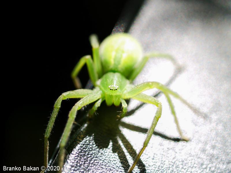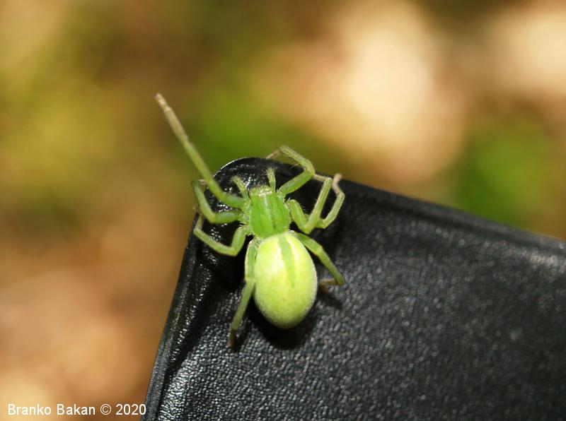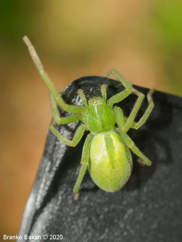 Samica: zelo prepoznavna, saj je skoraj v celoti zelena. Precej velika, s krepkimi, dokaj dolgimi nogami. Glavoprsje je okroglo, pri očeh zoženo. Vseh 8 oči je zelo drobnih, razporejene so v dveh redeh, obrobljene z belimi dlačicami. Zadek je ovalen, podaljšan, s temnejšo, ozko liso v sprednjem delu. Zadnji členki nog so rjavkasti.