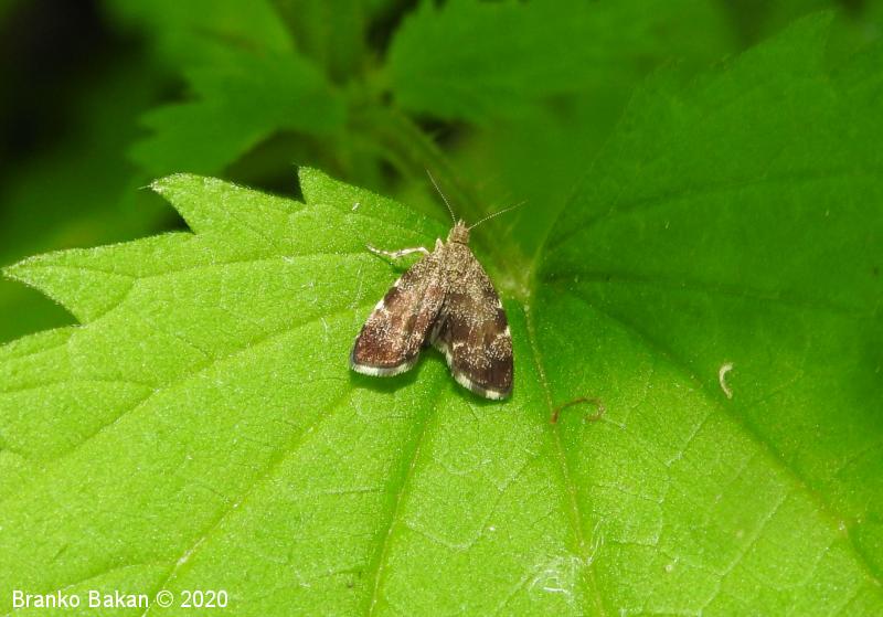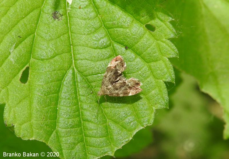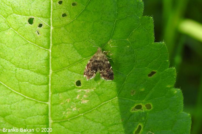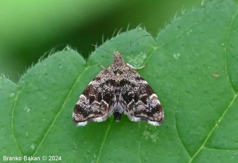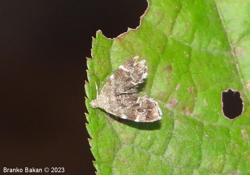 Odrasli osebki: temno- do sivorjavo obarvan, majhen metulj s trikotno zloženimi krili v mirovanju. Ta so kovinsko bleščeča, posejana z belimi luskicami, z nekoliko izrazitejšo, cik-cakasto belo črto v osrednjem delu, belo liso na zunanjem robu bazalnega dela ter serijo belih in temnih dlačic po zunanjem robu kril.