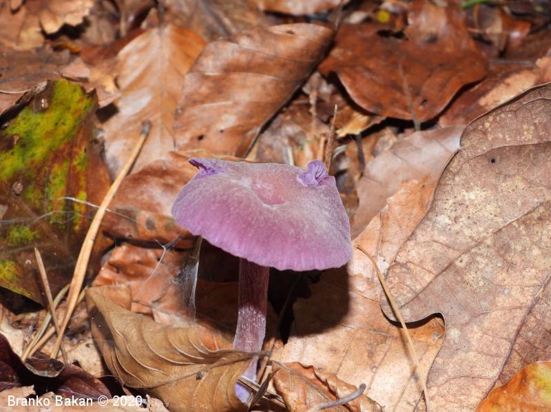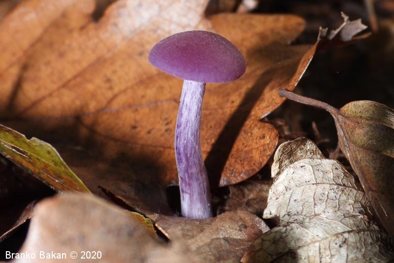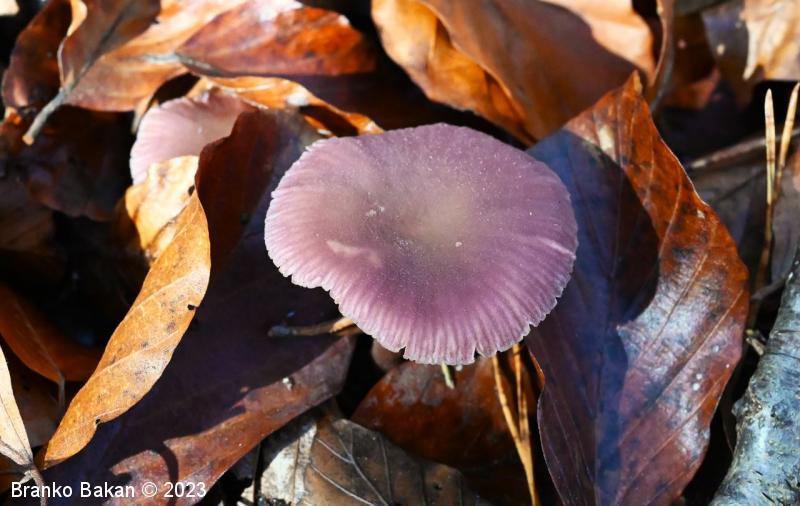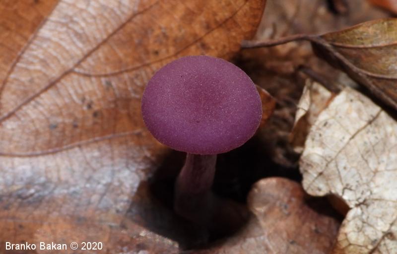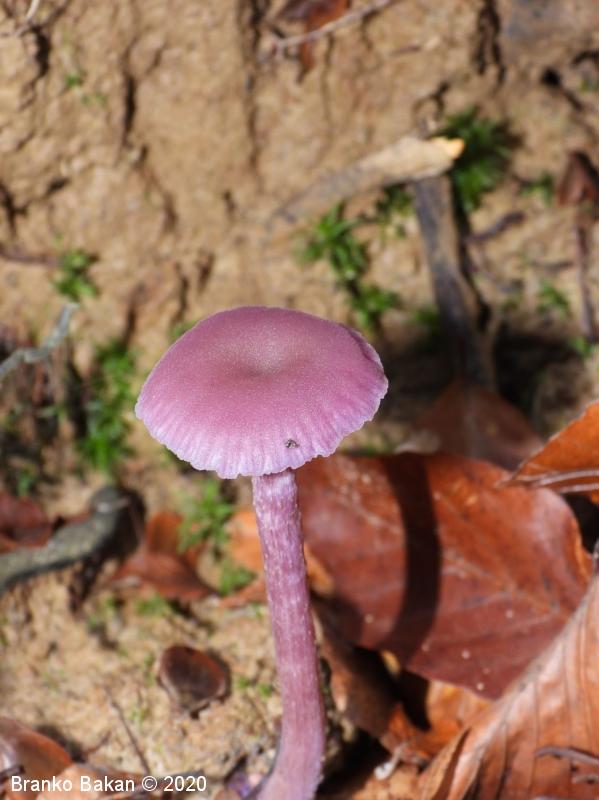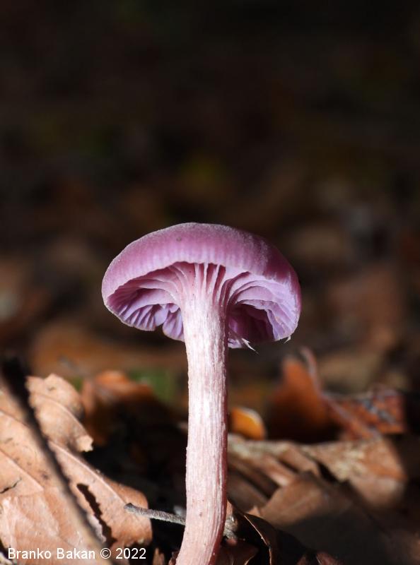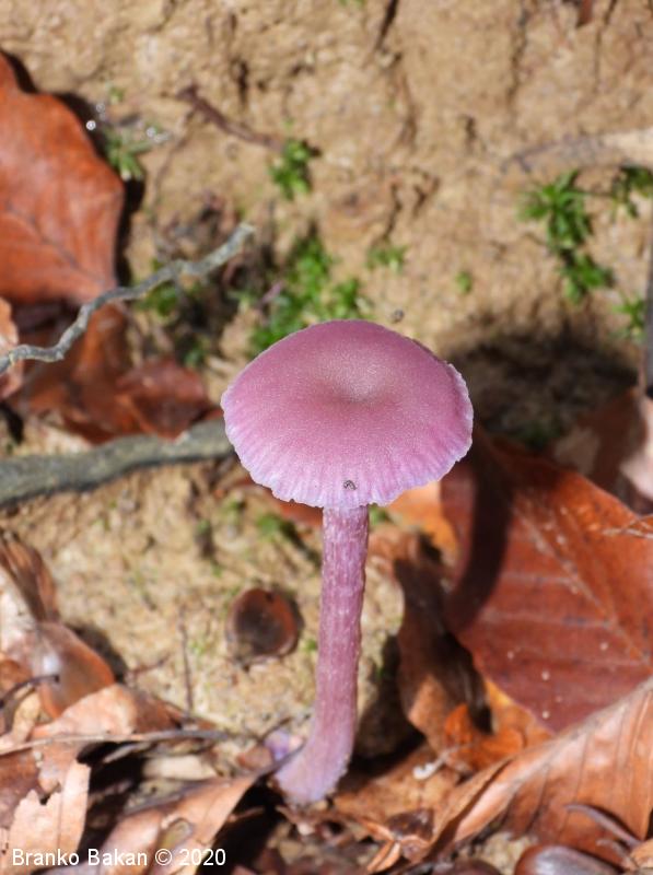 Opis: zaradi vijoličaste obarvanost je dokaj prepoznavna gliva. Klobuk je sprva dežnikasto zaobljen (meduzast), nato razprt, na sredini udrt, gladek, vijoličast, s starostjo zbledi in posivi. Spodnja stran klobuka je porasla z vijoličastimi lističi, ki so med seboj dokaj razmaknjeni, togi in tvorijo trosovnico. Bet je vitek, pecljat, pogosto ukrivljen, vijoličast, večinoma luskast. Meso je vijoličasto, nekoliko žilavo in prijetnega vonja.
