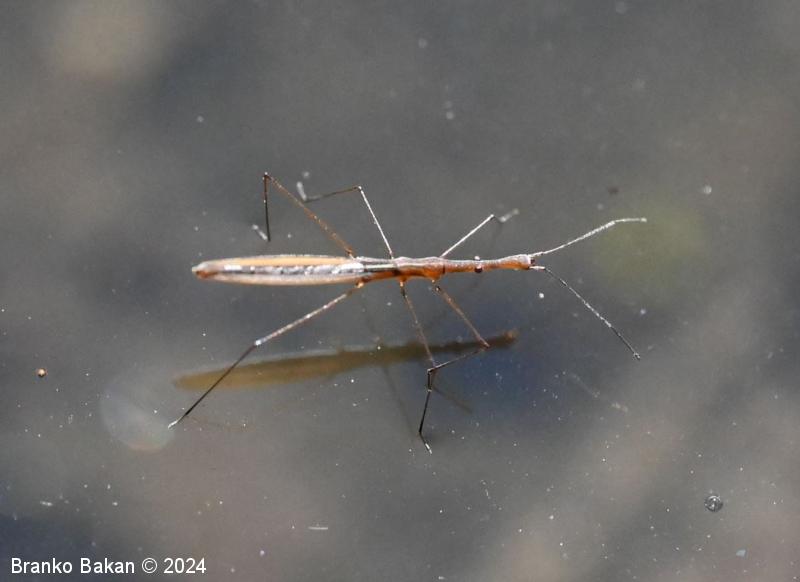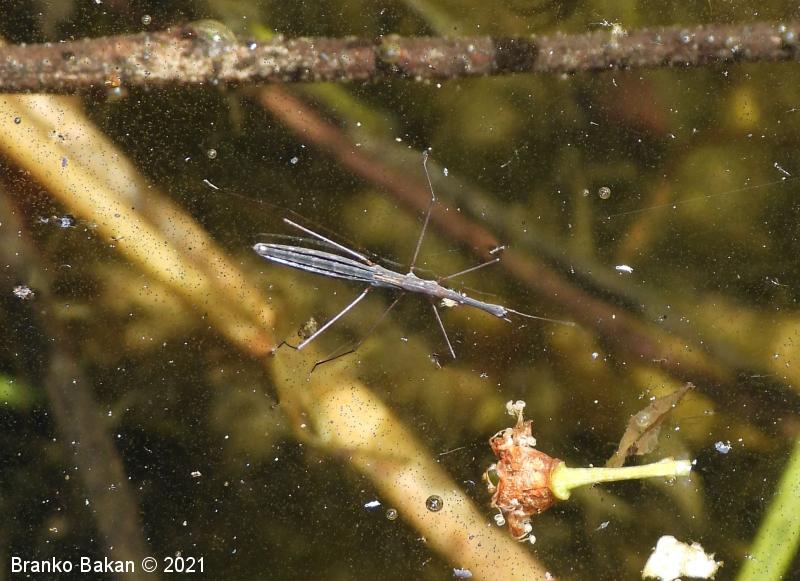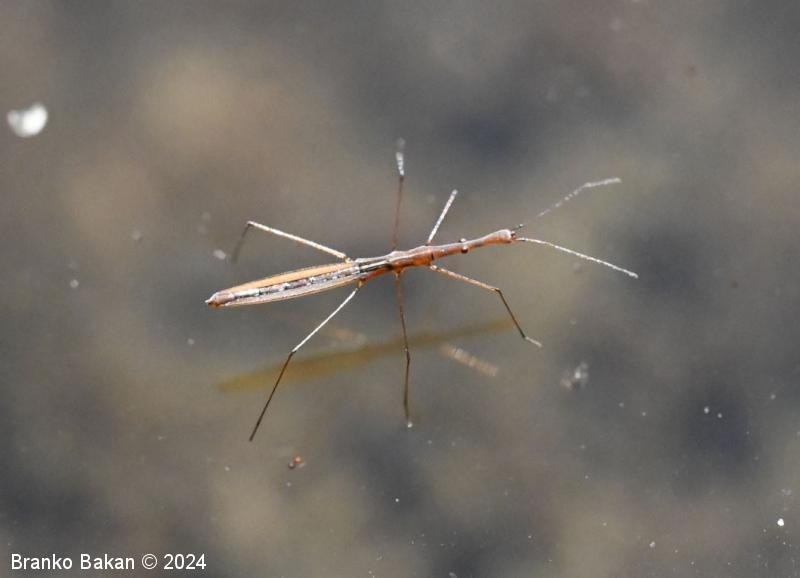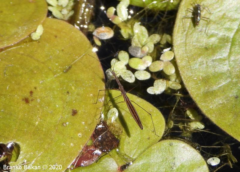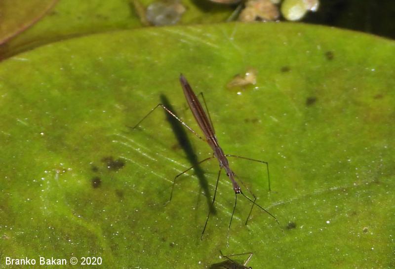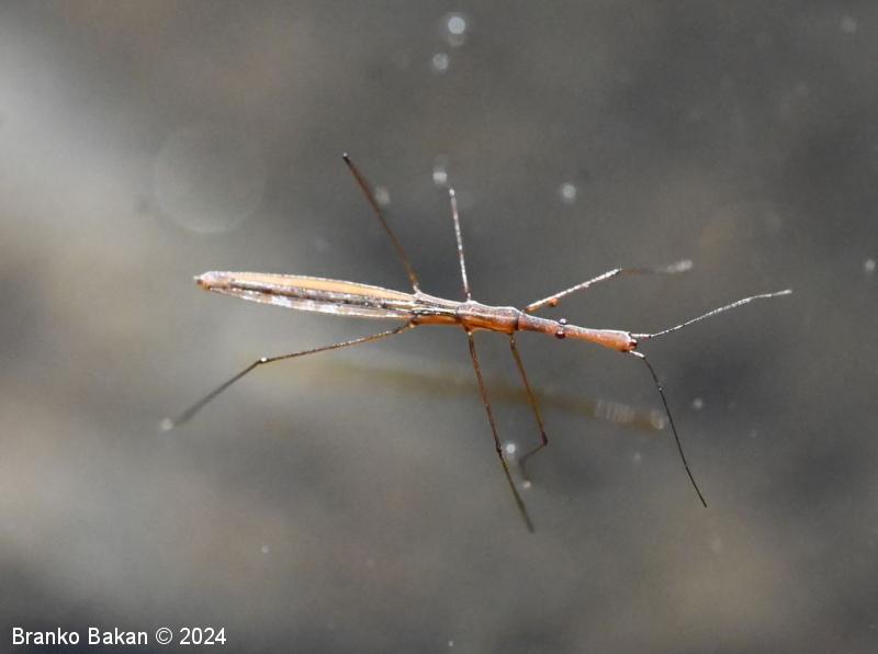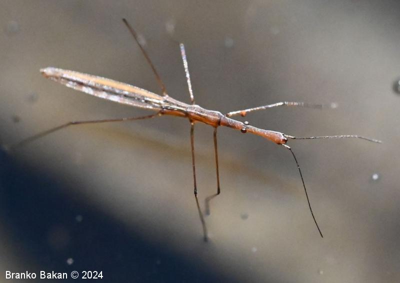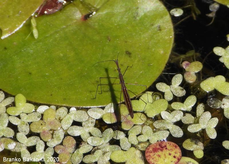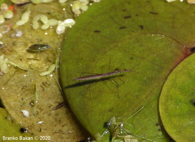 Odrasli osebki: zelo nežna, ozkopodolgovata, sivorjava do črnikasta stenica, ki spominja na drobno vejico. Glava je močno podaljšana, ozka, pri ustnem delu nekoliko razširjena, oči so nameščene nekje na sredini. Tipalnice so tanke, dolge, tudi noge so dolge in tanke, dvignjene nad gladino. Oprsje je podaljšano, nekoliko grbasto. Krila so močno reducirana, le redko se pojavijo osebki s popolno razvitimi krili. Zadek je tanek, dolg, ob robovih segmentov velikokrat z belimi lisami ali črto.