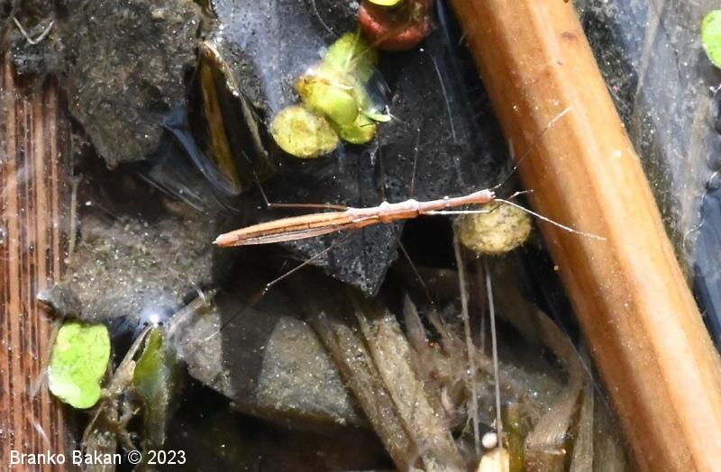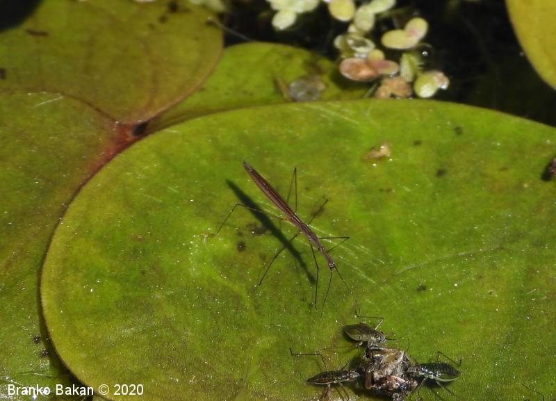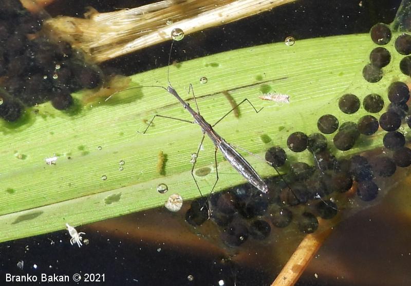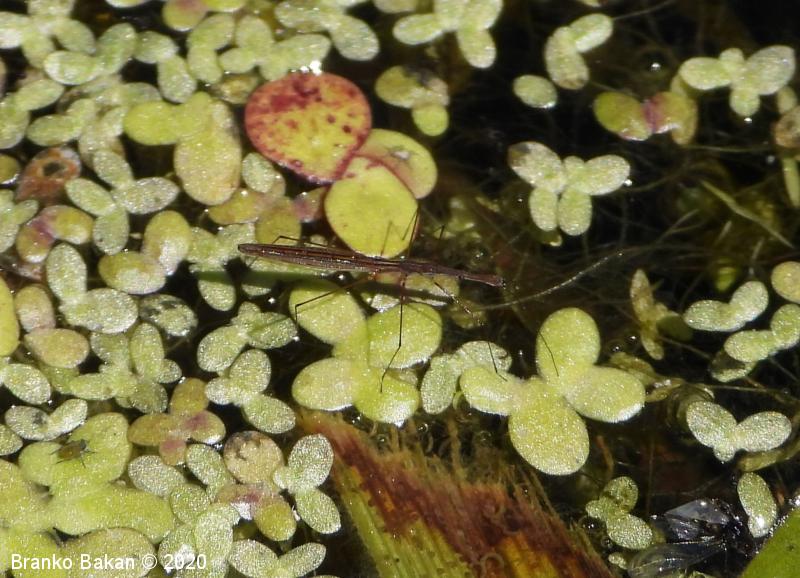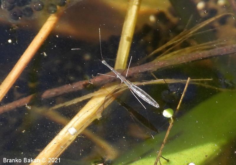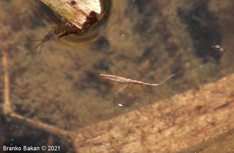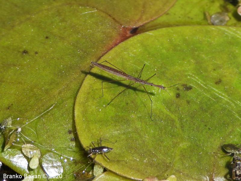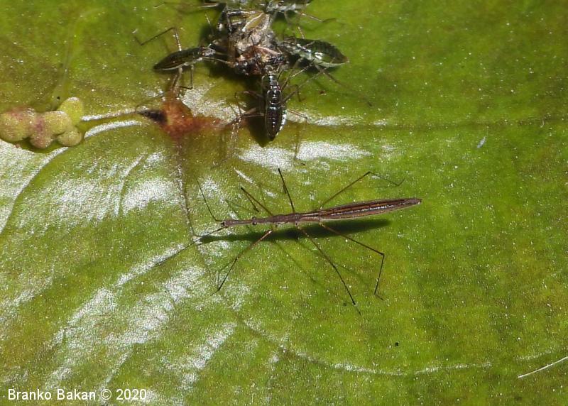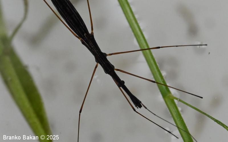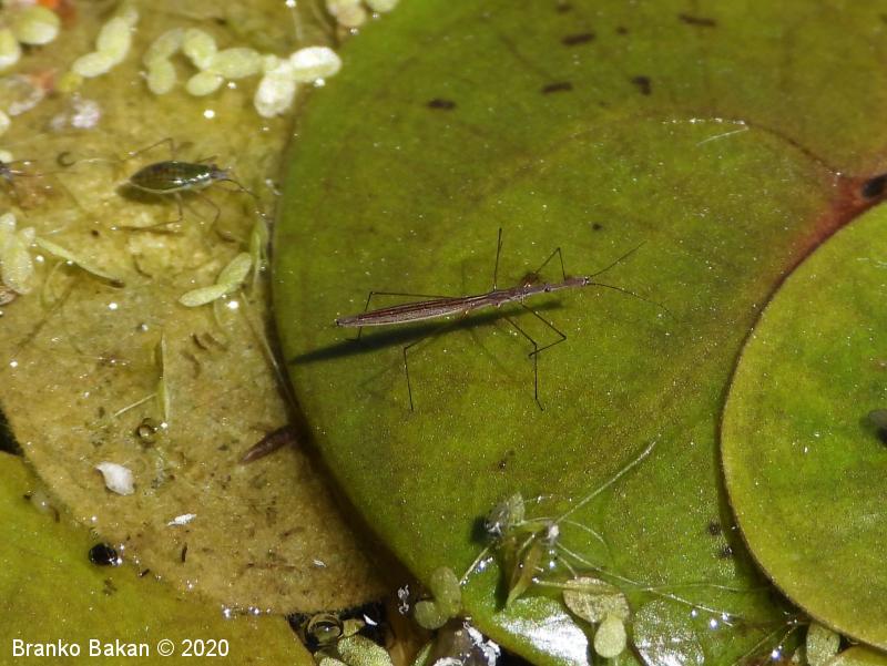 Odrasli osebki: zelo nežna, ozkopodolgovata, sivorjava do črnikasta stenica, ki spominja na drobno vejico. Glava je močno podaljšana, ozka, pri ustnem delu nekoliko razširjena, oči so nameščene nekje na sredini. Tipalnice so tanke, dolge, tudi noge so dolge in tanke, dvignjene nad gladino. Oprsje je podaljšano, nekoliko grbasto. Krila so močno reducirana, le redko se pojavijo osebki s popolno razvitimi krili. Zadek je tanek, dolg, ob robovih segmentov velikokrat z belimi lisami ali črto.