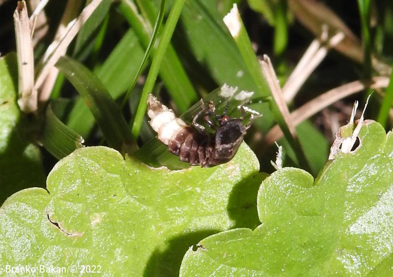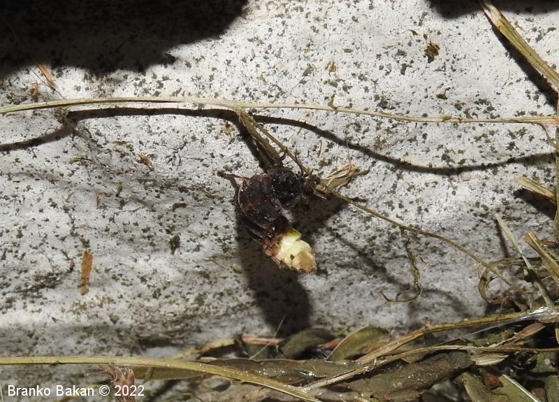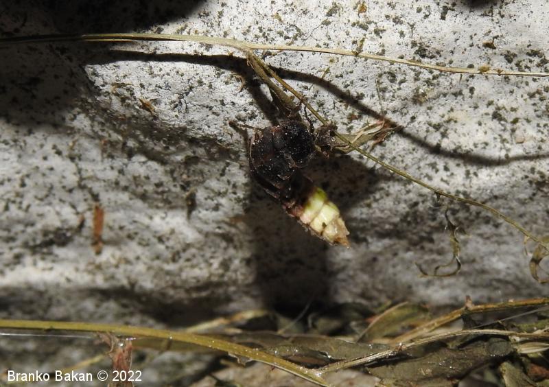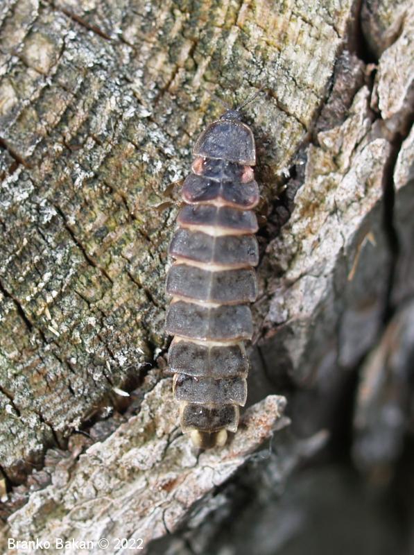 Samica: zelo velika, črnorjava, brez kril, podobna ličinkam. Glava je drobna, skrita pod širokim, kupolastim oprsjem, ki je na zgornji strani zaobljeno ter svetlo obrobljeno, na spodnjem delu ravno. Tipalnice so drobnočlenaste. Zadek je velik, dolg, s širokimi segmenti, ki so svetlo obrobljeni, po spodnji strani rdečkasto- do rožnatorjavo lisasti. Zadnji segmenti zadka so belkasti in so del svetilnega organa. Noge so rjavkaste, dokaj kratke.