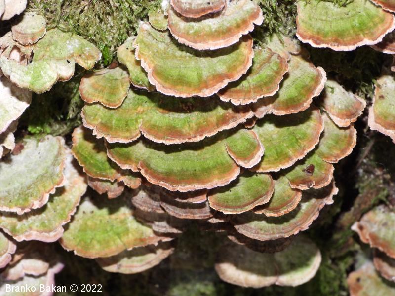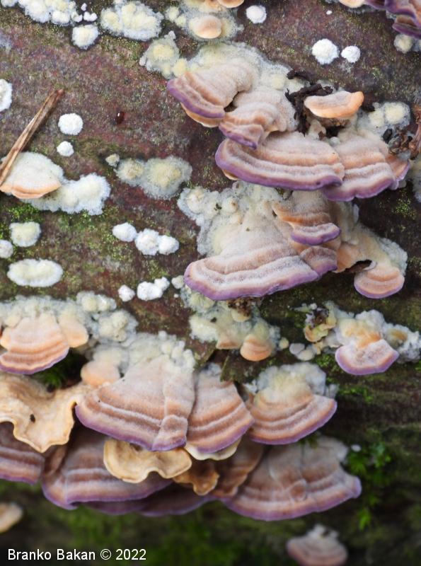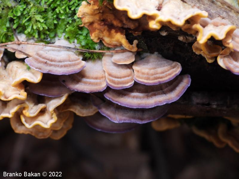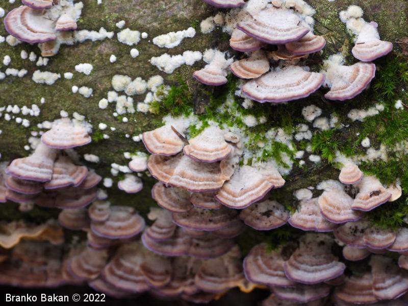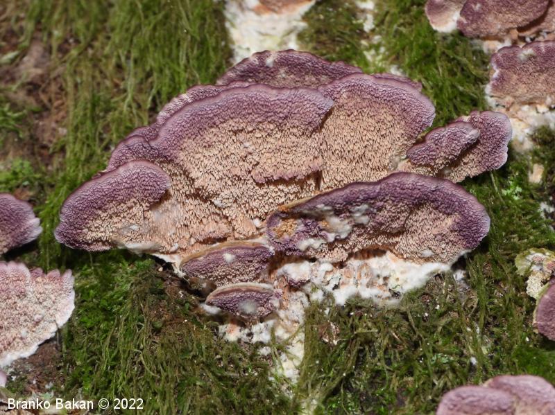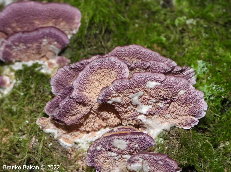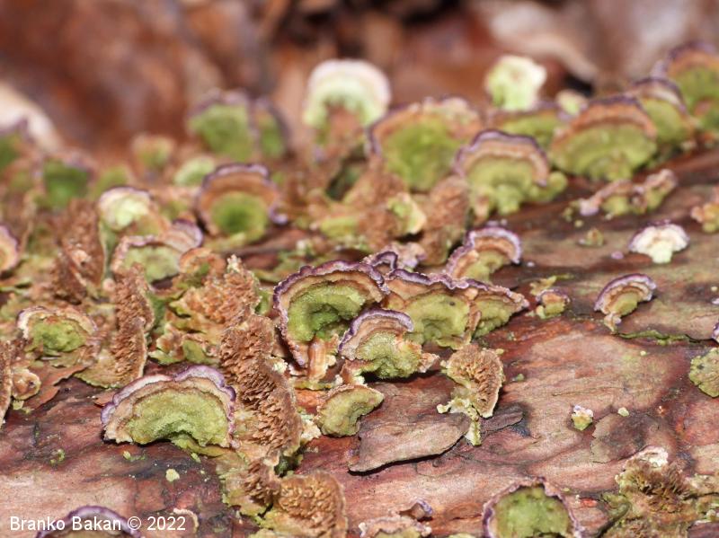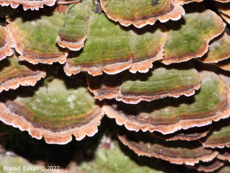 Opis: trosnjak je pahljačaste, diskaste ali polkrožne oblike, obstransko pritrjen na podlago, brez beta, plosk do naguban, izrazito kratkodlakav, z raznobarvnimi koncentričnimi pasovi, ki so bledikavi, bledovijoličasti, rjavkasti ali sivkastorjavi, celo črni ter z izrazitim, vijoličastim robnim kolobarjem, ki je belo obrobljen in pri starih trosnjakih porjavi. Povrhnjica s staranjem močno obledi in je pogosto porasla z mikroskopskimi zelenimi algami. Trosovnica (spodnja stran klobuka) je luknjičasta, pri mladih in svežih trosnjakih je vijoličasta, s staranjem bledi, porjavi oz. posivi, luknjice pa se cevkasto povečajo.