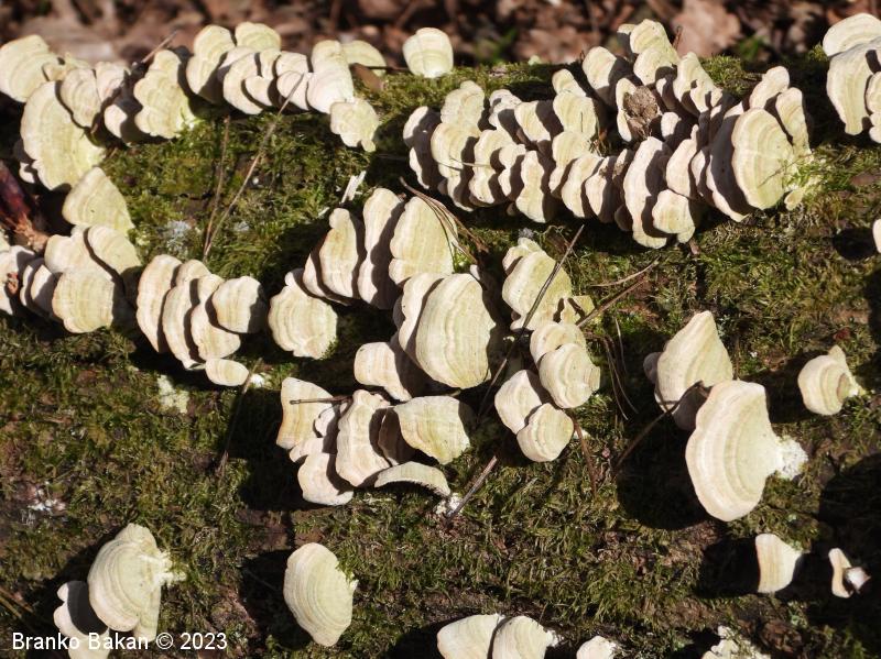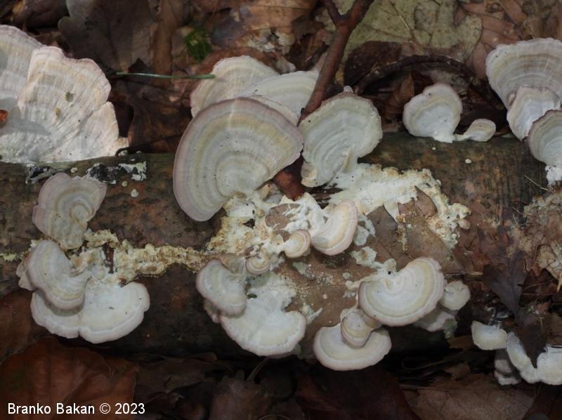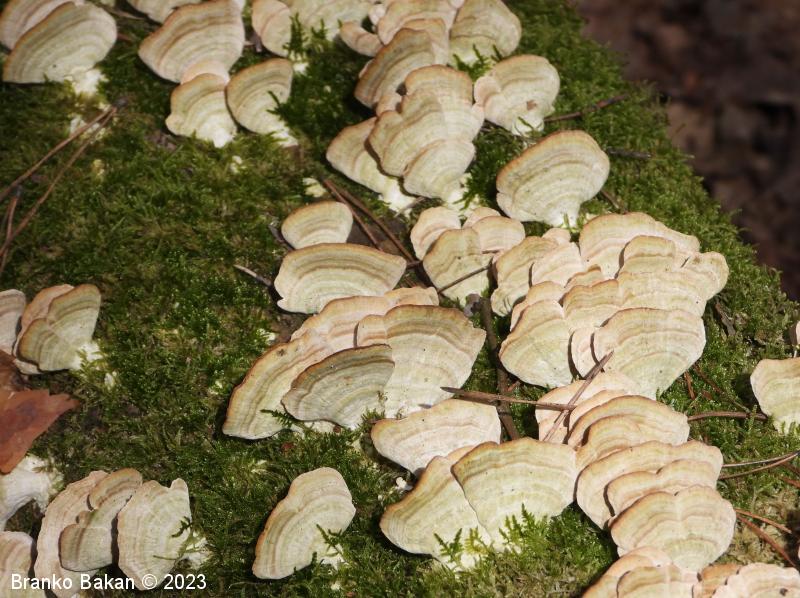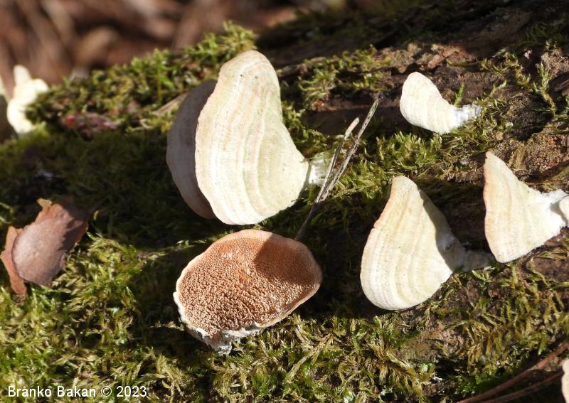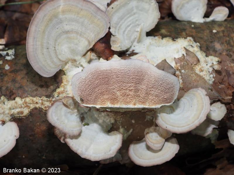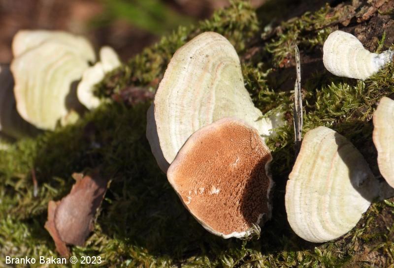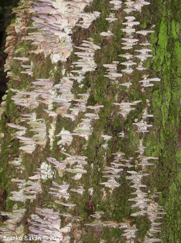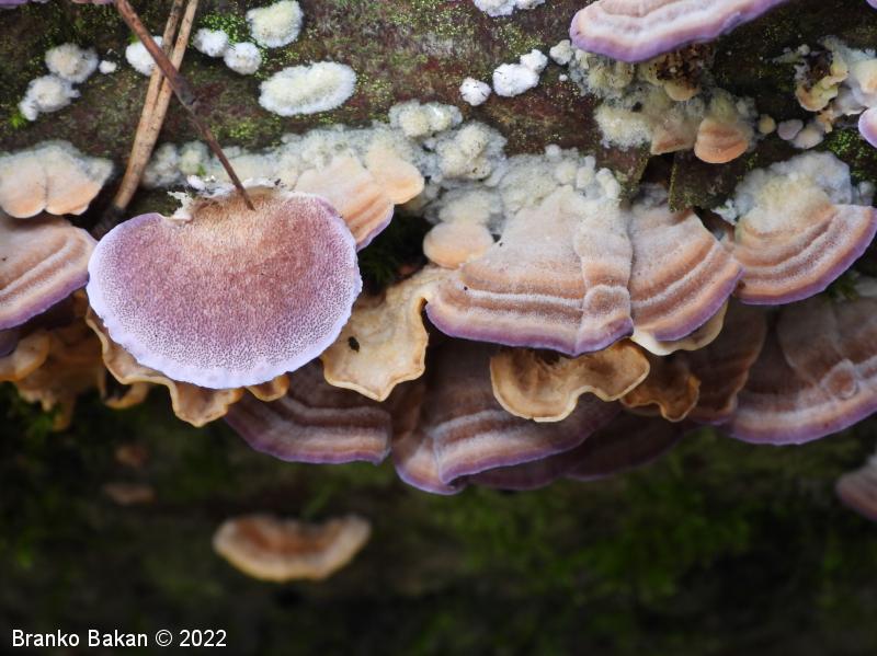 Opis: trosnjak je pahljačaste, diskaste ali polkrožne oblike, obstransko pritrjen na podlago, brez beta, plosk do naguban, izrazito kratkodlakav, z raznobarvnimi koncentričnimi pasovi, ki so bledikavi, bledovijoličasti, rjavkasti ali sivkastorjavi, celo črni ter z izrazitim, vijoličastim robnim kolobarjem, ki je belo obrobljen in pri starih trosnjakih porjavi. Povrhnjica s staranjem močno obledi in je pogosto porasla z mikroskopskimi zelenimi algami. Trosovnica (spodnja stran klobuka) je luknjičasta, pri mladih in svežih trosnjakih je vijoličasta, s staranjem bledi, porjavi oz. posivi, luknjice pa se cevkasto povečajo.