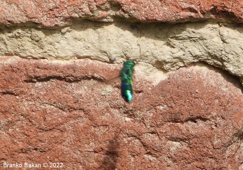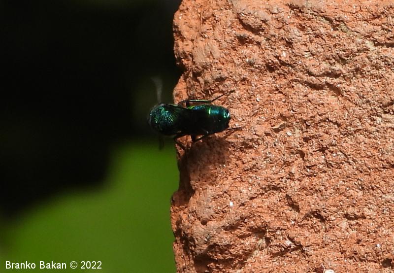 Odrasli osebki: telo je v celoti kovinsko bleščeče modrozelene barve ali turkizno modrovijoličasto, grobo drobno bradavičasto. Glava je široka, z velikimi, temnimi očmi, tipalnice so nitaste, temne, bazalni členek je podaljšan. Oprsje je dokaj veliko, kratko dlakavo, drobno bradavičasto. Krila so rahlo prosojno rjavkasta, z malo krepkimi žilami. Zadek je podobno obarvan kot oprsje, včasih s temnejšimi, modrimi pasovi, na bazalnem delu je tako širok kot oprsje, na koncu trikotno robato. Noge so kovinsko bleščeče zelene ali modre. Samci so pogosto temnejši od samic.