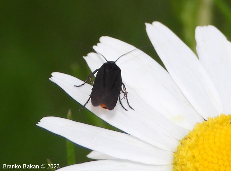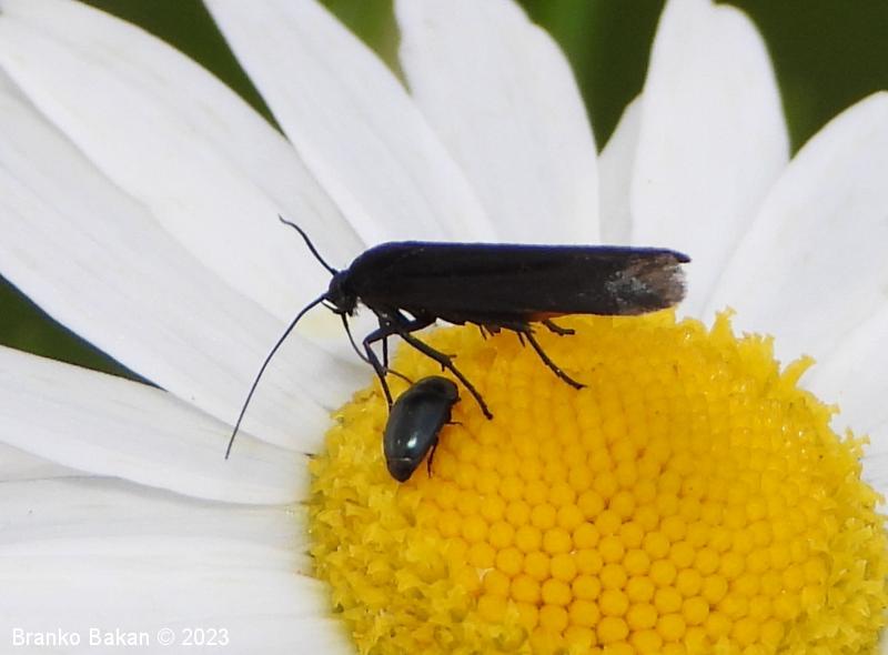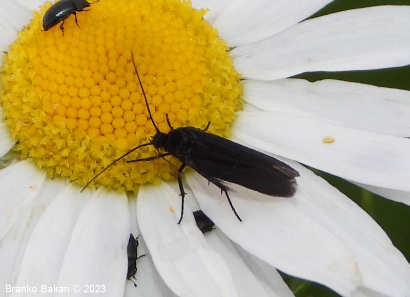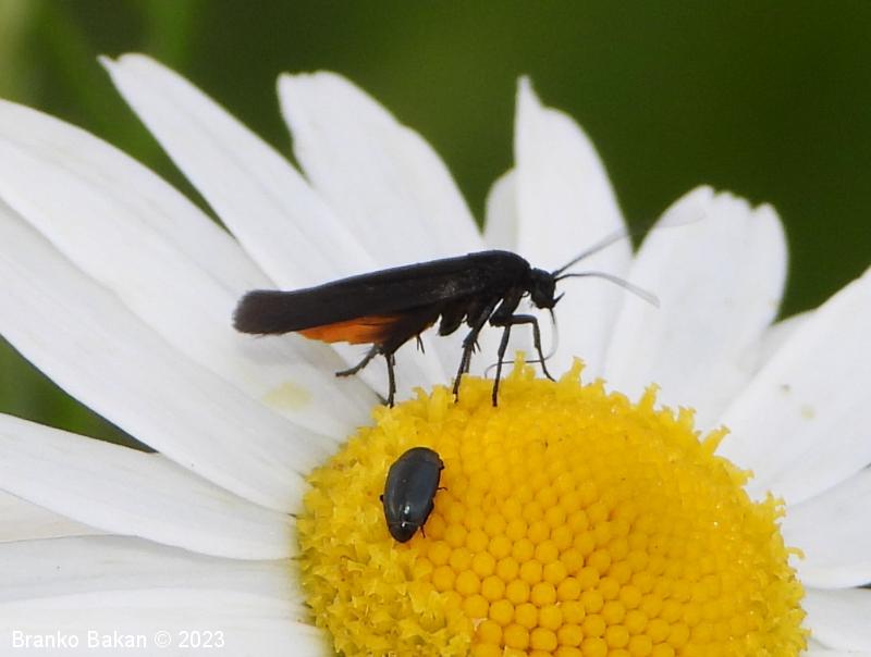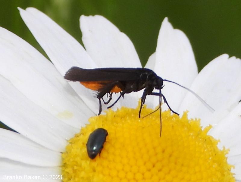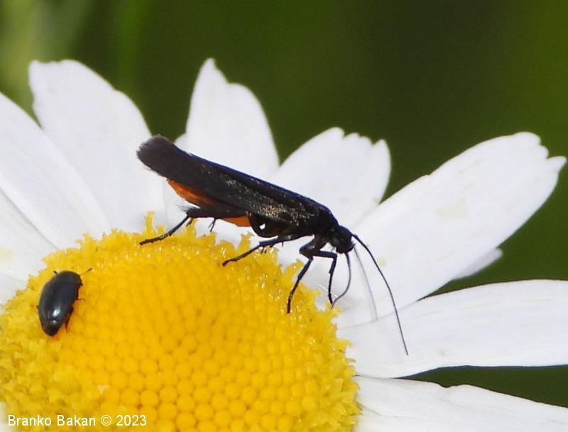 Odrasli osebki: krila so ozko podolgasta, rahlo usločena in pri zunanjem delu nekoliko razširjena, v mirovanju strehasto zložena vzdolž telesa. Obarvanost sprednjih kril nekoliko variira, prevladujejo žametno črna krila z rahlo modrim leskom, ki imajo po dve rumeni lisi v bazalnem delu in po dve rumeni lisi na marginalnem delu kril, lahko pa lise v celoti manjkajo. Zadnja krila so v celoti črna, po robu dolgo resasto dlakava. Telo je prav tako črno, le zadnji del zadka je s spodnje strani rumenordeč. Noge so dolge, vitke, zadnje goleni so zaradi dolgih dlak videti "hlačaste".