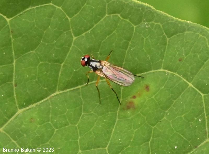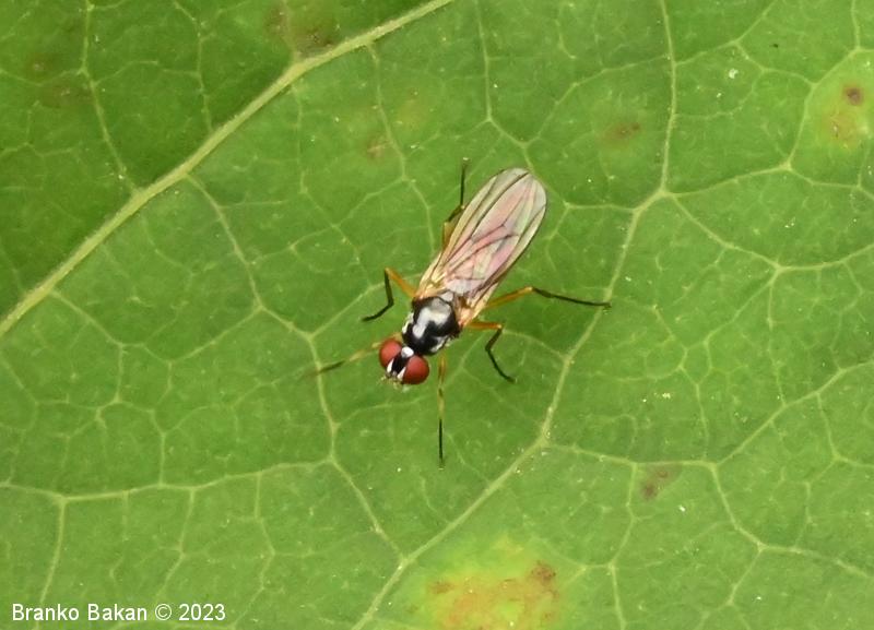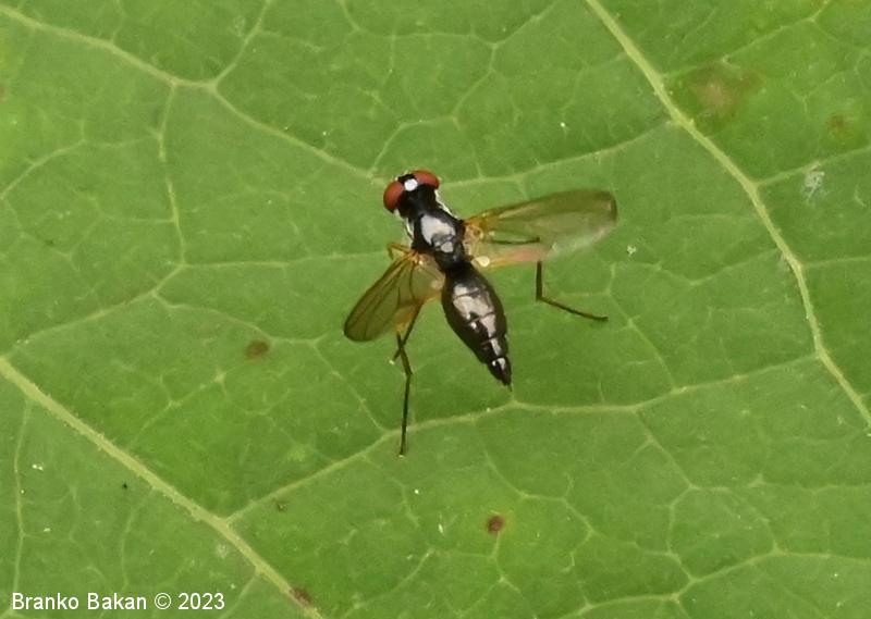 Odrasli osebki: glava je bleščeče črna, z velikimi, rdečimi očmi in belo temensko "piko" (gre za diskasto tvorbo za pikčastimi očmi), frontalni del glave je svetel, s črno, trikotno liso. Tipalnice so betičaste, z nitastimi aristami. Oprsje je bleščeče črno, sprednji del je ob straneh plosko razširjen, obstranski del oprsja je belo obrobljen. Ščitek (scutellum) je majhen, jezičast, temen. Krila so podolgasta, z malo žilami, ki so večinoma enostavna. Zadek je podolgasto eliptičast, proti dnu koničasto podaljšan in zožen v sprednjem delu, bleščeče črn. Noge so precej dolge, vitke, stegenca so rumenkasta, le sprednja so večinoma v drugi polovici črna, stopalca in goleni srednjih ter zadnjih nog so temna.