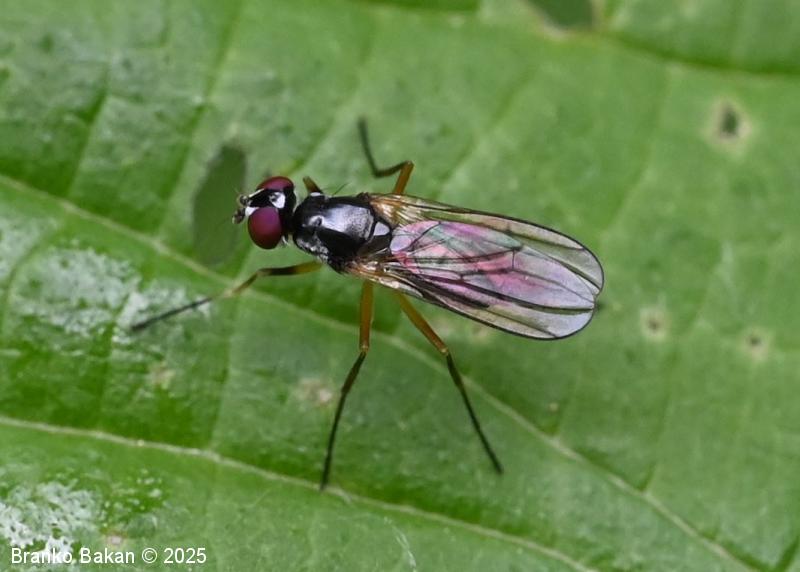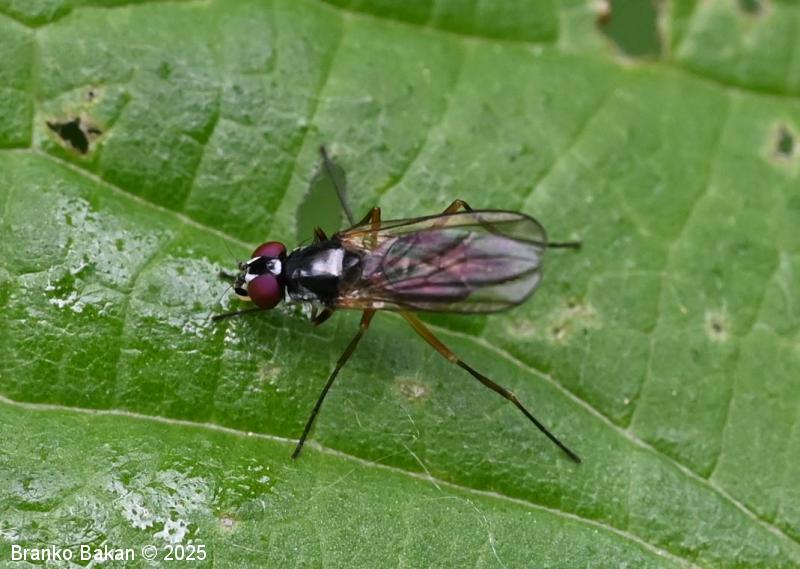 Odrasli osebki: glava je na temenu bleščeče črna, z velikimi, rdečimi očmi in belo temensko "piko" (gre za diskasto tvorbo za pikčastimi očmi), frontalni del glave je bel, s črno, trikotno liso. Tipalnice so betičaste, z nitastimi aristami. Oprsje je bleščeče črno, sprednji del je ob straneh plosko razširjen, obstranski del oprsja je belo obrobljen. Ščitek (scutellum) je majhen, jezičast, temen. Krila so podolgasta, z malo žilami, ki so večinoma enostavna. Zadek je podolgasto eliptičast, proti dnu koničasto podaljšan in zožen v sprednjem delu, bleščeče črn. Noge so precej dolge, vitke, stegenca so rumenkasta, le sprednja so večinoma v drugi polovici črna, stopalca in goleni srednjih ter zadnjih nog so temna.
