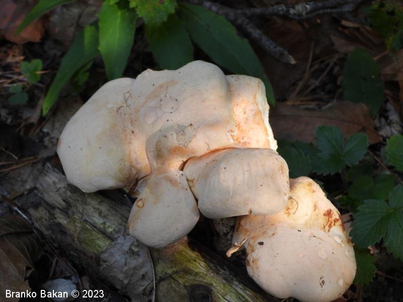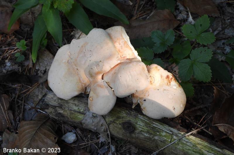 Opis: trosnjak je precej velik, večinoma iz istega micelija izrašča po več trosnjakov skupaj. Klobuk je večinoma nepravilno oblikovan, sprva polkrožen, nato izbočen, močno krpat oz. nacepljen, rob je izrazito spodvihan, povrhnjica je bledo rumenkastorjava do okrasta, pri starejših trosnjakih rahlo hrapava, pogosto je več klobukov med seboj zraslih. Trosovnica je gobasta, zelo drobno luknjičasta, bela, s staranjem postane rjavkasta. Bet je nepravilen, pogosto ne izrašča iz sredine, pri vrhu se razširi, rahlo gobast, belkast. Meso je belo, debelo in trdikavo, lomljivo.