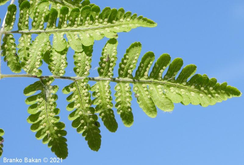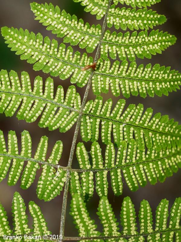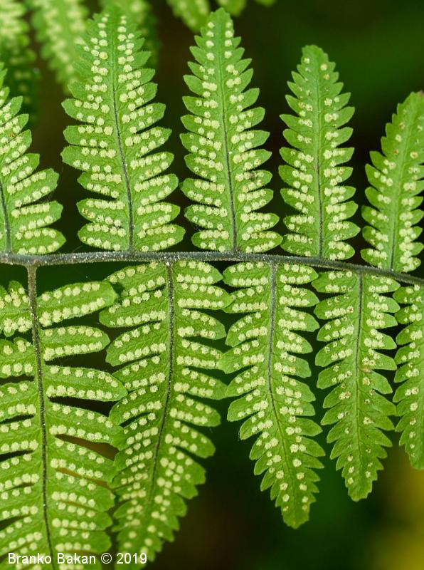 Opis: trajnica z dolgo, podzemno koreniko iz katere izraščajo posamični listi. Listi v obrisu trikotni, 3-krat pernato sestavljeni, krepki, po spodnji strani in po peclju žlezastodlakavi, spodnja segmenta 1. reda le nekoliko večja od naslednjih dveh. Listni pecelj mnogo daljši od listne ploskve (1- do 1.5-krat daljši). Trosišča okrogla, nimajo zastiralca.