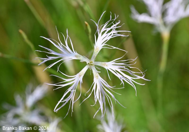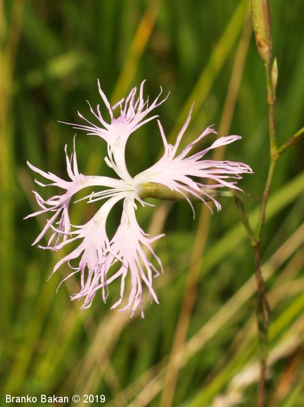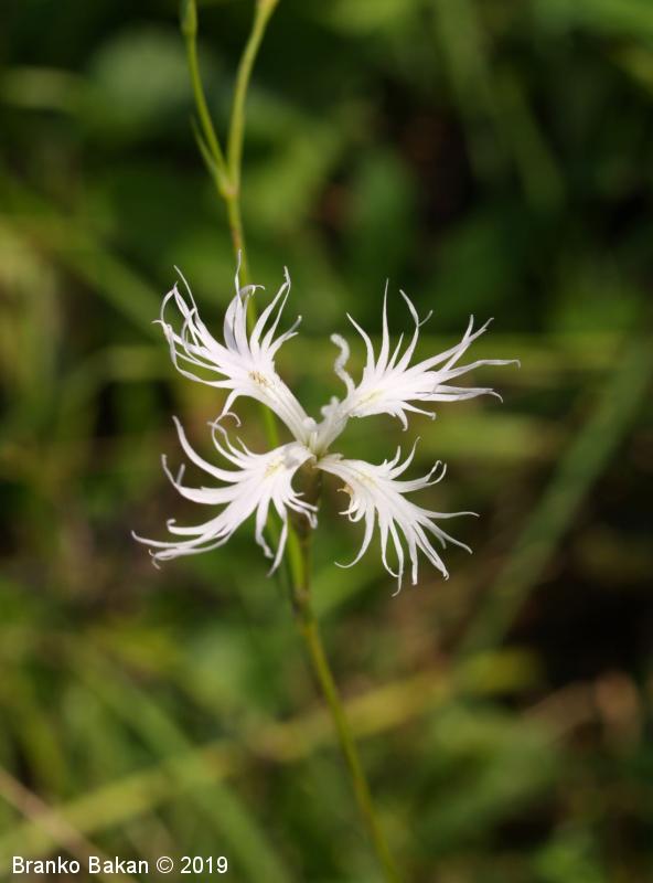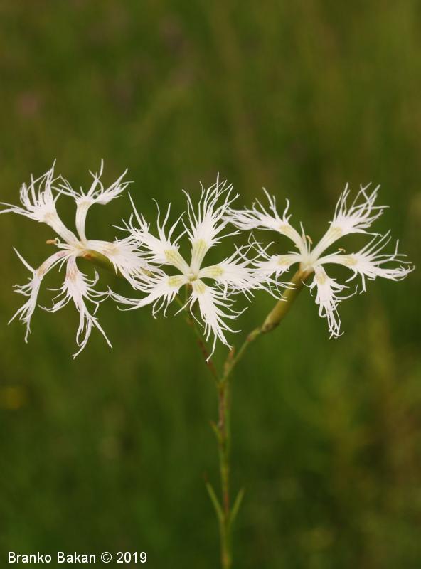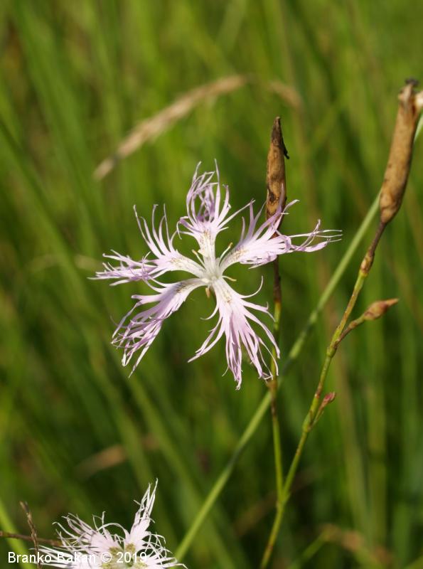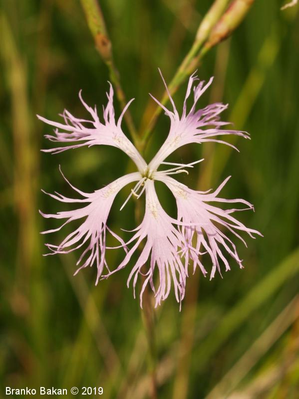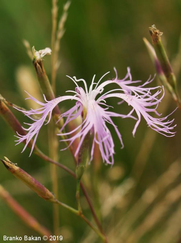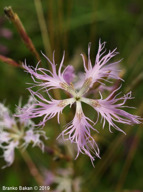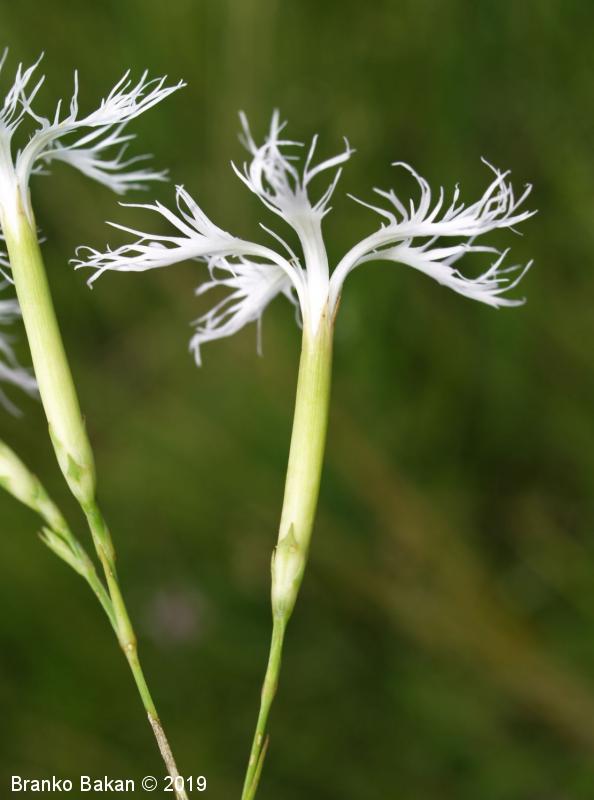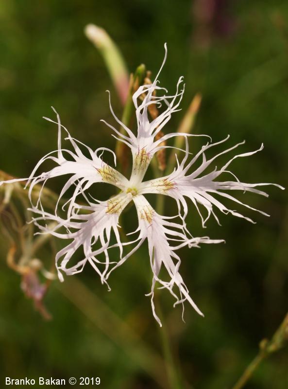 Opis: pokončna trajnica s pritličnimi, jalovimi stranskimi poganjki. Steblo v zgornjem delu razvejano, sinjezeleno, golo. Listi ozko črtalasti do ozko suličasti, paroma med seboj zrasli v krajšo listno nožnico, goli, temno- do sinjezeleni. Cvetovi združeni v rahla, razrasla ovršna socvetja, dolgopecljati, 2 do 2.5 cm veliki, nežno dehteči. Venčni listi bledo rožnati ali belkasti, z resasto nacefrano, skoraj do dna deljeno ploščico, ki ima na bazi rumenorjavkaste ali rožnate dlake, ter do 2.3 cm dolgo, zelo ozko žebico. Čašne luske suličaste, zelene, proti vrhu naglo zožene v kratko, bodičasto konico. Čašni listi med seboj zrasli v zelo dolgo, svetlozeleno čašno cev, goli, znatno daljši od čašnih lusk. Prašnikov 10, vratova na pestiču 2. Plod je glavica.