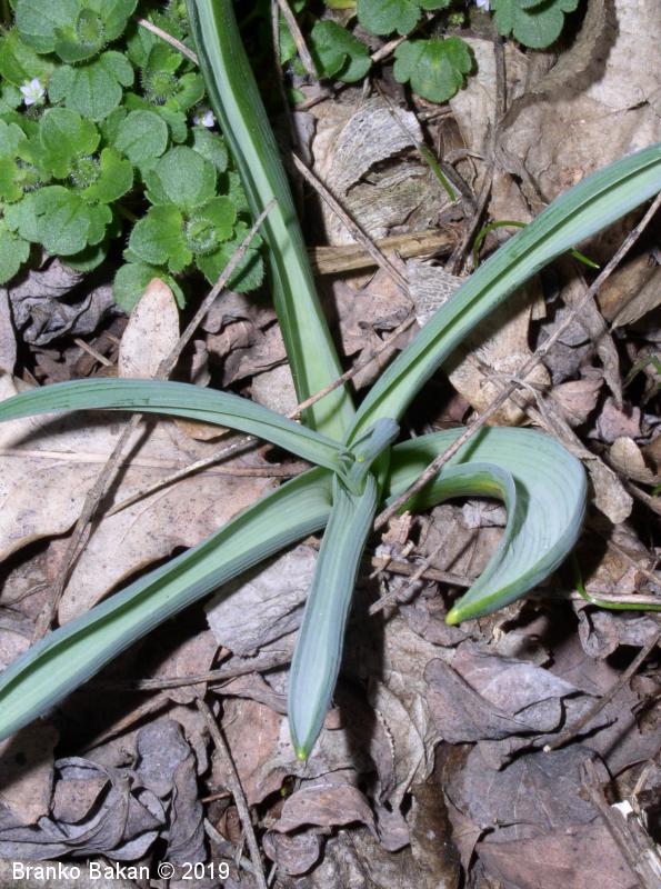 Opis: trajnica s čebulico. Vsi listi pritlični, črtalasto suličasti, ploski, pokončno štrleči, brazdasto žilnati, sinjezeleni, na vrhu podaljšani v kapucasto konico. Cvetovi zgoščeni v strnjeno, grozdasto ovršno socvetje, kratkopecljati, okrogli, svetlomodri, blagodehteči. Pelodna zrna so rjavočrna. Plod je trikotna glavica.