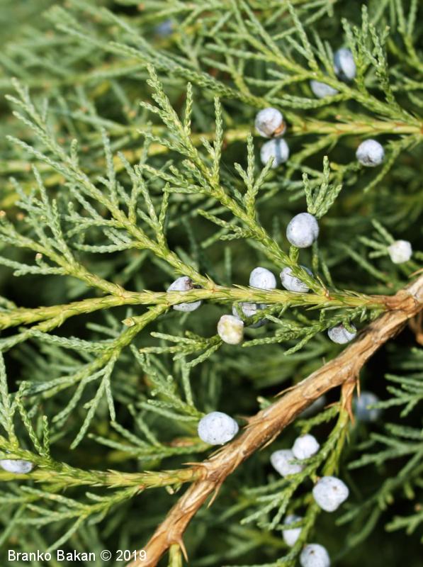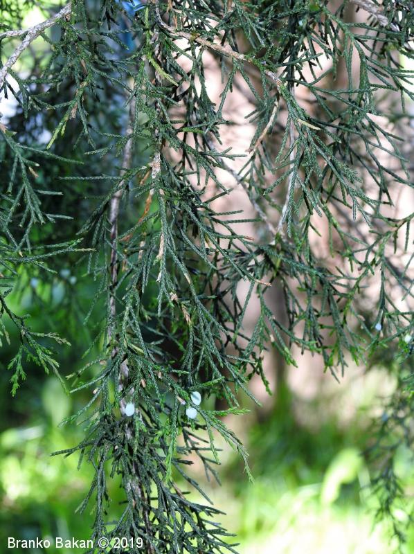 Opis: drevo, redkeje grm, z neenakomerno razraslo krošnjo in dokaj tankimi poganjki. Lističi drobni, okrog 3-4 mm veliki, plosko prilegli ob poganjke, modrikasto- do belkasto zeleni, na mladih poganjkih pa so listi koničasti, štrleči in bodeči, do 1 cm veliki. Storžki okroglasti, manj kot 1 cm veliki, mesnati, temnomodri, belkasto poprhnjeni.