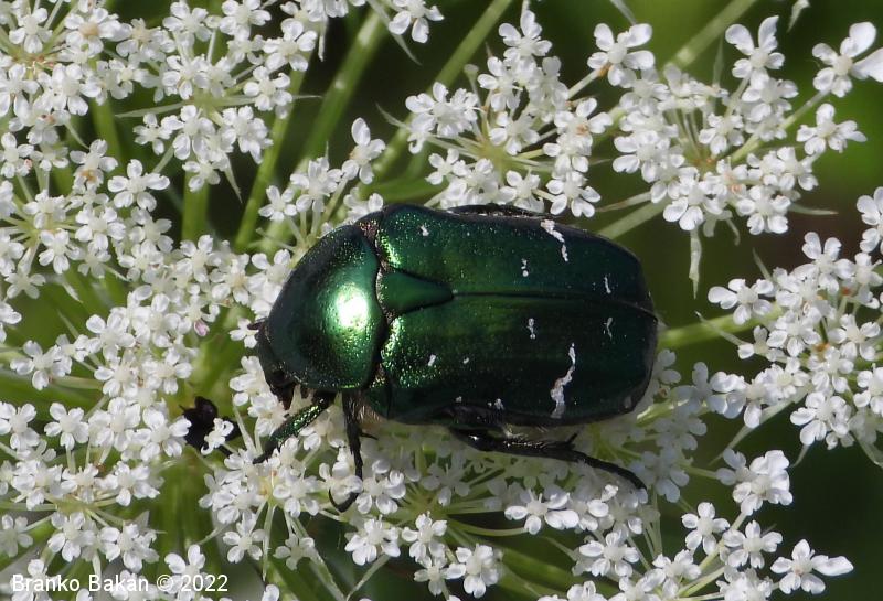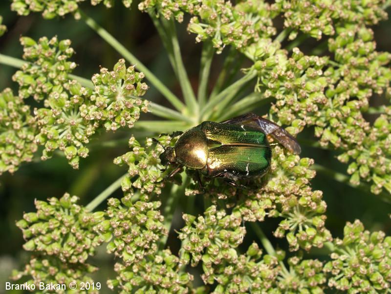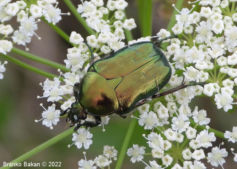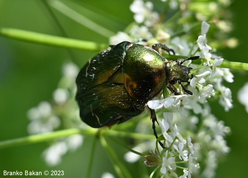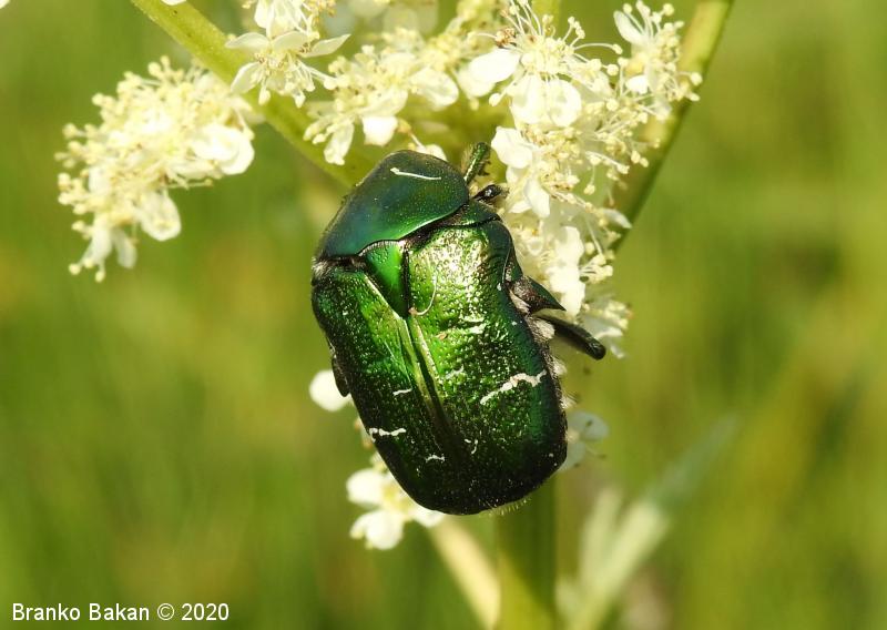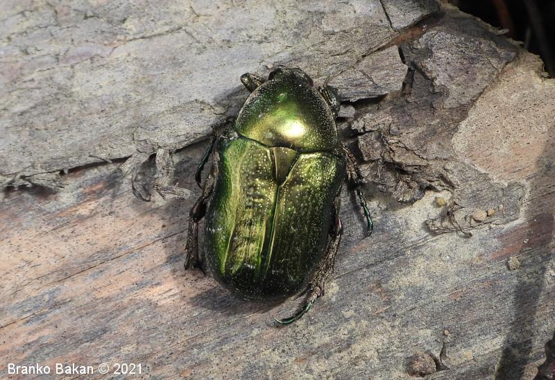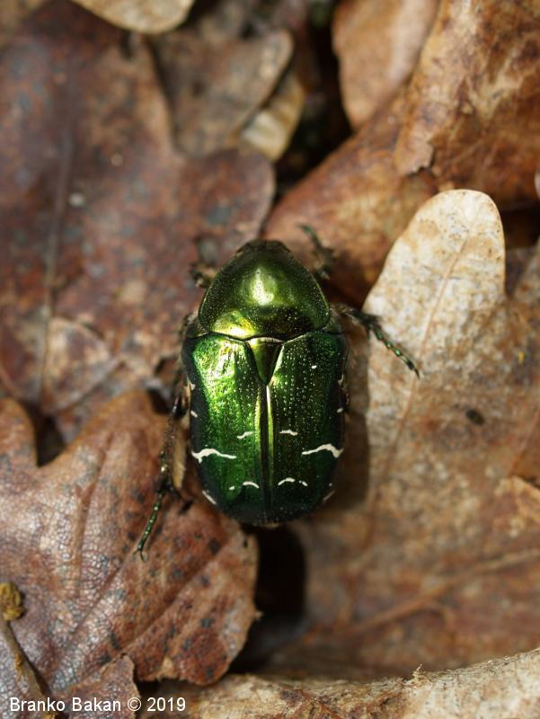 Odrasli osebki: telo je značilno kovinsko zlatozelene barve, bleščeče, precej čokato. Glava ozka, nekoliko podaljšana, s pahljačasto razraslimi tipalnicami. Oprsje nekoliko zaobljeno, posejano s številnimi drobnimi jamicami. Ščitek med pokrovkami podolgasto trikoten. Pokrovke precej široke, pod vrhom nekoliko zožene, drobno jamičaste, na njih se nahajajo neenakomerno velike prečne belkaste pasice in lise, včasih te tudi manjkajo. Ob robu pokrovk in oprsja potekajo številne ščetinaste dlake. Spodnja stran prav tako kovinsko bleščeča, zelena, bakrena ali vijoličasta.
