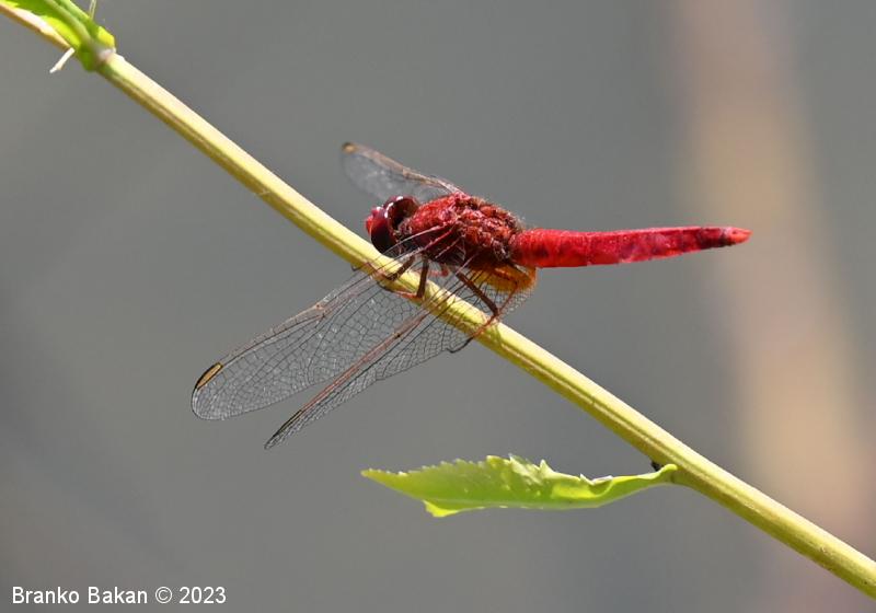 Samec: telo je enotno intenzivno rdeče barve. Krila dokaj velika, na bazi rumenkasta ali rjavkasta, sicer prosojna, zgornje žile tik ob robu rdeče obarvane. Pterostigma (obarvano žilno okence na krilih) je dokaj velika, svetlorjava do rumenkasta. Zadek se v sredini nekoliko razširi, s hrbtne strani je rahlo sploščen.