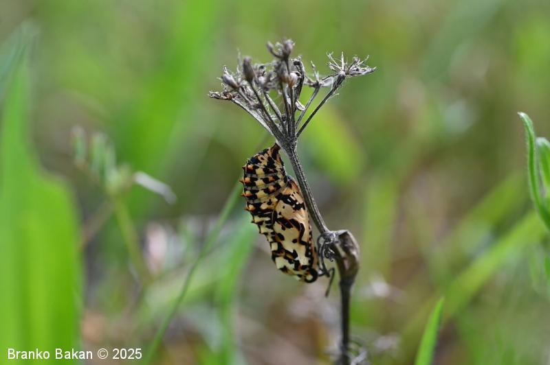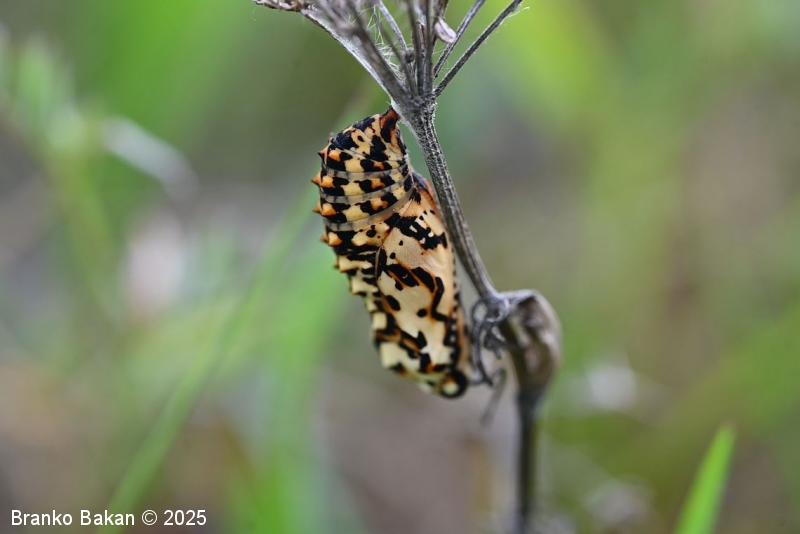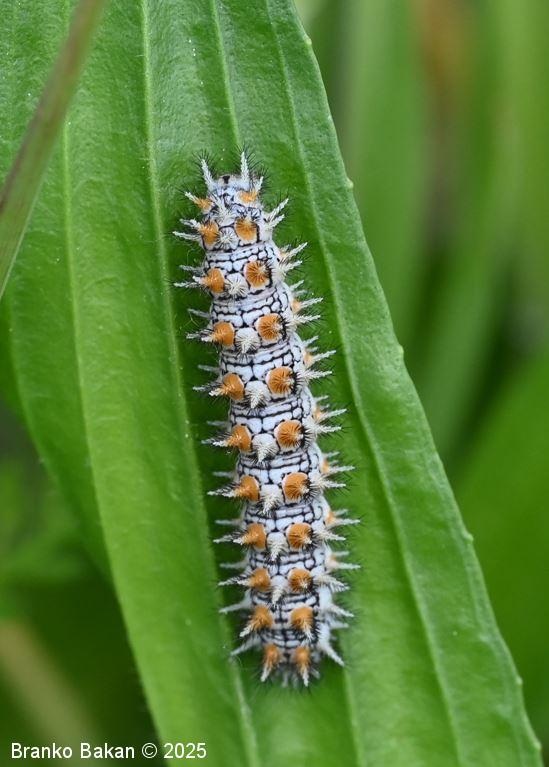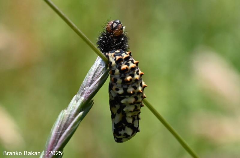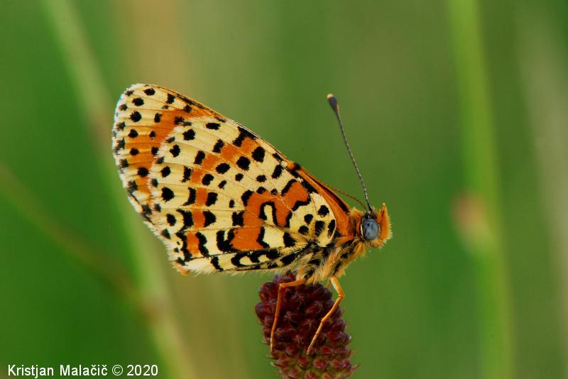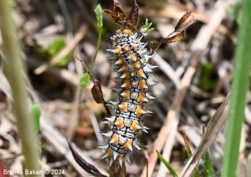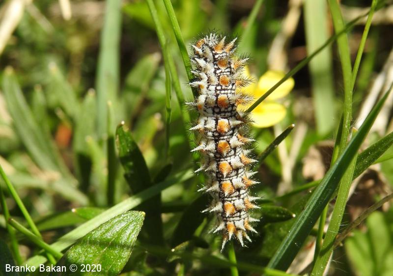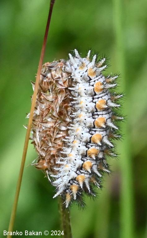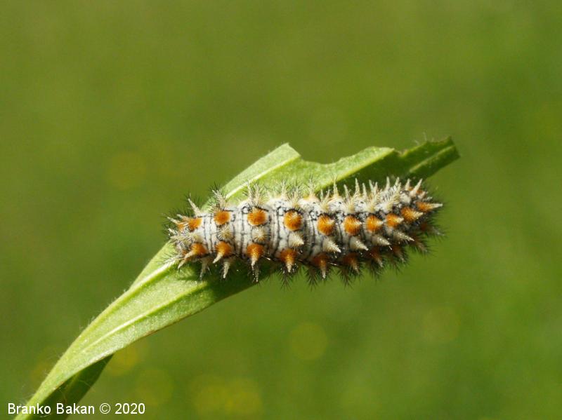 Obnašanje in razvoj: metulji se pojavljajo v dveh generacijah, prva leta od aprila do junija, druga pa od julija do septembra. Opazujemo jih lahko predvsem na cvetočih travnikih v sončnih in toplih dneh. Gosenice so bele, s črnimi vzdolžnimi in prečnimi linijami, vzdolž hrbta posejane z večjimi, na bazi oranžno obarvanimi bradavičastimi izrastki in porasle s črnimi ščetinami. Hranijo se predvsem z listi različnih trpotcev (Plantago spp.). Buba je viseča, bela s črnimi pikami in redkimi rumenimi lisami.