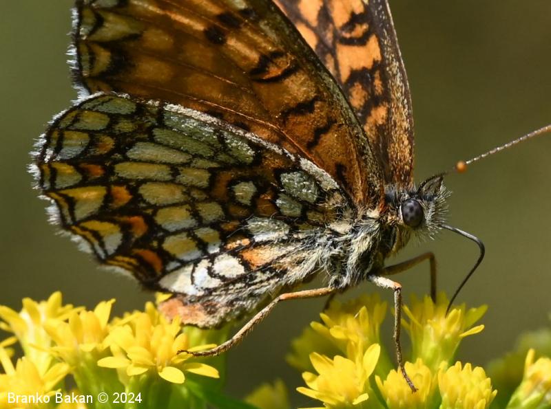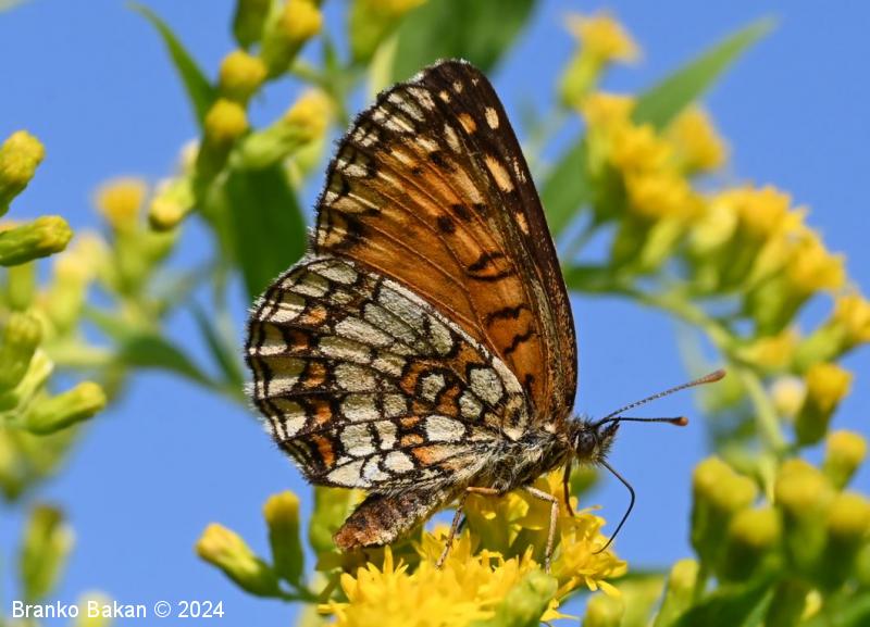 Odrasli osebki: zgornja stran kril z izrazitimi temnimi in oranžnimi pasovi, ki so bolj ali manj sklenjeni in v enakih odtenkih (pri samicah so lahko nekateri pasovi svetlejši, drugi temnejši). Osrednji del zadnjih kril je lahko večkrat nekoliko temnejši. Vse lise so brez pik. Spodnja stran zadnjih kril je belkasta, navadno z dvema oranžnima pasovoma, brez pik ob bazalnem delu. Zunanji rob kril je enako obarvan kot obrobni pas polmesečastih lis (pri podobnih vrstah je zunanji rob kril rumenkast ali vsaj nekoliko temnejši). Obarvanost je zelo variabilna!