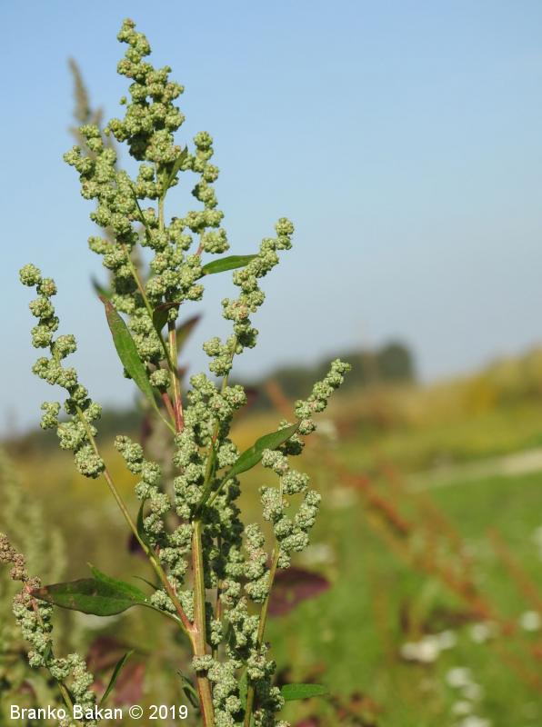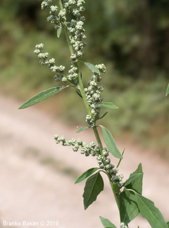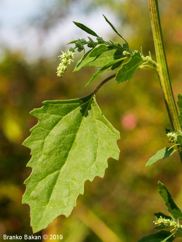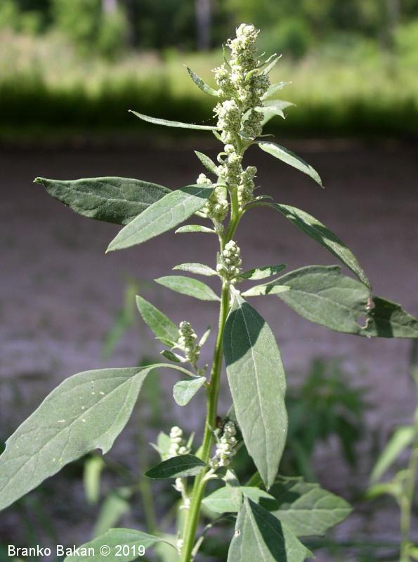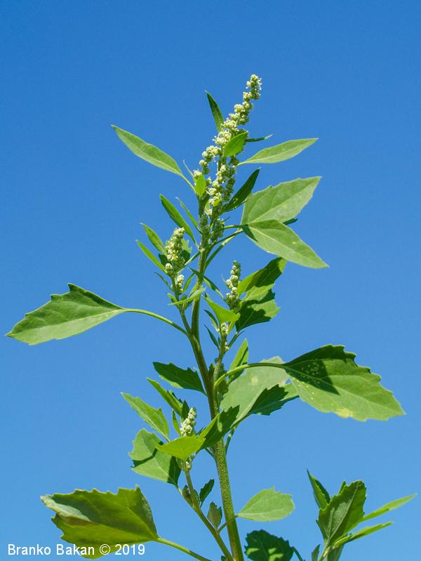 Opis: pokončna, močno razrasla enoletnica. Steblo togo, večinoma zeleno, redkeje rdečkasto nadahnjeno, izbrazdano (zeleno progasto), z belkastim poprhom. Listi dolgopecljati, podolgasti, trikotni ali rombasti, celorobi ali plitvo topo nazobčani do plitvo krpati, večinoma vsaj po spodnji strani močno belo poprhnjeni. Cvetovi zgoščeni v stranska klasasta socvetja, belo poprhnjeni, hlebčkasto sploščeni, 5-števni. Semena črna, okroglasta, bleščeča, do 1 mm velika.