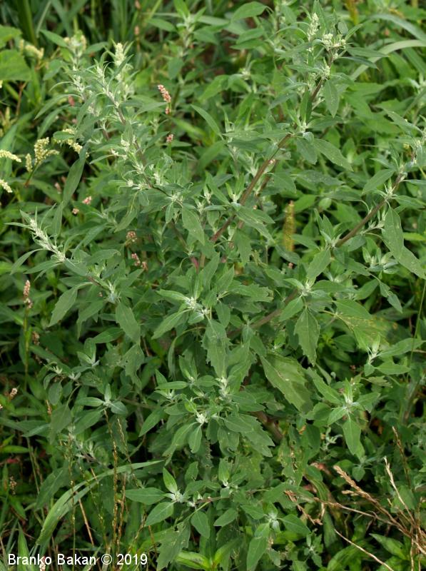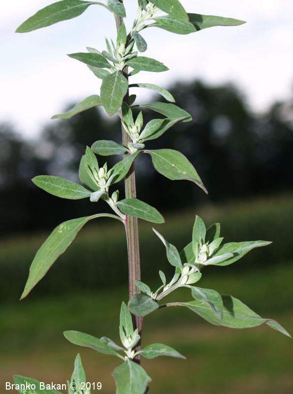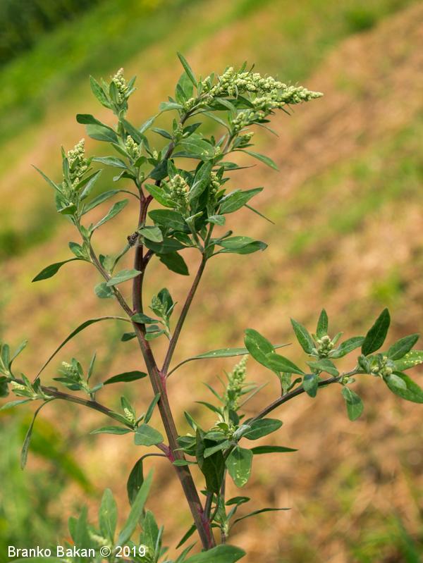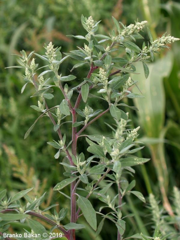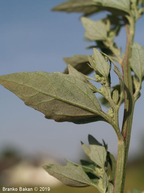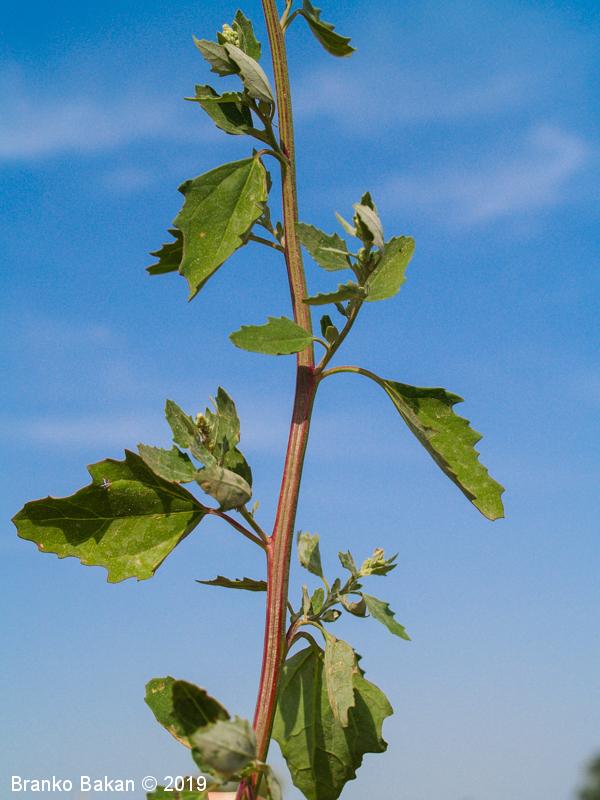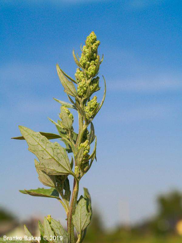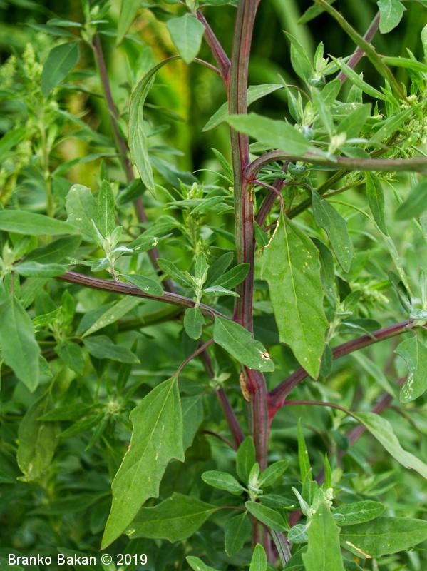 Opis: pokončna, močno razrasla enoletnica. Steblo krepko, večinoma rdeče izbrazdano do progasto, z belkastim poprhom. Listi dolgopecljati, podolgasti, trikotni ali trikotno rombasti, celorobi ali plitvo topo nazobčani v spodnji tretjini, pogosto rdečkasti, večinoma vsaj po spodnji strani močno belo poprhnjeni. Cvetovi zgoščeni v stranska klasasta socvetja, belo poprhnjeni, zeleni ali rdečkasti, hlebčkasto sploščeni, 5-števni. Semena črna, eliptična, bleščeča, do 1 mm velika.