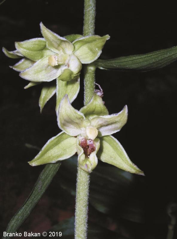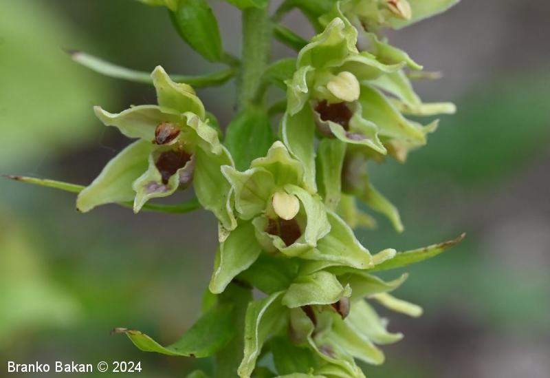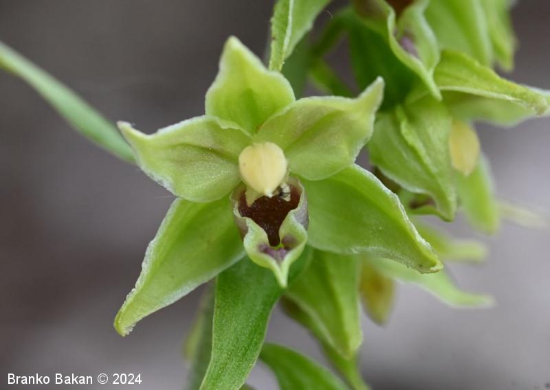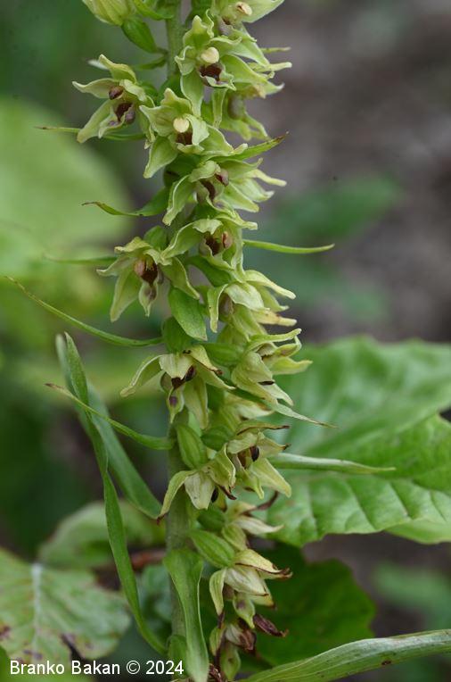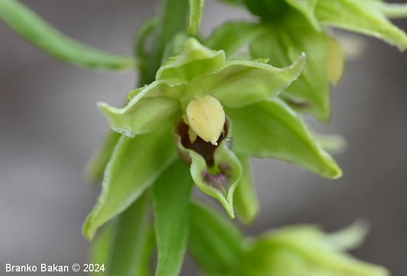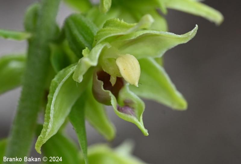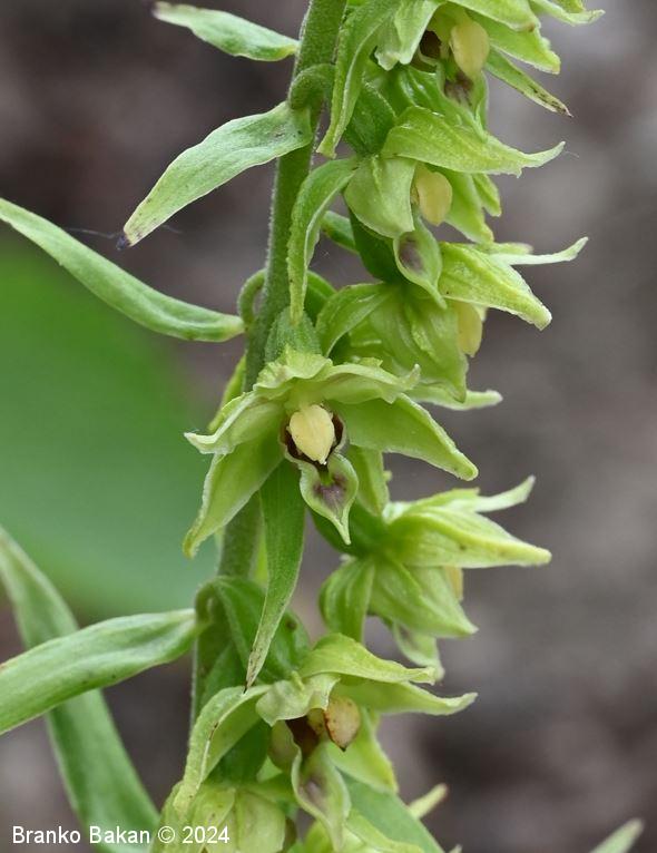 Opis: steblo je dokaj visoko, olistano skoraj do vrha, v cvetni regiji kratkodlakavo, zeleno. Stebelni listi so spiralasto razvrščeni, jajčasti do podolgasto suličasti, sedeči, delno objemajo steblo, plitvo žlebasti, štrleči do rahlo previsni. Socvetje je zgoščeno in precej razpotegnjeno, enostransko, grozdasto. Cvetovi so rahlo kimasti, rumenozeleni do zeleni. Medena ustna (spodnji, največji cvetni list) je predeljena v širok, čašast, z notranje strani bleščeče lisičjerjav zadnji reženj (hipohil) in v ozko jezičast do ozko trikoten, belkast ali rumenkast prednji reženj (epihil), prehod med obema režnjema je izrazito zožen. Ostroga ni razvita.