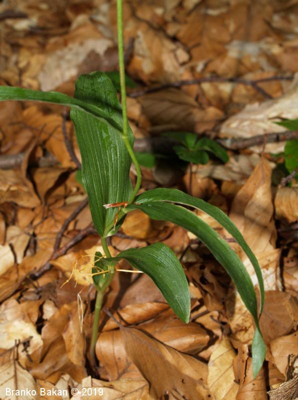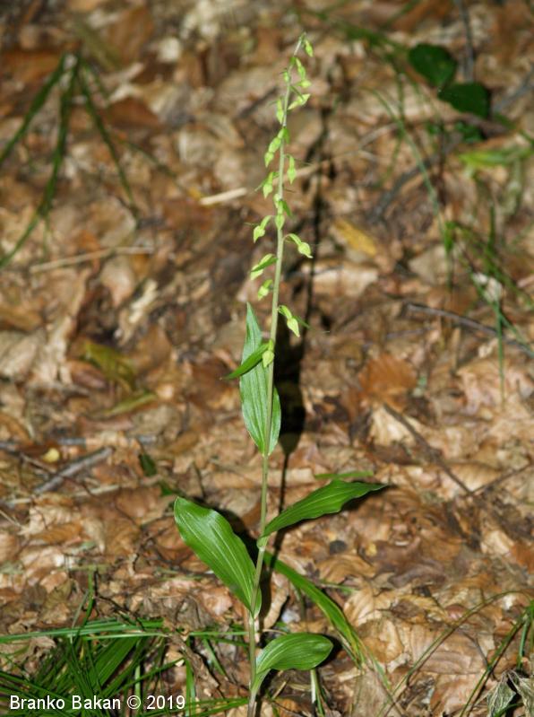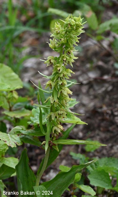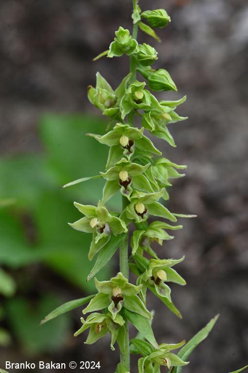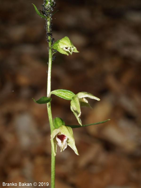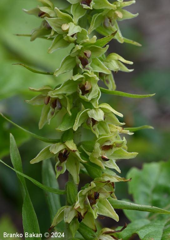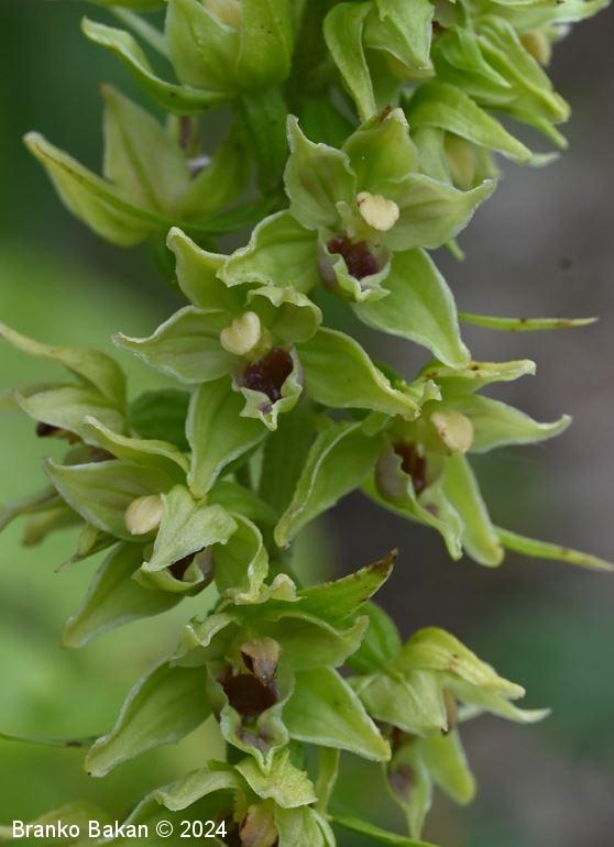 Opis: steblo je dokaj visoko, olistano skoraj do vrha, v cvetni regiji kratkodlakavo, zeleno. Stebelni listi so spiralasto razvrščeni, jajčasti do podolgasto suličasti, sedeči, delno objemajo steblo, plitvo žlebasti, štrleči do rahlo previsni. Socvetje je zgoščeno in precej razpotegnjeno, enostransko, grozdasto. Cvetovi so rahlo kimasti, rumenozeleni do zeleni. Medena ustna (spodnji, največji cvetni list) je predeljena v širok, čašast, z notranje strani bleščeče lisičjerjav zadnji reženj (hipohil) in v ozko jezičast do ozko trikoten, belkast ali rumenkast prednji reženj (epihil), prehod med obema režnjema je izrazito zožen. Ostroga ni razvita.