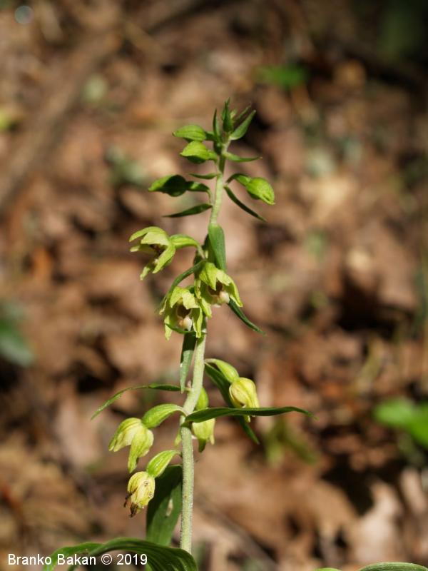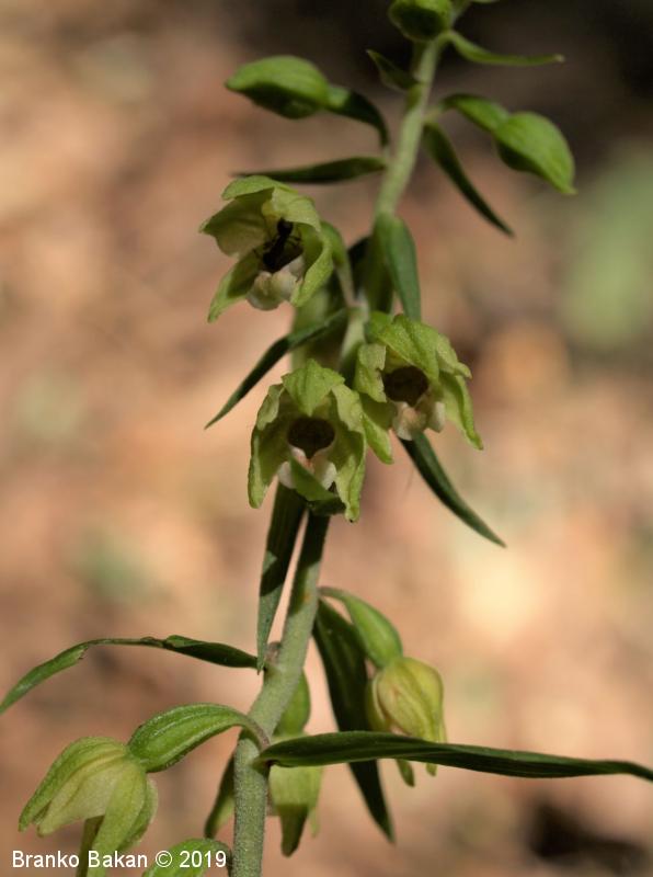 Opis: steblo olistano skoraj do vrha, v cvetni regiji kratkodlakavo, sicer golo. Listi spiralasto razvrščeni, ozko suličasti, sedeči, delno objemajo steblo, žlebasto žilnati, sredinski listi večji od najnižjih in najvišjih, spodnji list je majhen, vrčast upognjen. Socvetje je rahlocvetno, nekoliko podaljšano, enostransko grozdasto. Najnižji podporni listi so daljši od cvetov. Cvetovi rahlo kimasti, večinoma zeleni in belkasto obarvani. Medena ustna (spodnji, največji cvetni list) je predeljena v širok, čašast, z notranje strani olivnozelen do rjavkast zadnji reženj in v jezičast, navzdol upognjen, bel do bledozelen prednji reženj, ki ima na bazi zelenkasti grbici. Ostroga ni razvita.