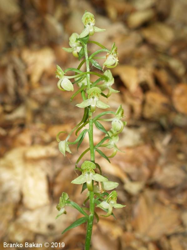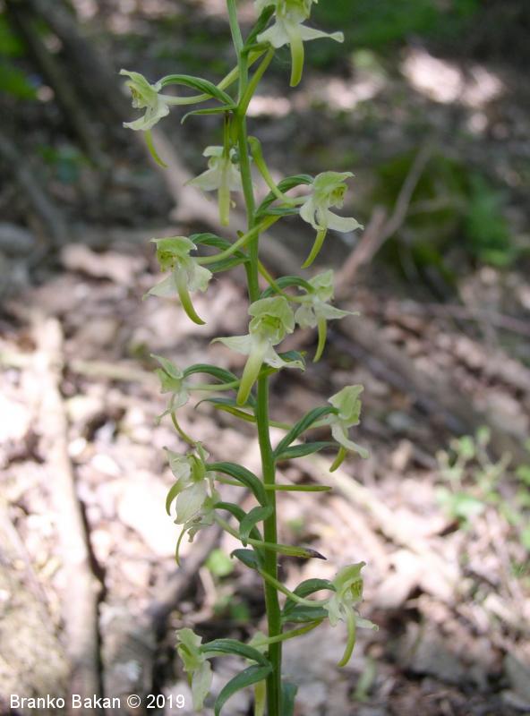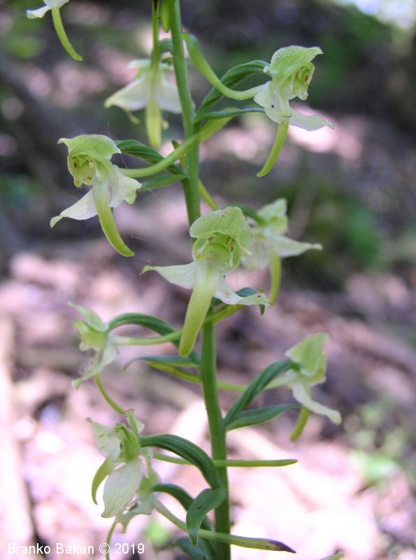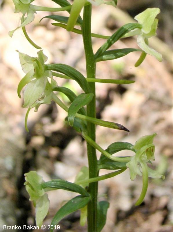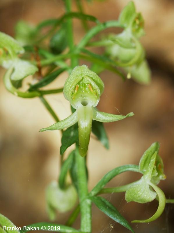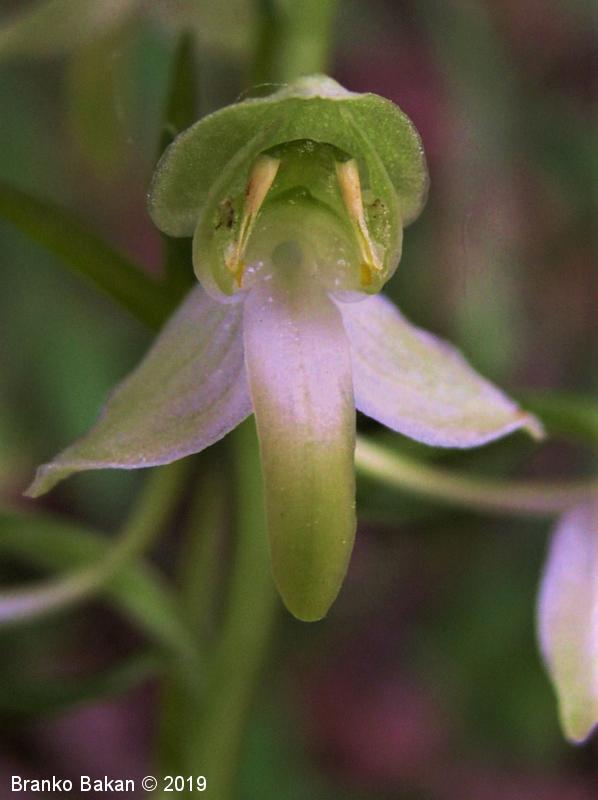 Opis: visoka trajnica z dvema, pritličnima listoma, ki sta podolgasto suličasta do jajčasta, zelena (brez peg). Steblo je poraslo z majhnimi, luskastimi listi. Socvetje podolgasto valjasto, grozdasto. Cvetovi večinoma zelenkasti. Zunanji trije cvetni listi jajčasti, štrleči, notranja cvetna lista navzgor štrleča, nagnjena drug k drugemu (tvorita neke vrste čelado), manjša od zunanjih listov. Medena ustna (spodnji cvetni list) je ozka, zelo dolga, zelenkasto obarvana, usločena. Ostroga (cevasto podaljšan del medene ustne) je zelo tanka in dolga (mnogo daljša od plodnice), na koncu razširjena, zelenkasta. Pelodna paketka (polinarija) štrlita vstran drug od drugega.