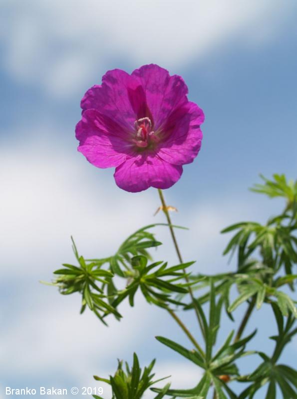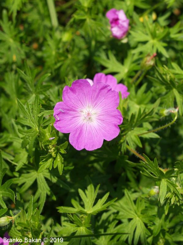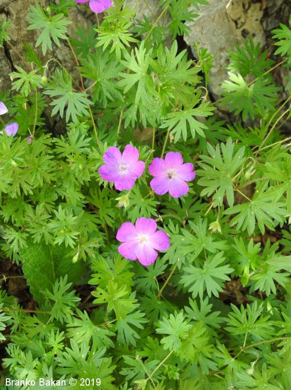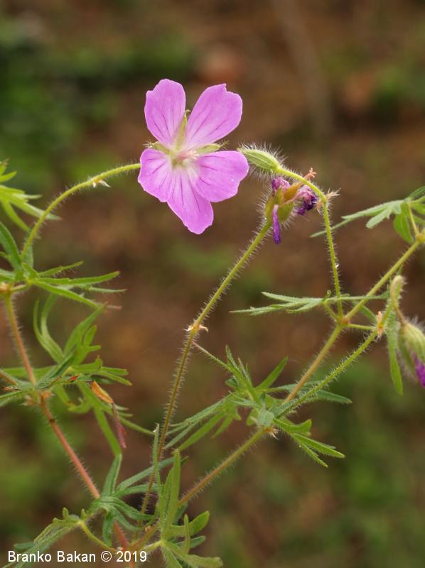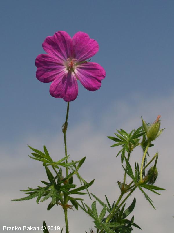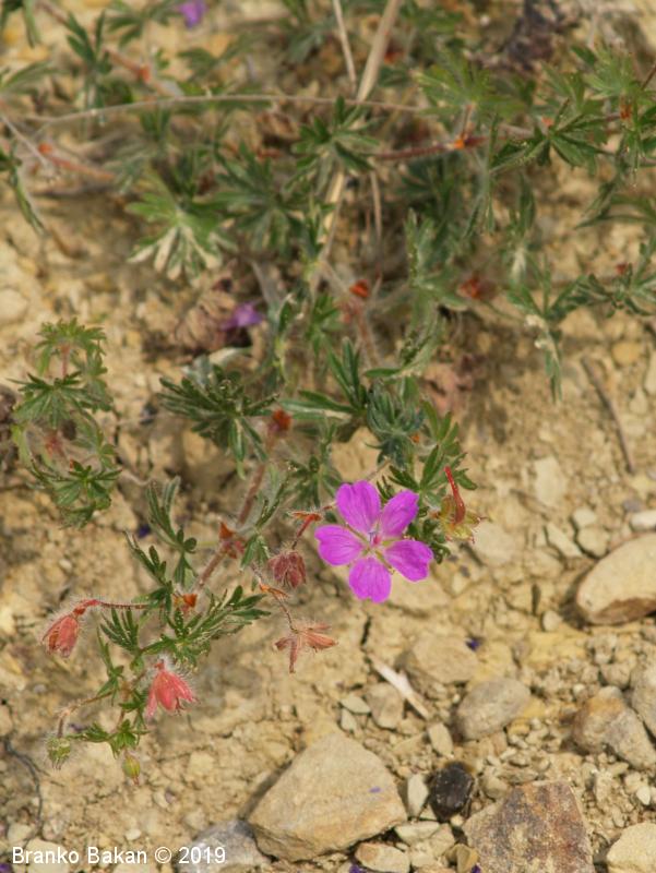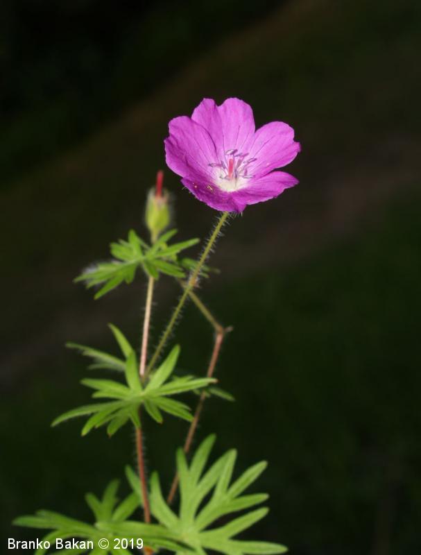 Opis: pokončna trajnica z razraslo koreniko. Steblo dokaj razraslo, v spodnjem delu golo, v zgornjem delu poraslo z laski. Listi dolgopecljati, nasprotno razvrščeni, skoraj do sredine dlanasto deljeni v ozke, celorobe segmente, ki so pri vrhu nacepljeni v 2 do 3 roglje. Cvetovi posamični, na dolgih, štrlečedlakavih pecljih, 5-števni, škrlatnordeči ali rožnati. Venčni listi do 15 mm veliki, v obrisu navadno srčasti, redkeje z zaokroženim vrhom, izrazito žilnati. Čašni listi šilasti, koničasti, mnogo manjši od venčnih listov. Prašnice so škrlatne. Plod kljunasto podaljšan, ob zrelosti se razpre od spodaj navzgor in razpade na 5 plodičev.