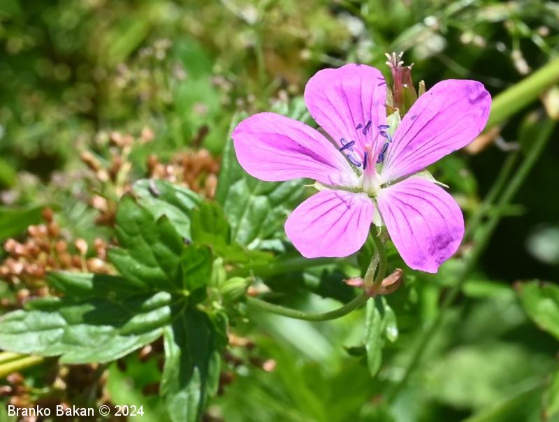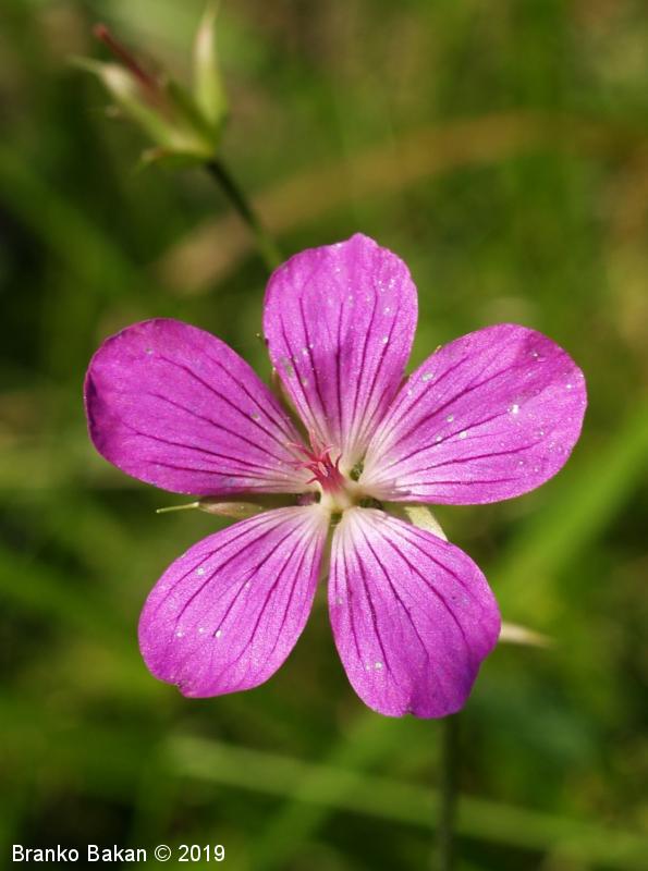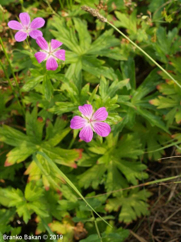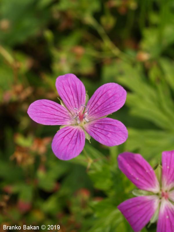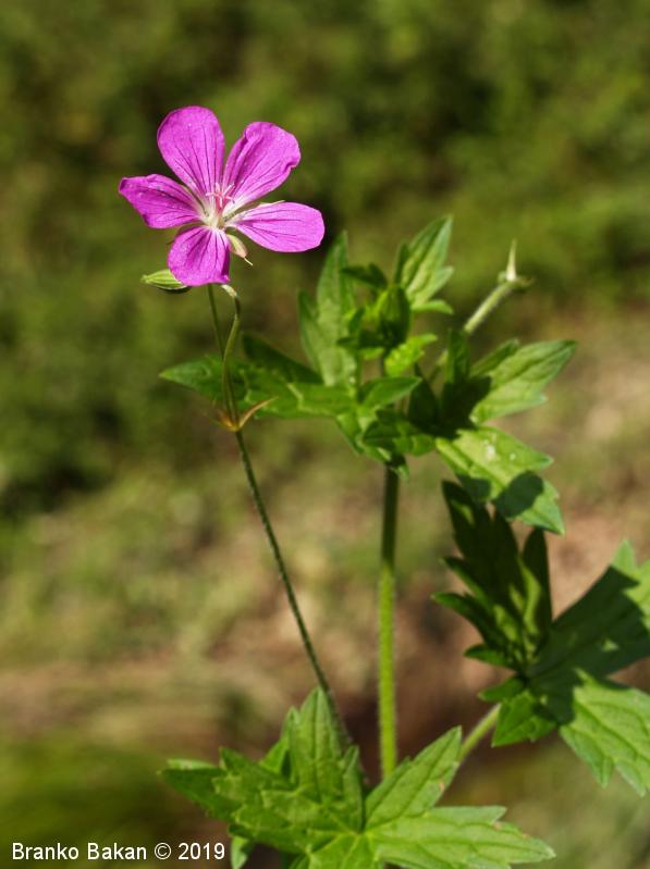Opis: pokončna trajnica z močno koreniko. Steblo v prerezu okroglo, štrlečedlakavo, v zgornjem delu pogosto razvejano. Pritlični listi so dolgopecljati, izraščajo v šopih, nekako čez 2/3 dlanasto deljeni v široke, nacepljene segmente. Stebelni listi so sedeči, prav tako deljeni v nacepljene segmente. Cvetovi navadno po 2 skupaj, na dolgih, štrlečedlakavih pecljih, 5-števni, škrlatnordeči. Venčni listi do 13 mm veliki, klinasti z zaokroženim vrhom, izrazito žilnati. Čašni listi jajčasti, koničasti, mnogo manjši od venčnih listov. Prašnice so svetlo vijoličaste. Plod kljunasto podaljšan, ob zrelosti se razpre od spodaj navzgor in razpade na 5 plodičev.
