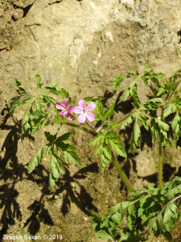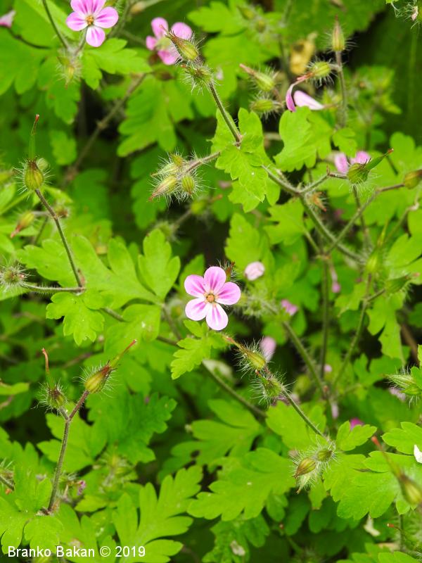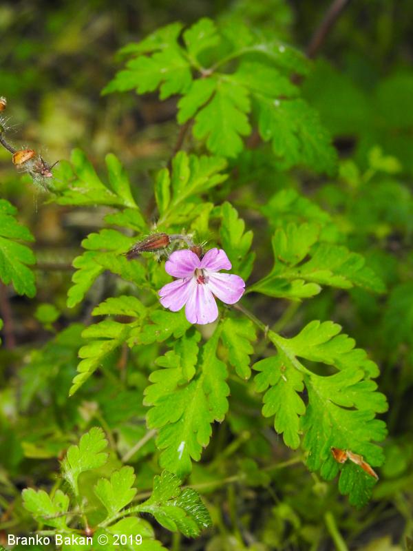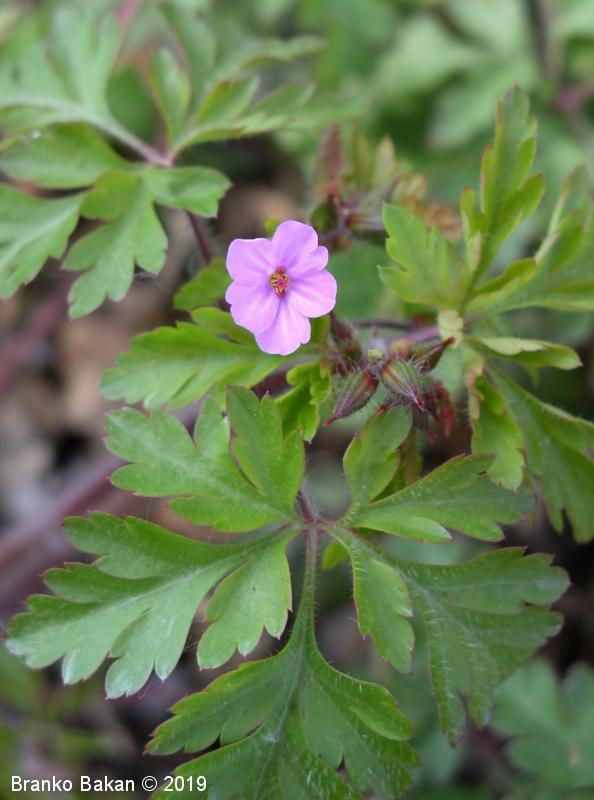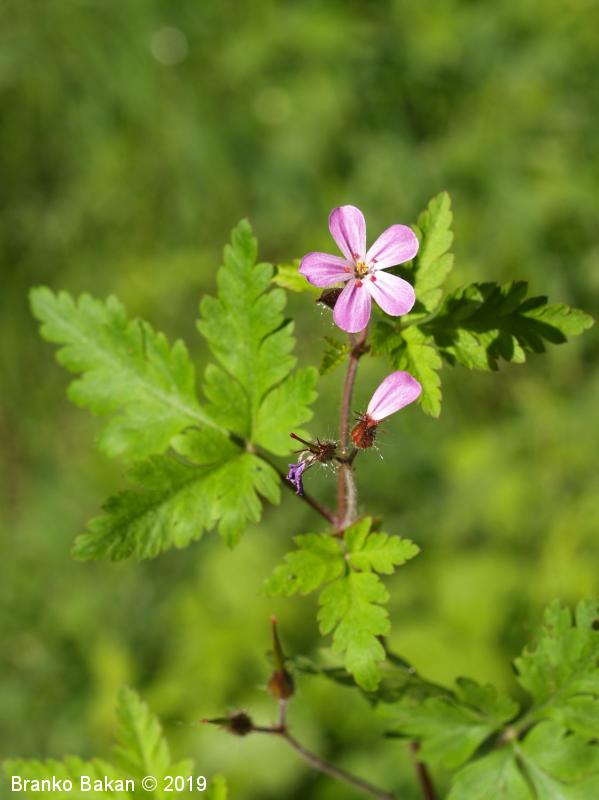 Opis: močno razrasla enoletnica ali dvoletnica z izrazitim, neprijetnim vonjem. Steblo okroglo, krhko, štrlečedlakavo, pogosto rdečkasto. Listi nasprotno razvrščeni, navidezno pernato 3- do 5-krat deljeni v pecljate, nacepljene segmente, raztreseno štrlečedlakavi. Cvetovi navadno po 2 skupaj, na dolgih, štrlečedlakavih pecljih, 9-12 mm veliki, škrlatnordeči ali rožnati. Venčni listi jajčasti, pri dnu klinasto zoženi, na vrhu zaokroženi, razločno žilnati, do 1.5-krat daljši od čašnih listov. Čašni listi jajčasti, koničasto podaljšani, dlakavi. Prašnice oranžne. Plod je kljunasto podaljšan, okrog 1.5-2.5 cm velik, ob zrelosti se razpre od spodaj navzgor in razpade na 5 plodičev.