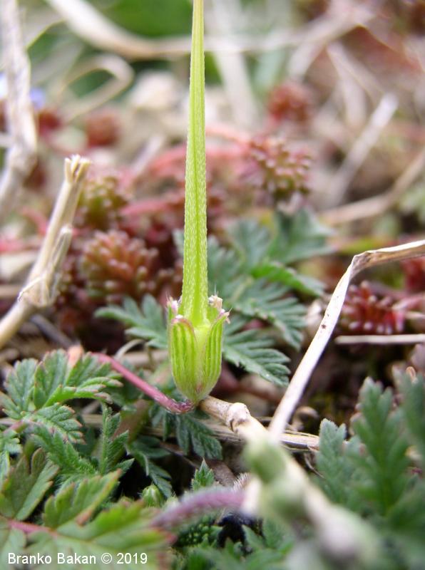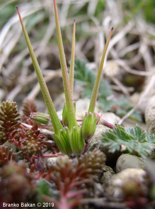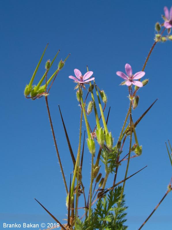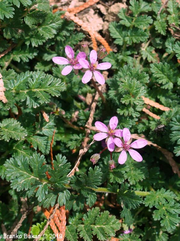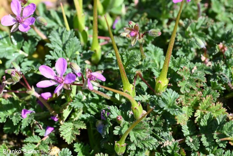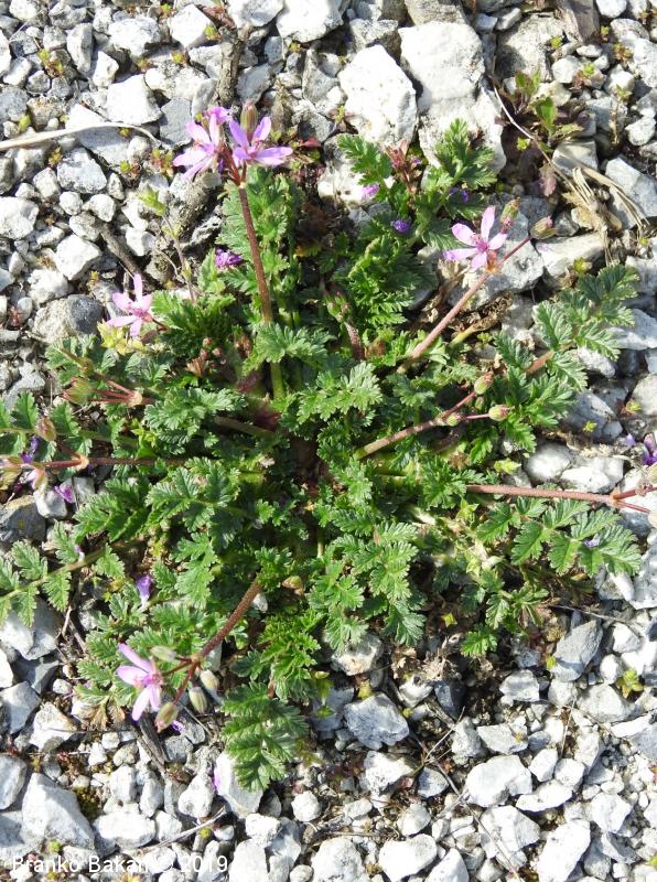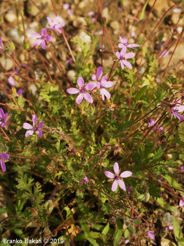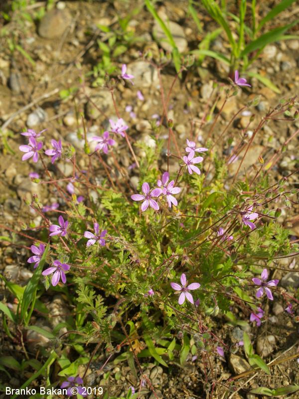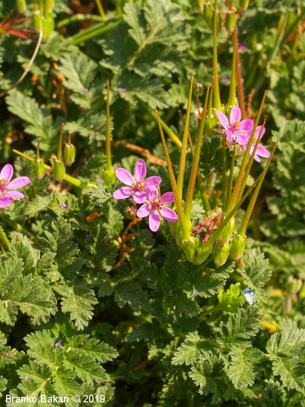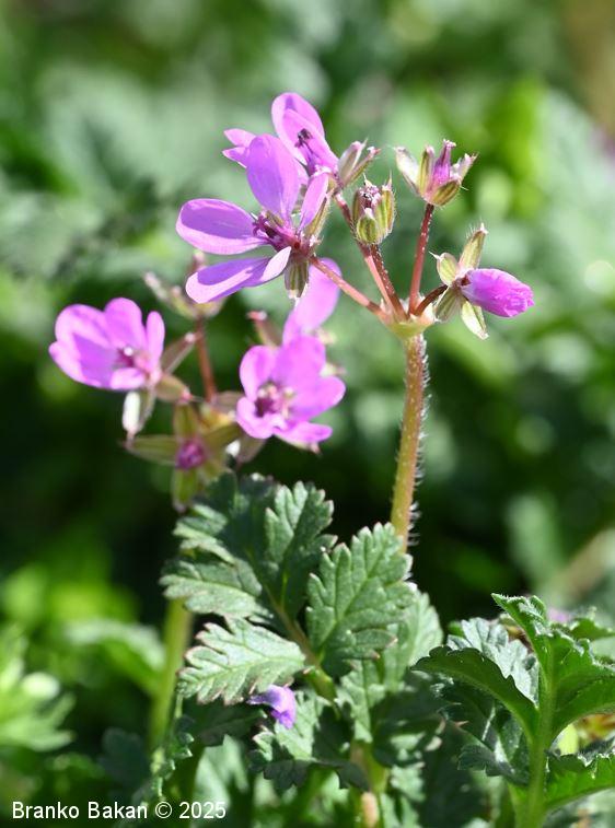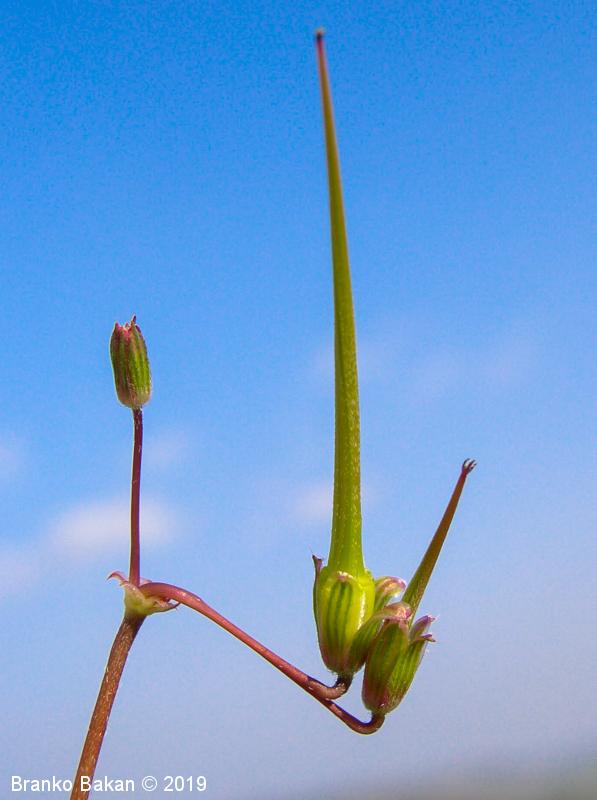 Opis: polegla ali pokončna, rozetasto razrasla eno- ali dvoletnica. Steblo je okroglo, štrlečedlakavo, lomljivo, velikokrat rdečkasto obarvano. Listi so paroma nasprotni, 3- do 4-krat pernato sestavljeni, podolgovati, štrlečedlakavi, listni segmenti so med seboj razmaknjeni. Cvetovi so združeni v ovršna, kobulasta, 2- do 8-cvetna socvetja, na dolgih, štrlečedlakavih pecljih, okrog 1.5 do 2 cm veliki, rožnati ali modrovijoličasti. Venčni listi so jajčasti, proti dnu klinasto zoženi, na vrhu zaokroženi, vidno žilnati. Plod je kljunasto podaljšan, 3 do 4 cm dolg, pokončno štrleč, raven, koničast, ob zrelosti se razpre od spodaj navzgor in razpade na 5 plodičev.
