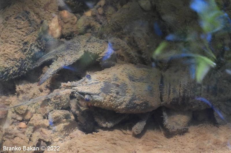 Odrasli osebki: telo je večinoma rjavo, lahko je tudi zelo temno, skoraj črno ali celo modrikasto. Prsni koš je večinoma fino bradavičast, vendar dokaj gladek. Koš je deljen v obglavni del, ki je trapezasto podaljšan v t.i. rostrum (greben na rostrumu je porasel s trni, zato je na otip žagast), ki štrli čez oči in v širok koš, ki je prav tako povečini gladek. Vratna brazda (šiv med naglavnim in zadnjim delom koša) je precej svetla, zaokrožena, trnata. Škarje (grabilni par okončin) so na otip hrapave (grobozrnate), podolgaste, rdečkasto obarvane, še posebej med sklepi. Zadek (rep) je členast, konča se s širokimi, pahljačasto nameščenimi segmenti, navadno je spodvihan pod telo.