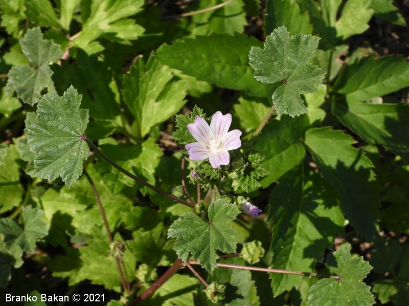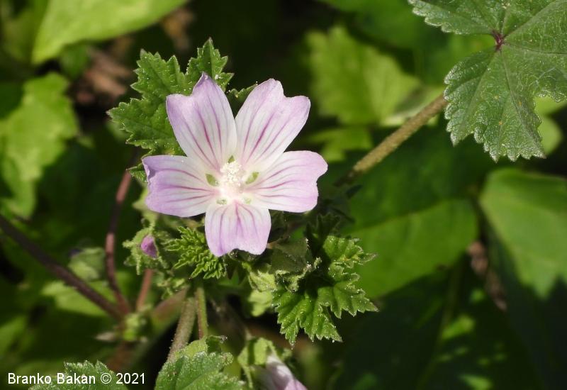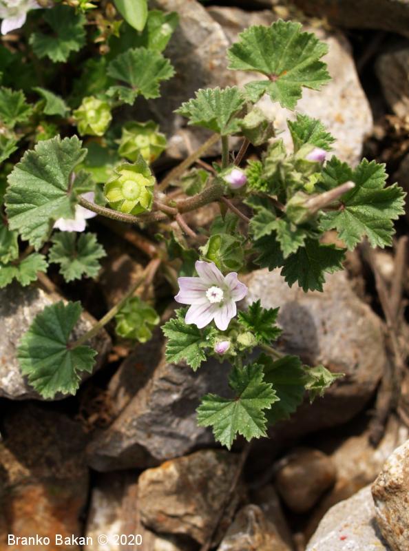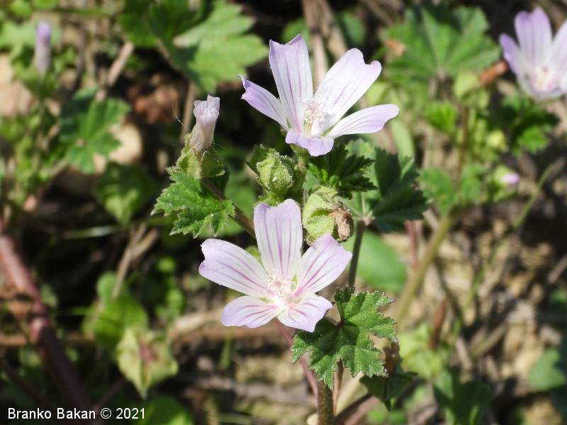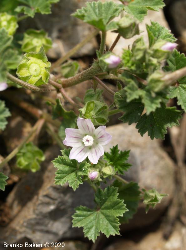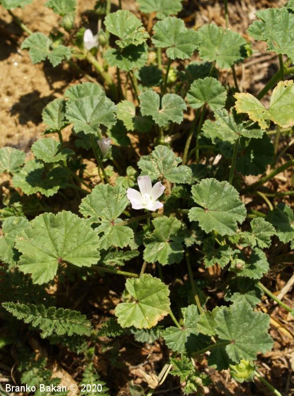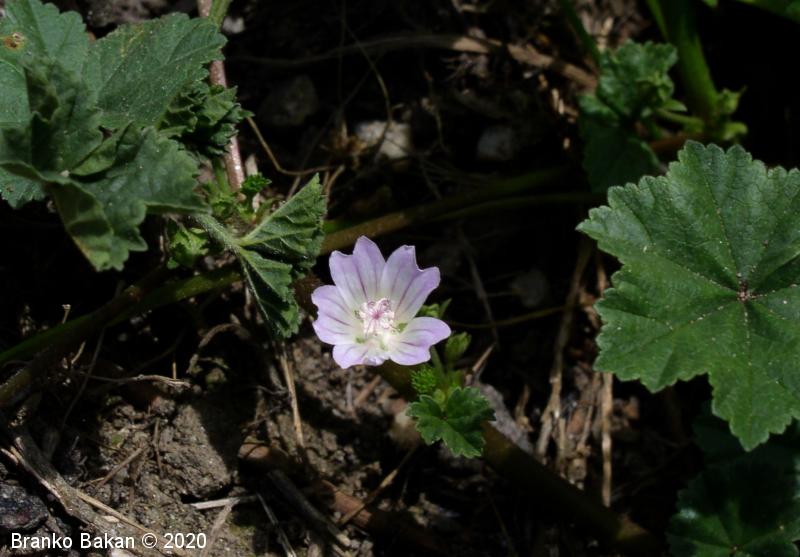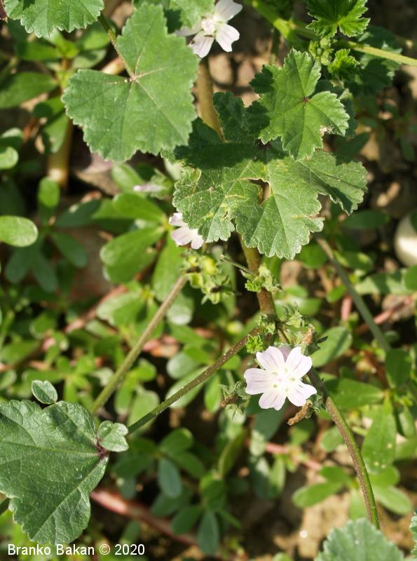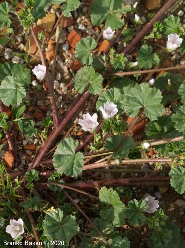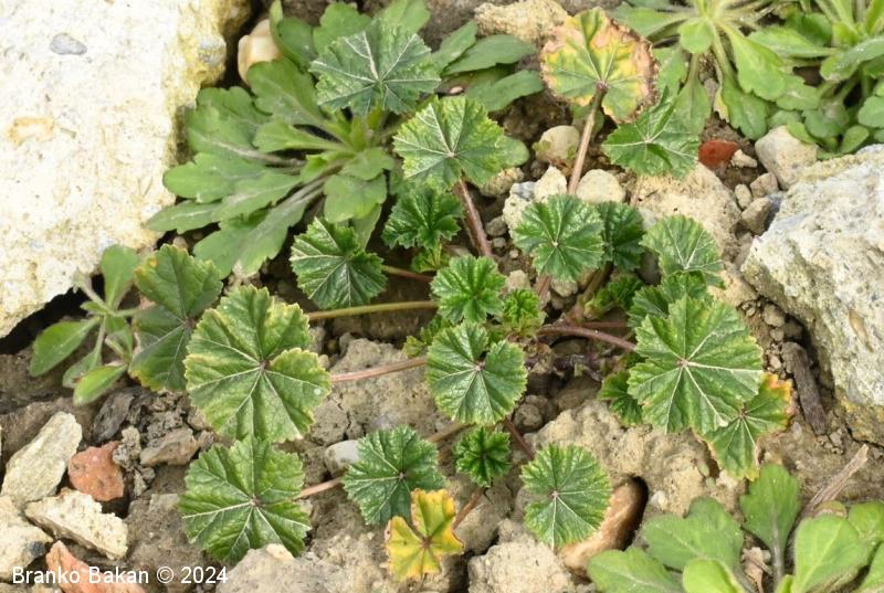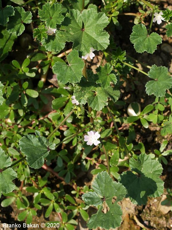 Opis: plazeča do kipeča enoletnice ali dvoletnica s tanko korenino. Steblo okroglo, togo, raztreseno štrlečedlakavo. Listi izrazito dolgopecljati (pri dnu s parom drobnih prilistov), premenjalno razvrščeni, dlanasto krpati, po robu nazobčani. Cvetovi nežno rožnati do skoraj beli, po dva ali več skupaj v zalistnih socvetjih, okrog 15 mm veliki. Venčni listi na vrhu izrobljeni, zelo nežni, izrazito ožiljeni. Prašniki številni, med seboj zrasli v prašnično cev. Čaša dvojna, sestavljena iz treh zunanjih, manjših, ozkočrtalastih lističev in petih večjih, skoraj trikotnih lističev, ki so porasli z enostavnimi laski. Plodiči razporejeni v krogu, kratko ščetinasti, gladki.