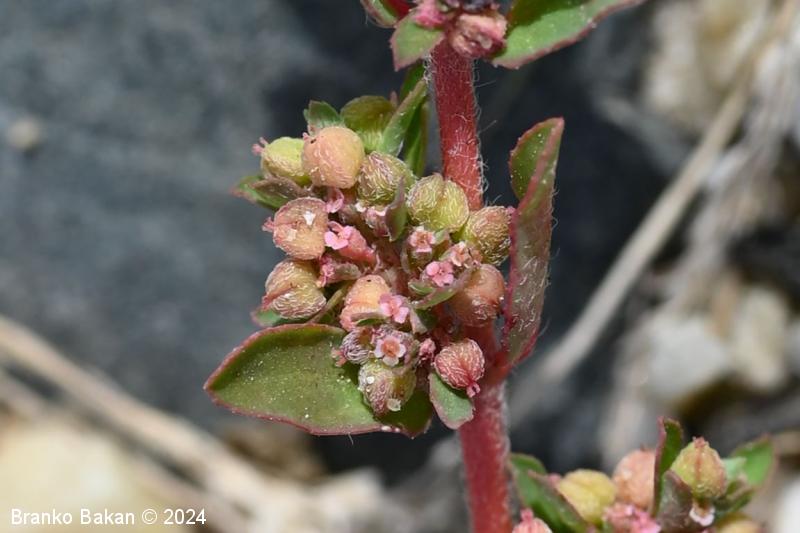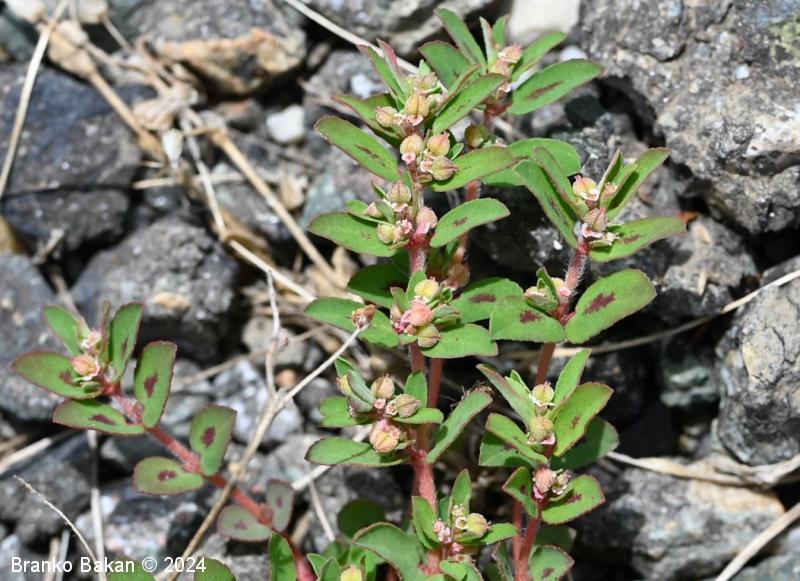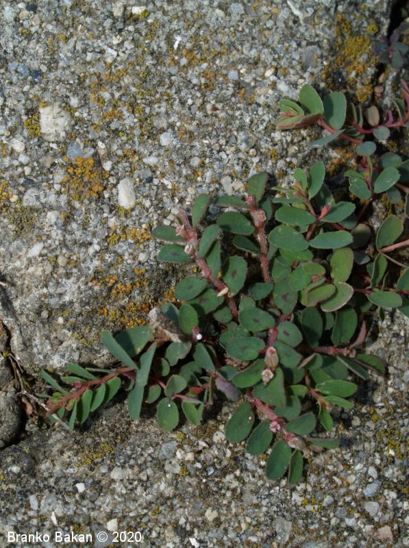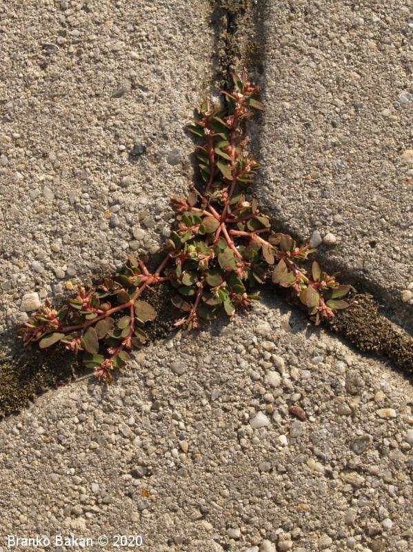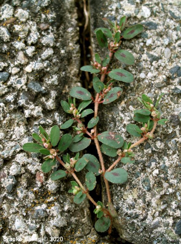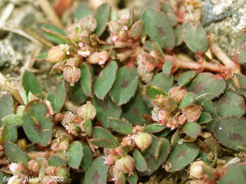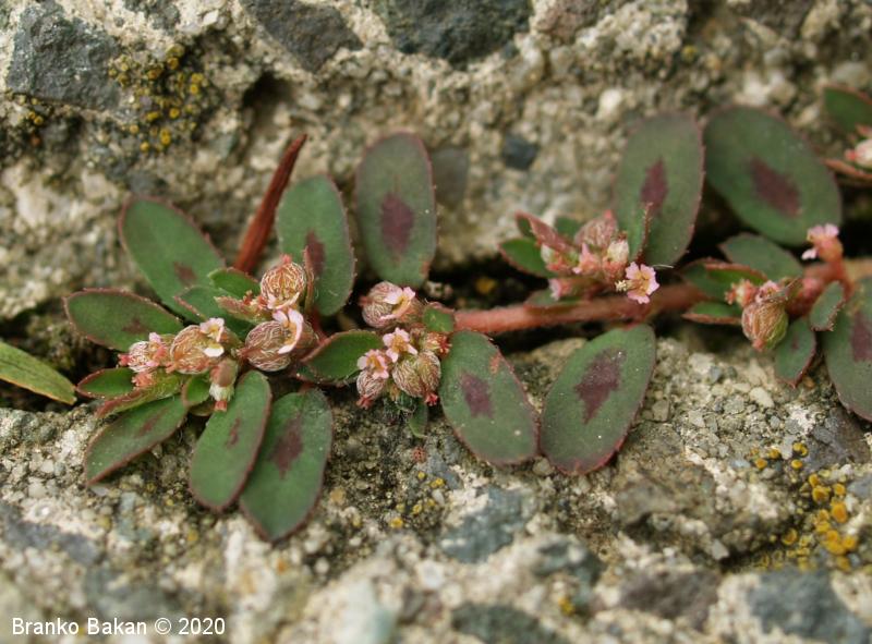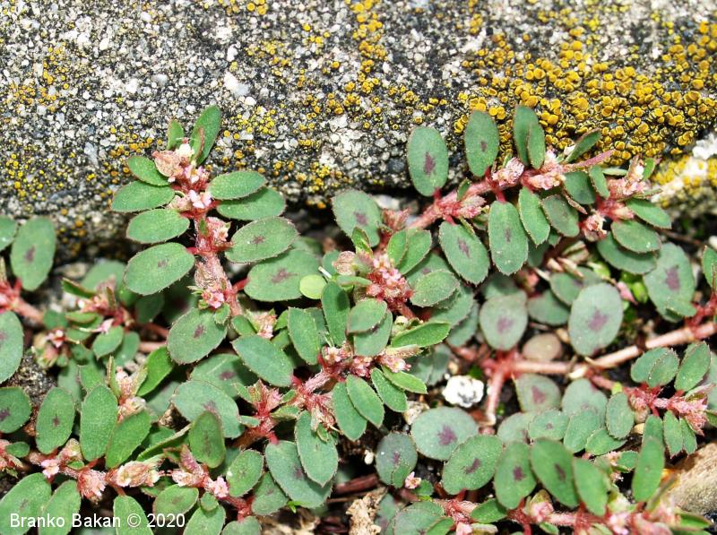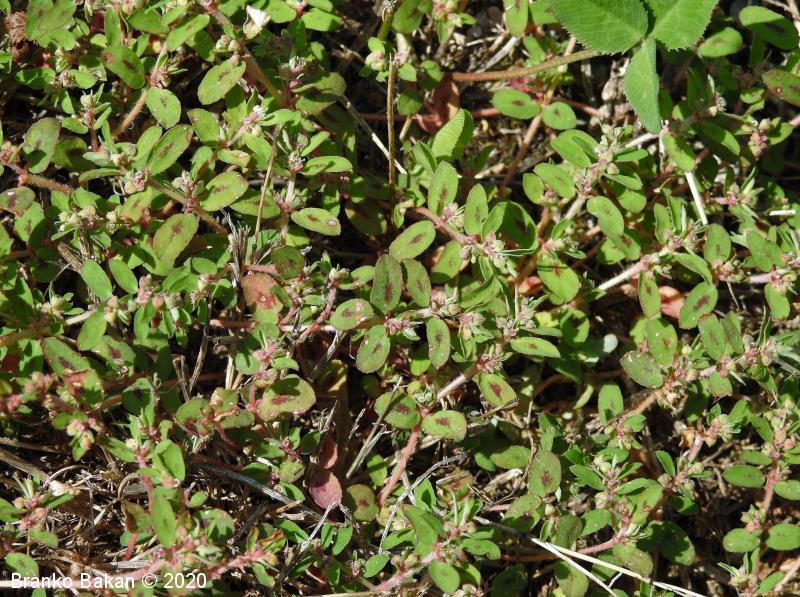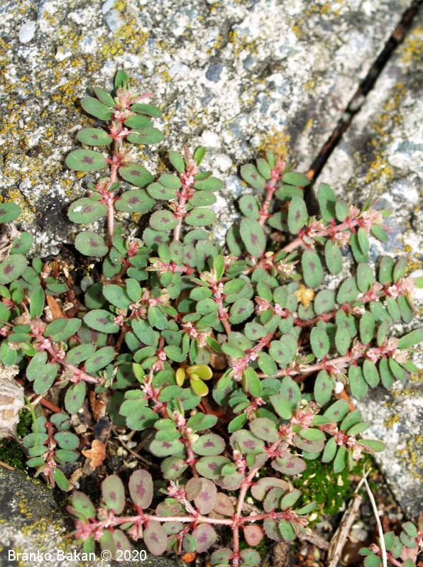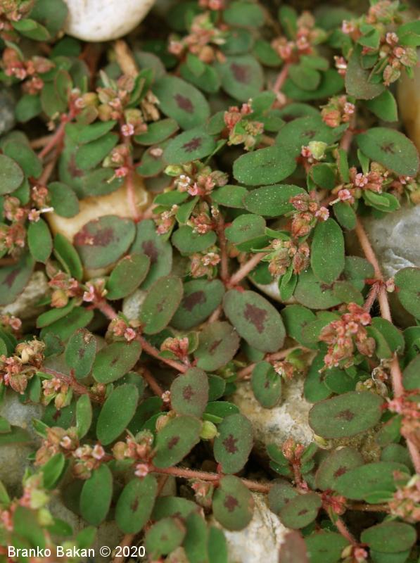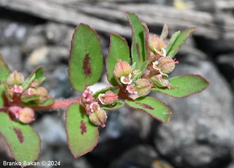 Opis: plazeča, rozetasto razrasla enoletnica. Steblo je rdečkasto, okroglo, gosto dlakavo, vsebuje bel mleček. Listi so eliptični do podolgasto jajčasti, nasprotno razvrščeni, pri dnu nekoliko asimetrični, z razločno temno (rdečkasto) liso, po robu topo nazobčani, zaokroženi do kratko koničasti. Na bazi peclja so razviti drobni prilisti. Cvetovi so združeni v zalistne, posamične ciatije (posebna oblika socvetja). Zrel plod (glavica) je prileglo dolgodlakav, večinoma rdečkast, pecljat.