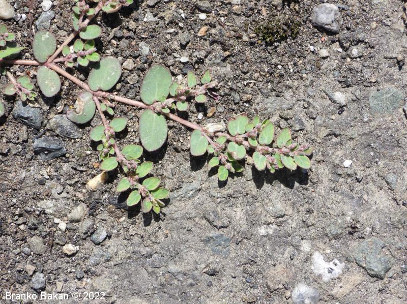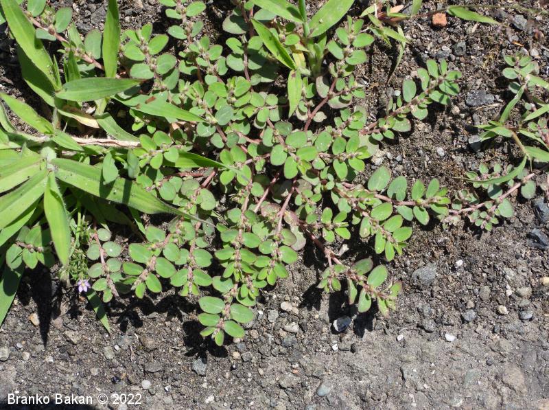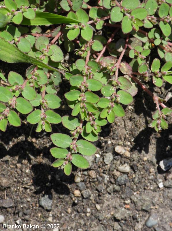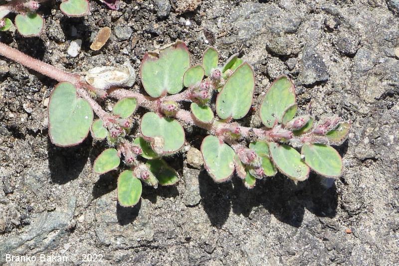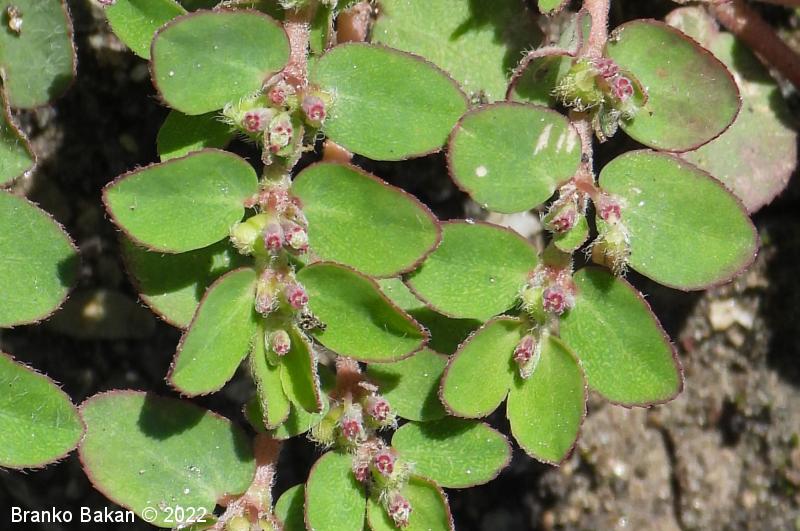 Opis: plazeča, polegla, rozetasto razrasla enoletnica. Steblo je rdečkasto, gosto olistano, gosto (kodrasto) kratkodlakavo (tudi listni in cvetni peclji so dlakavi), vsebuje bel mleček. Listi so eliptični do podolgasto jajčasti, nasprotno razvrščeni, kratkopecljati, skoraj simetrični, po robovih resasto dlakavi, celorobi ali fino drobno nazobčani, na vrhu zaokroženi do kratko koničasti, rdečkasto obrobljeni, brez osrednje pege. Na bazi peclja so razviti drobni trikotni prilisti, ki so med seboj paroma zrasli. Cvetovi so združeni v zalistne in ovršne ciatije (posebna oblika socvetja). Zrel plod (glavica) je štrlečedlakav le po šivih, sicer je gol, gladek, pecljat.