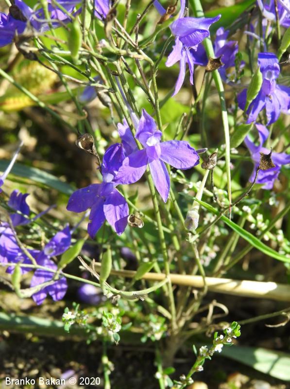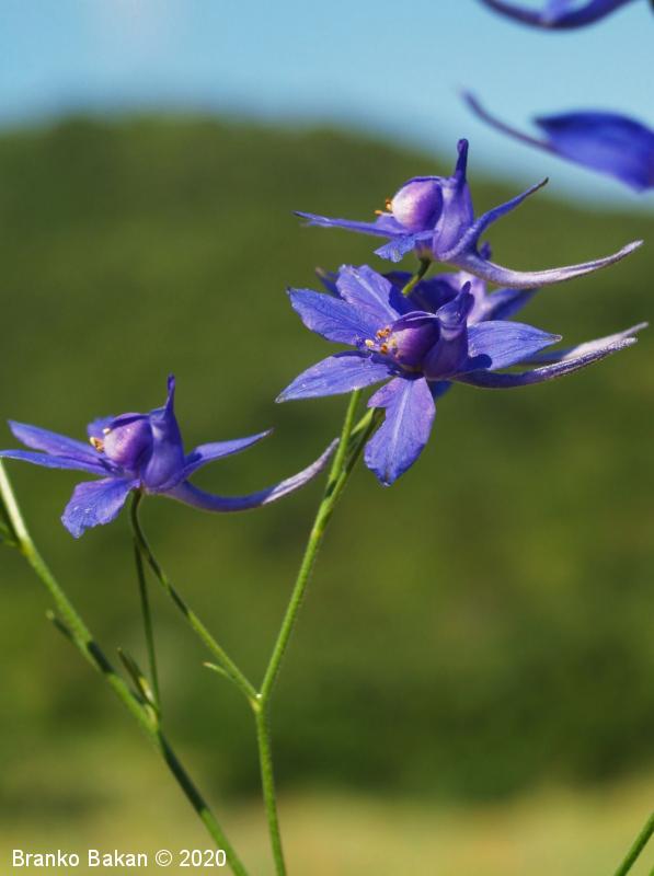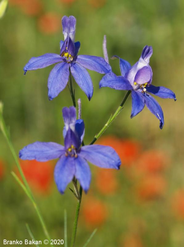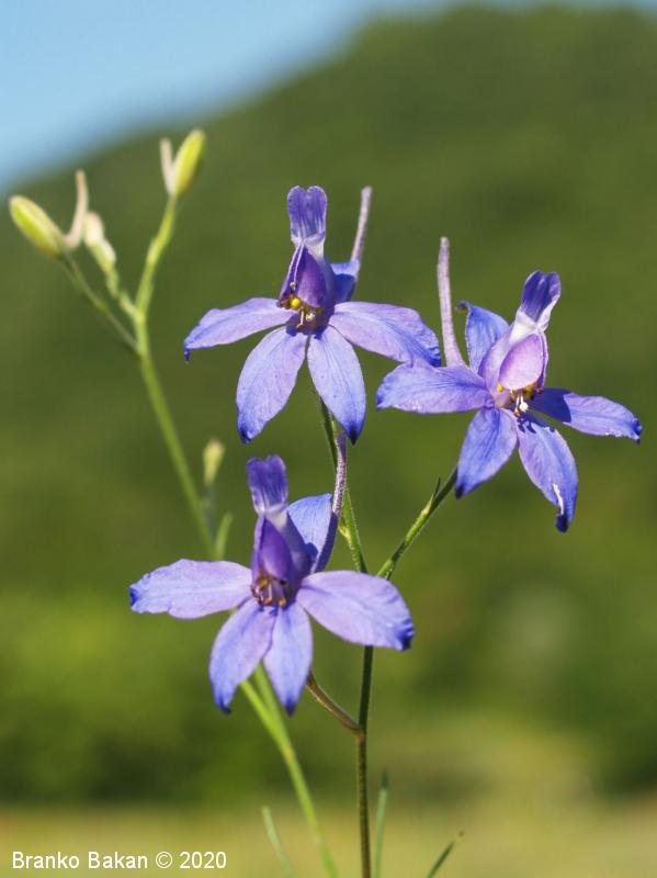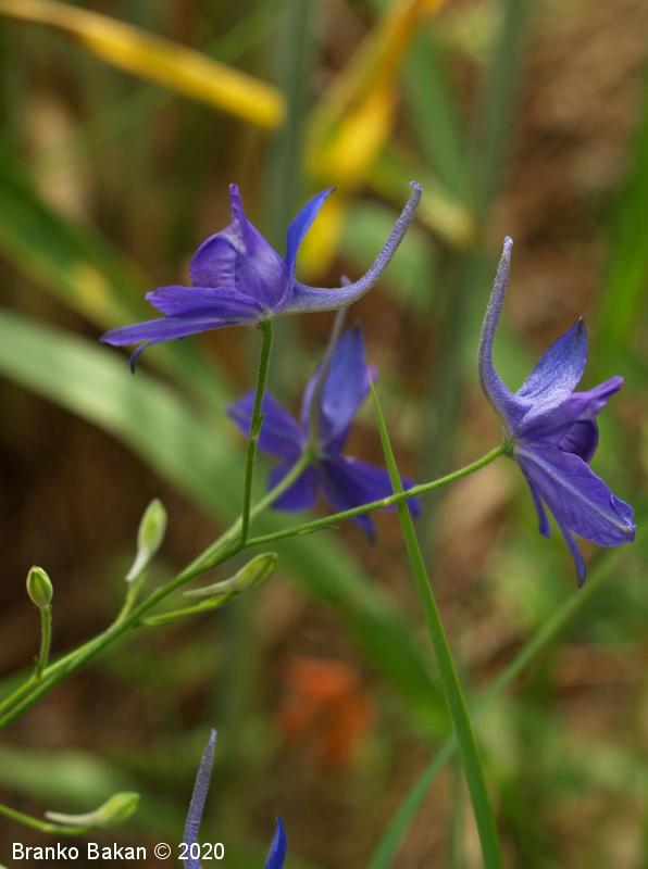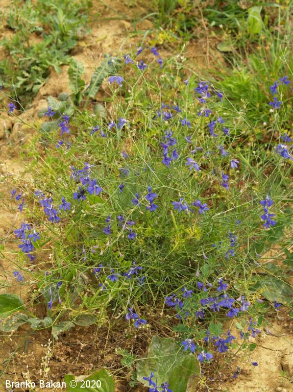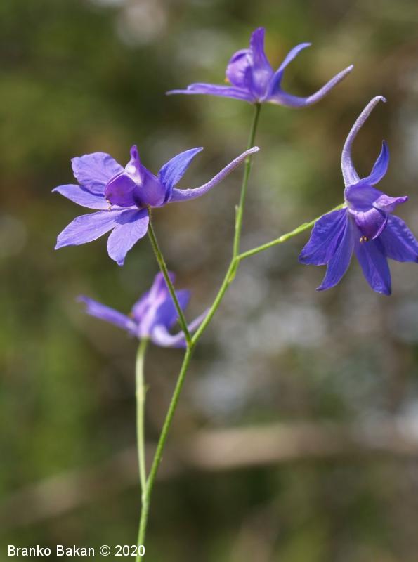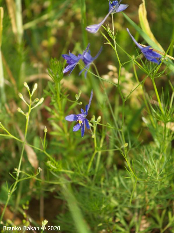 Opis: pokončna, enostavna ali v zgornjem delu razrasla enoletnica. Listi so dlanasto deljeni v ozke roglje, sedeči, premenjalno razvrščeni. Cvetovi so nad 1 cm veliki, somerni, z 1.5 cm dolgo, koničasto ostrogo, svetlomodri ali modrovijoličasti, pecljati, razvrščeni v malocvetno, latasto razraslo socvetje. Spodnji podporni listi cvetov celi, zgornji podporni listi deljeni v 2-4 ozke roglje, mnogo krajši od cvetov. Plod je podolgovat mešiček, na vrhu zožen v konico, semena so črna.