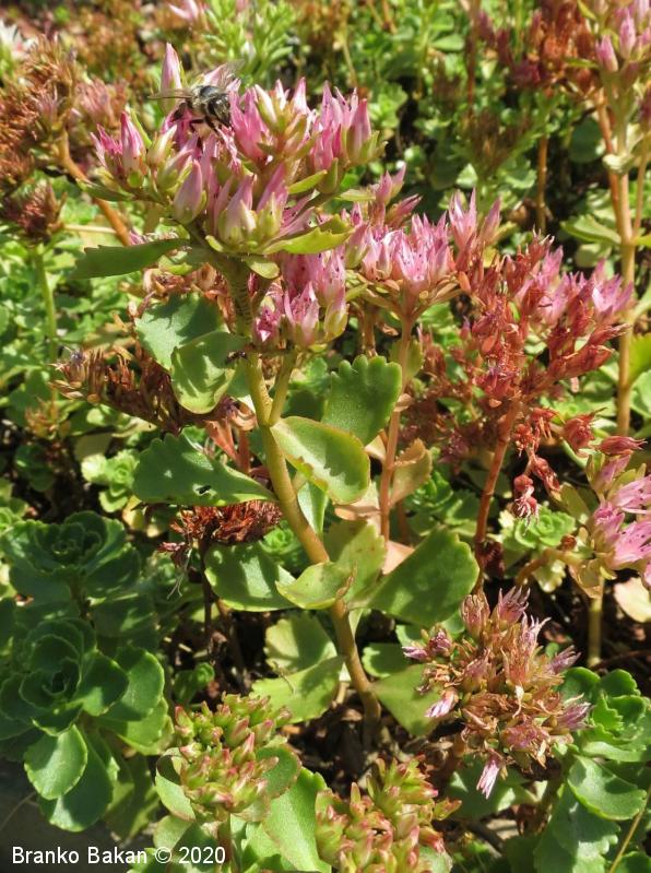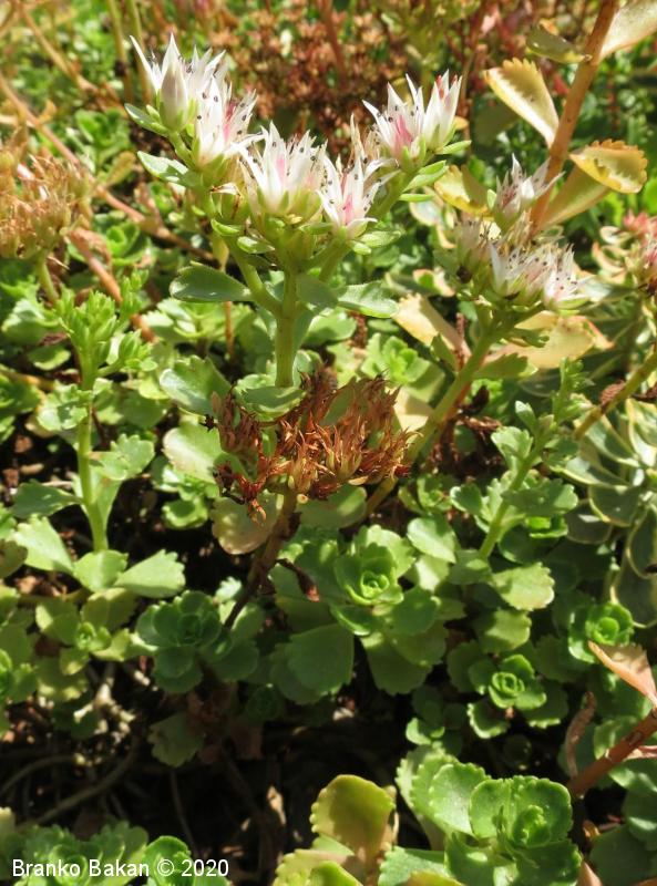 Opis: močno razrasla, polgrmičasta, plazeča trajnica z jalovimi in cvetočimi poganjki. Listi so ploski, mesnati, narobe jajčasti, sedeči, na vrhu zaokroženi ter plitvo nazobčani, večinoma nasprotno razvrščeni ali rozetasto zgoščeni. Cvetovi so bledorožnati, škrlatni ali belkasti, zvezdasti, razprostrti, nameščeni v gostocvetna, ovršna, pakobulasta socvetja. Venčni listi koničasti, okrog 8 mm veliki. Prašnikov 10.