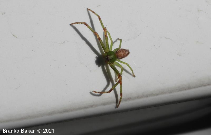 Samica: glavoprsje in noge so značilno zelenkaste, zadek je nekoliko napihnjen, bledorumenkast do belkast, z osrednjo, rjavo lisasto risbo. Prednja para nog sta precej daljša od zadnjih dveh parov (zato spominja na rakovico). Prednje noge so pogosto rjavo lisaste.