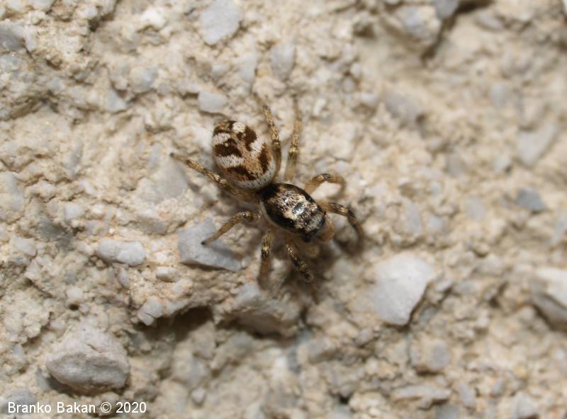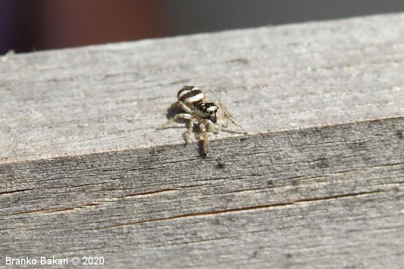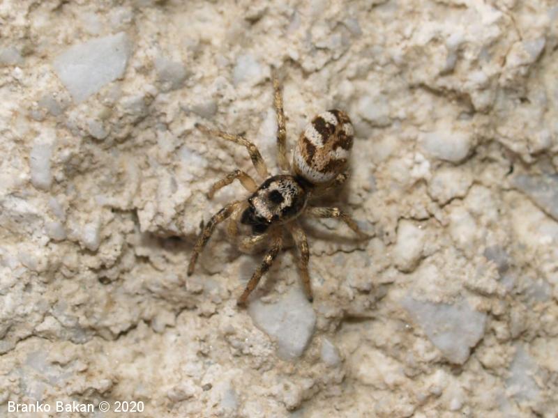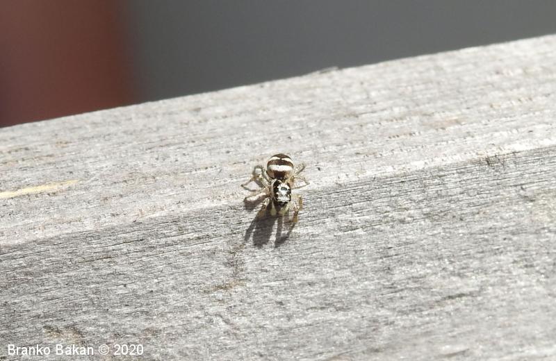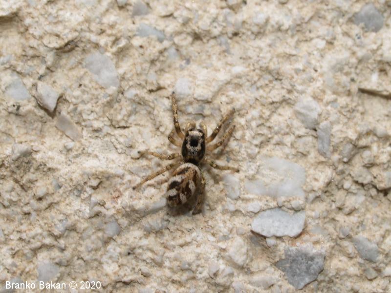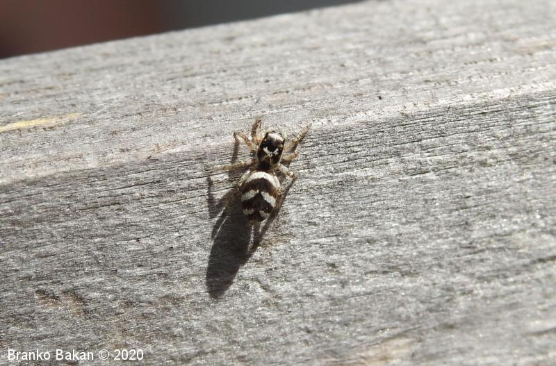 Samica: prepoznamo jo po značilnem "zebrastem" vzorcu na zadku. Telo je precej vitko, nekoliko podolgovato. Glavoprsje je rjavkasto s temnejšimi in belimi lisami. Zadek je temnorjav, s tremi prekinjenimi prečnimi, svetlimi pasovi, s širokim, sklenjenim svetlim pasom na bazalnem delu in majhno prečno svetlo črto na konici zadka. Noge so dokaj krepke, temne, porasle s svetlimi dlakami. Oči so nameščene kot pri večini skakačev.