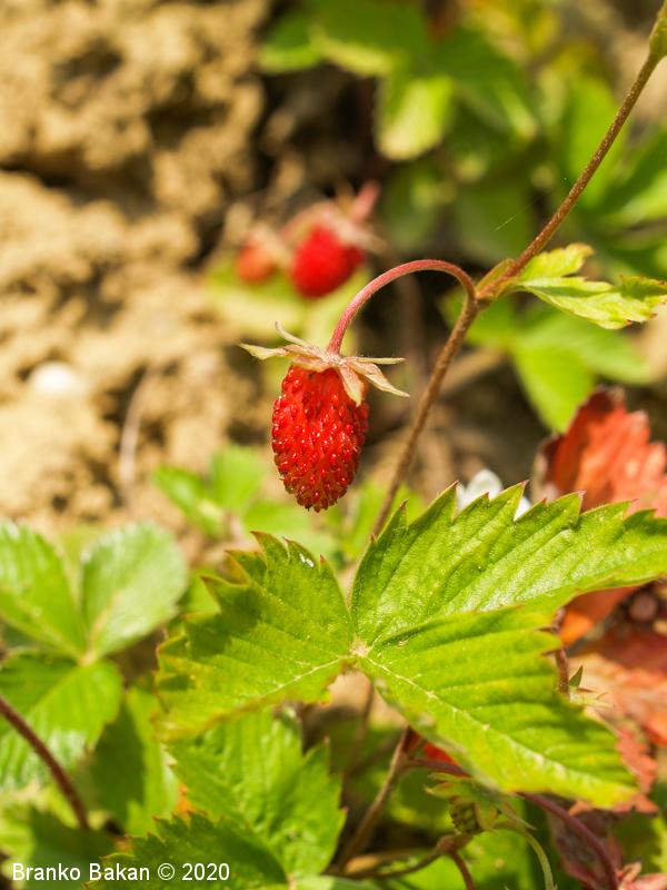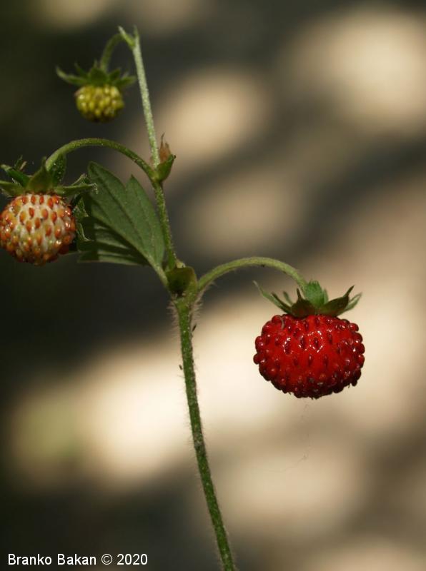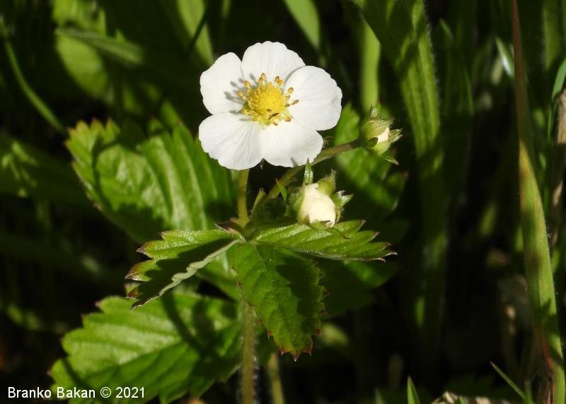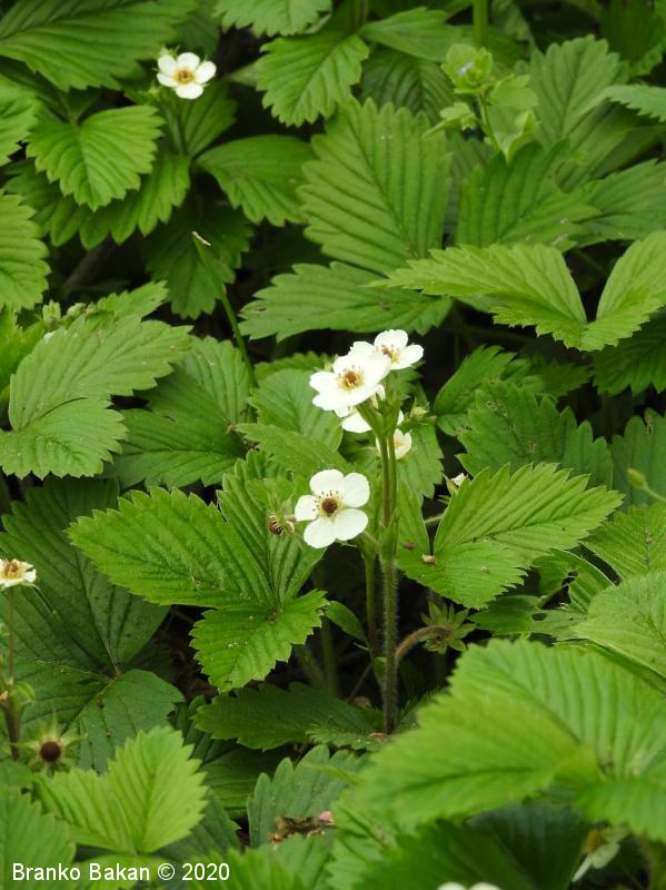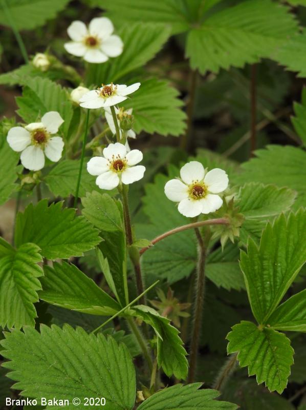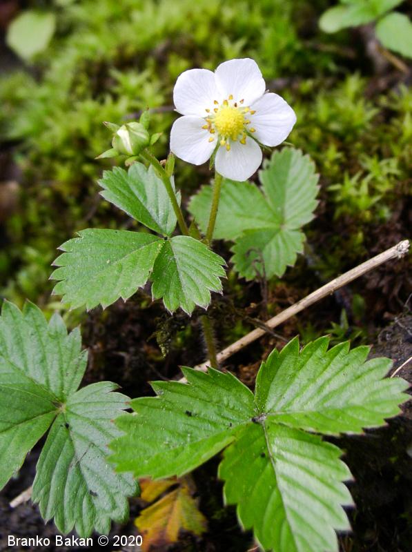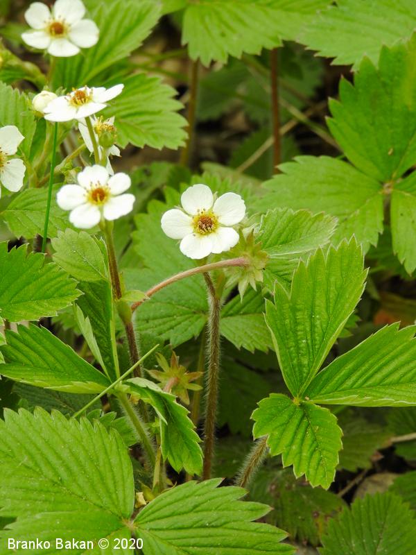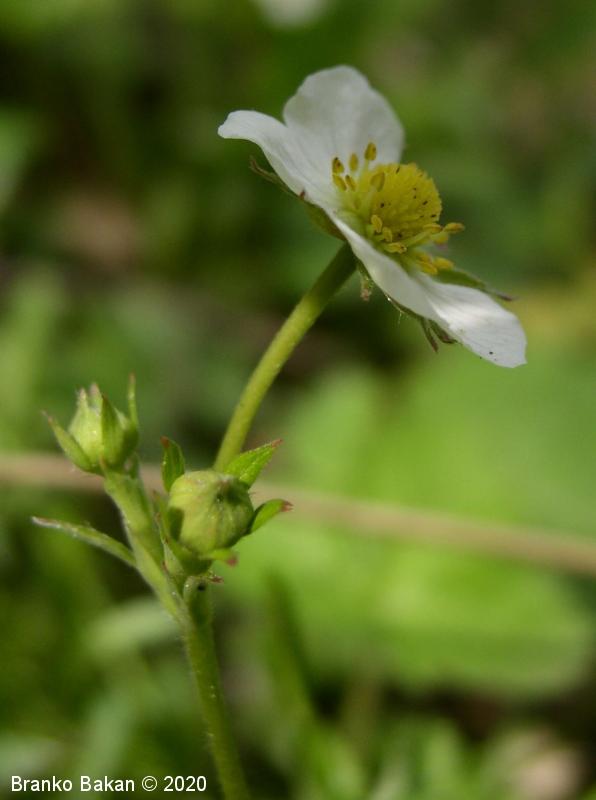 Opis: šopasto razrasla trajnica z dolgimi, nadzemnimi pritlikami (stoloni), ki se na kolencih ukoreninijo in olistajo. Steblo je nekoliko razraslo le v zgornjem delu, večinoma štrlečedlakavo, le v cvetni regiji razločno prileglodlakavo. Listi so dolgopecljati (peclji štrlečedlakavi), trojnati, segmenti jajčasti, po robu nazobčani, dlakavi. Končni zobec na listnem segmentu je večji od sosednjih dveh zobcev. Cvetovi so združeni v nekajcvetno češuljasto socvetje, dolgopecljati, po odcvetu se uvihajo navzdol. Venčni listi malo večji od čaše, topo koničasti. Ob zrelosti se cvetišče močno poveča, omeseni in pordeči v stožčasto do ovalno "jagodo" (birni orešek). Čašni listi štrlijo vstran od plodu.