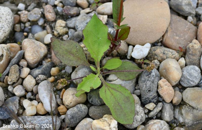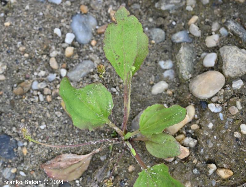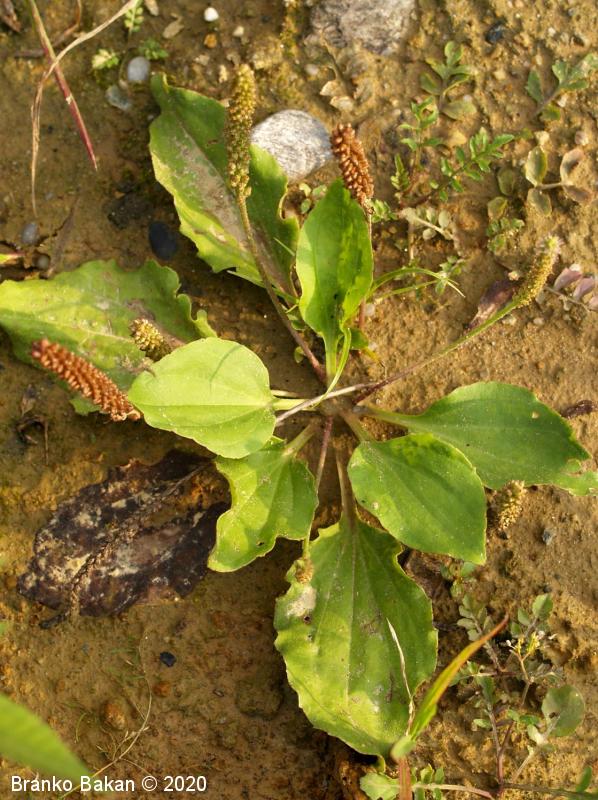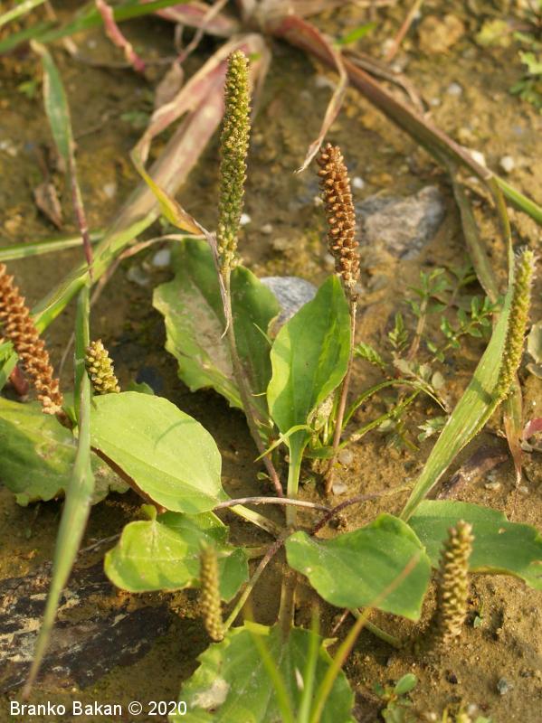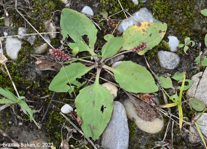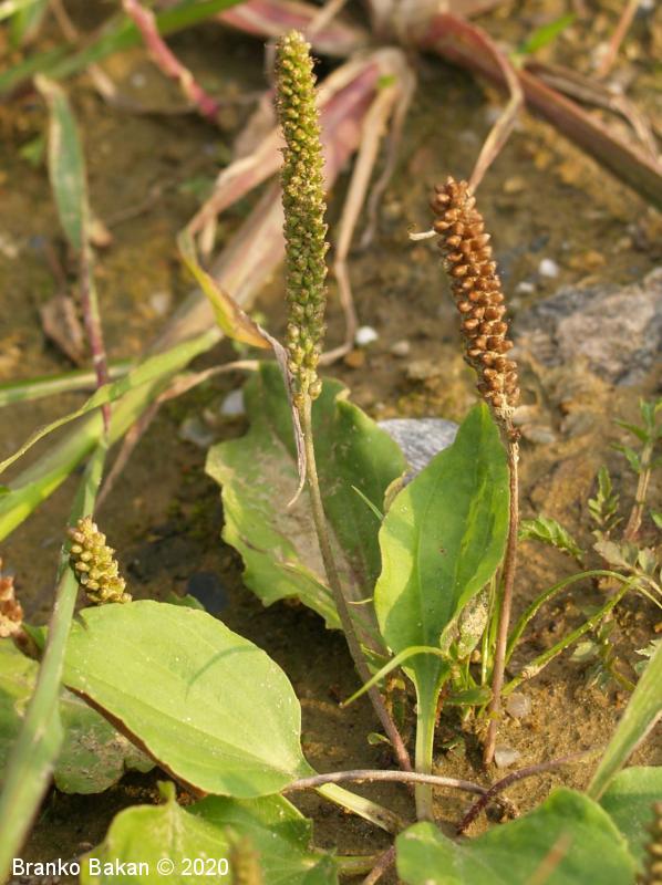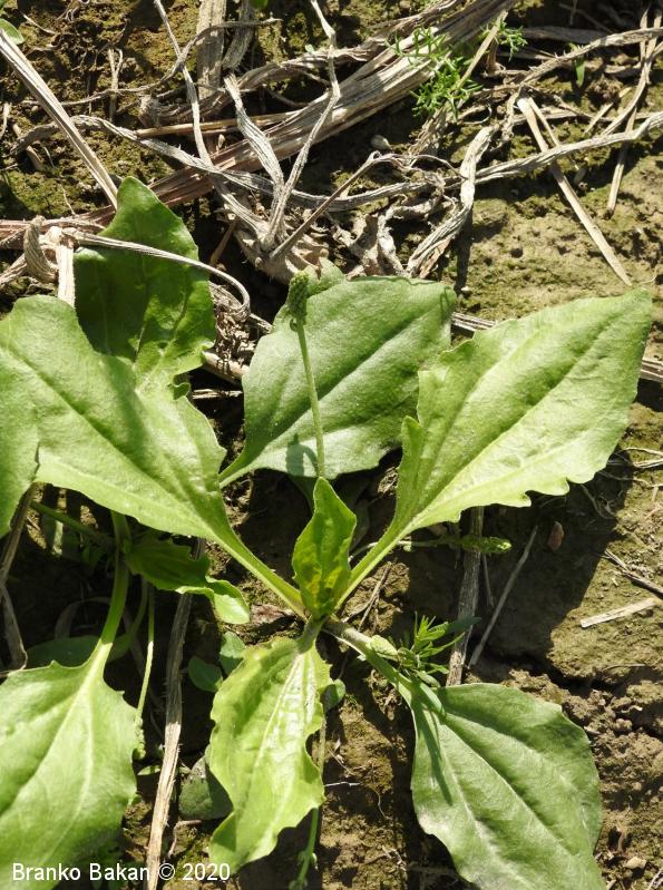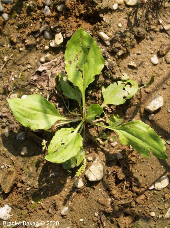 Opis: enoletnica z rozetasto nameščenimi pritličnimi listi. Listi so dolgopecjati, ozko jajčasti do jajčastosuličasti, goli, po robu izrazito drobno nazobčani, večinoma štrleči, redko nekateri prilegli k tlom. Socvetja so klasasta, dolgopecljata, večinoma na kipečih ali lokasto ukrivljenih steblih, ki so pri dnu štrlečedlakava. Cvetovi so drobni, v zalistju luskastih podpornih listov, 4-števni. Prašniki dolgopecljati, štrlijo iz cvetov, z belimi prašnicami.