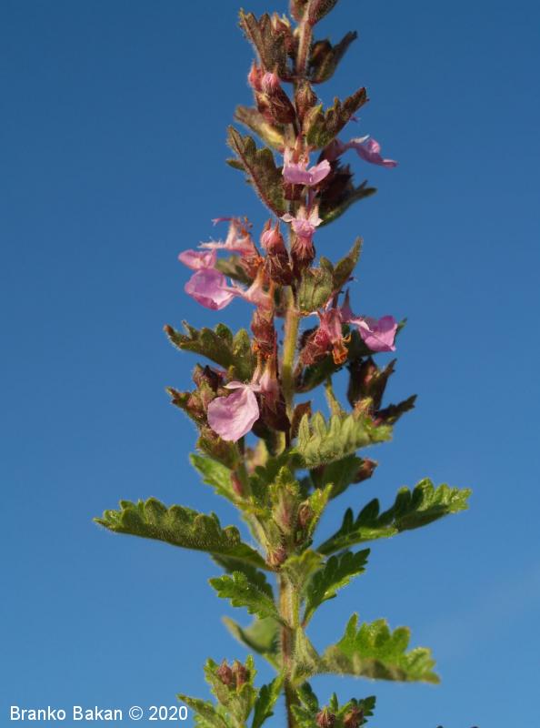 Opis: gosto razrasla, polgrmičasta trajnica s stranskimi pritlikami, ki se ukoreninjajo. Listi so nasprotno razvrščeni, globoko pernato nacepljeni do pernato krpati, zoženi v pecelj, kratkodlakavi, svetlozeleni. Cvetovi razvrščeni vzdolž stebla v navideznih zalistnih vretencih (v resnici gre za malocvetne pakobule), pecljati. Venčni listi med seboj zrasli, rožnati do škrlatnordeči, z veliko spodnjo ustno, ki je žličasto upognjena in ima majhni stranski krpi, zgornja venčna ustna je zakrnela, zato prašniki štrlijo daleč iz cvetov. Čašni listi zrasli v cev, rdečkasto nadahnjeni, dlakavi.