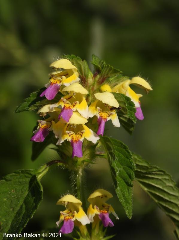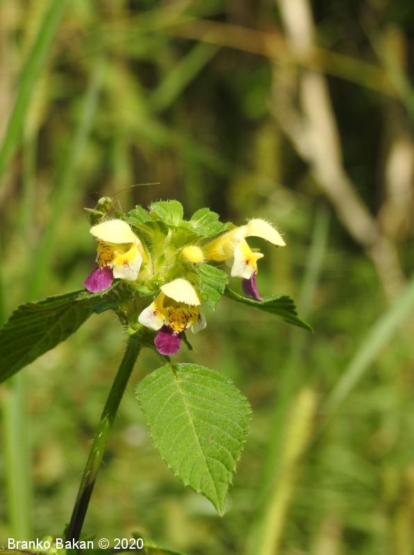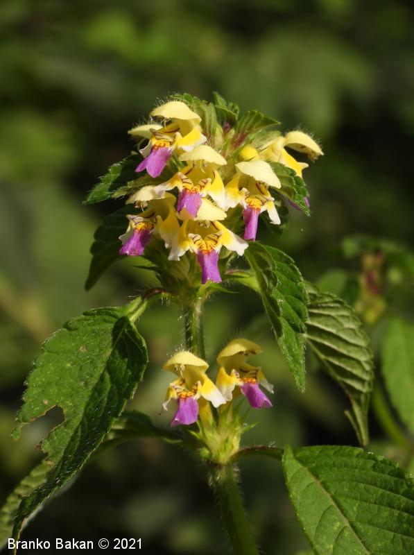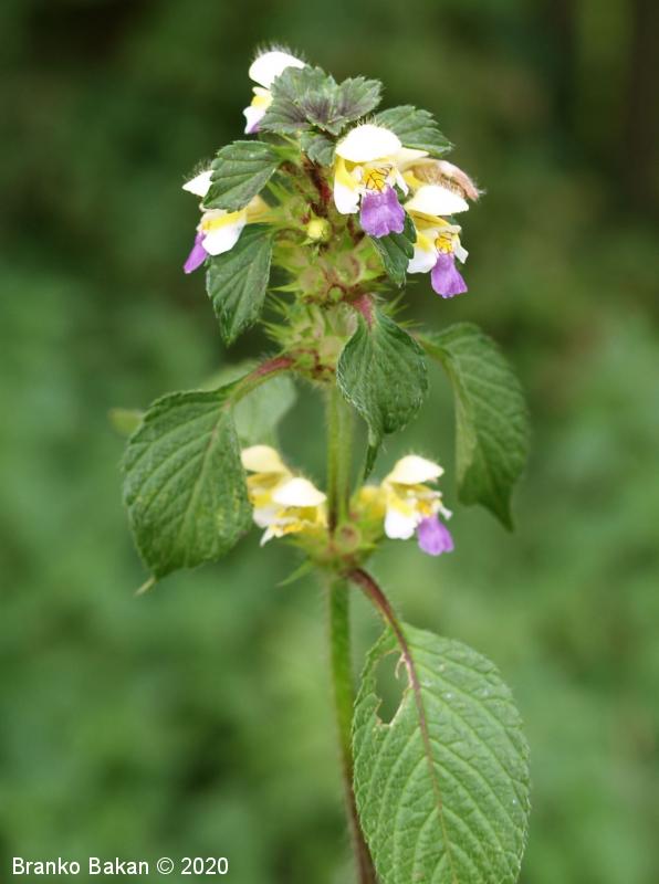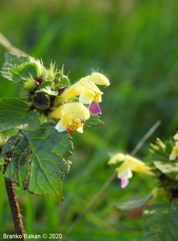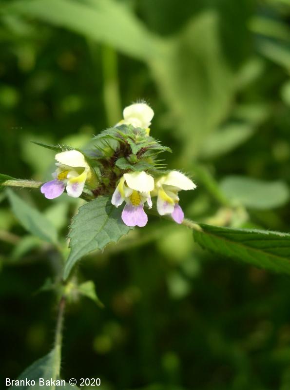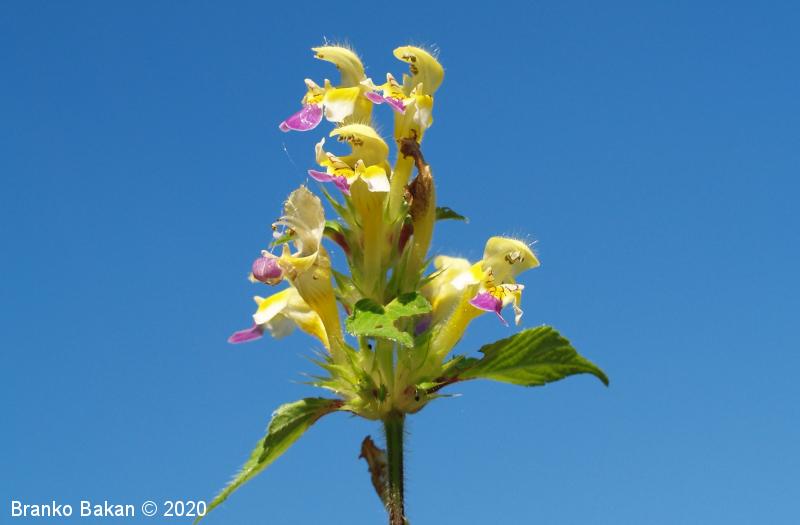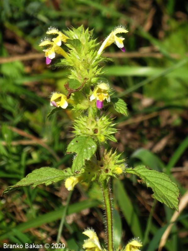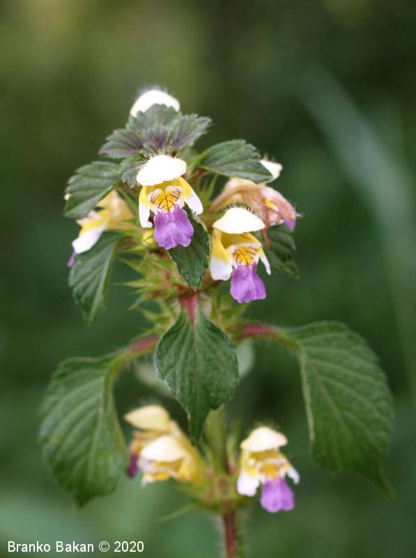 Opis: pokončna, v zgornjem delu močnio razvejana enoletnica. Steblo je štirirobo, togo ščetinastodlakavo, pod kolenci odebeljeno, na odebelitvah ščetinastodlakavo. Listi so nasprotno razvrščeni, pecljati, suličasti do jajčastosuličasti, koničasti, po robu topo nazobčani, gosto dlakavi. Cvetovi so razvrščeni v navidezna vretenčasta, zalistna socvetja (v resnici so pakobulasta), 2.5-3.5 cm veliki, svetlorumeni. Venčni listi so med seboj zrasli, spodnja ustna razločno trikrpa, stranski krpi z majhnima grbicama, manjši od osrednje krpe, ki je temno škrlatna z rumeno liso v sredini. Zgornja ustna je žličasto upognjena, rumenkasta, ščetinasto dlakava. Čašni listi so zrasli v golo čašno cev, čašni zobci so ozkokoničasti, bodeči, gostodlakavi.