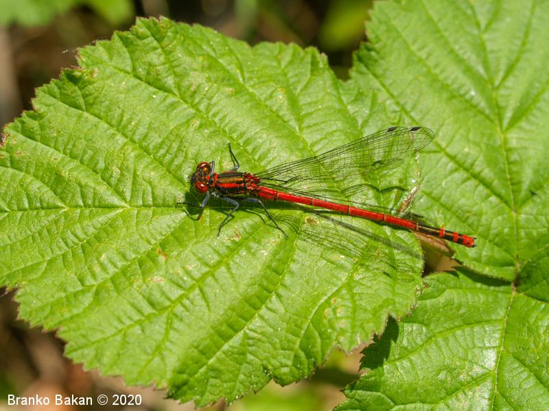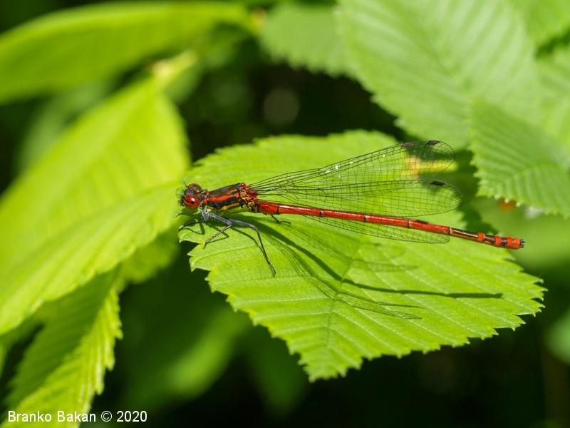 Obnašanje in razvoj: zelo zgodnja vrsta, ki se pojavlja že aprila in leta do avgusta. Predvsem spolno zreli osebki so značilno "ognjeno" rdeče-črno obarvani, zato jih zlahka prepoznamo. Pogosto posedajo po listju dreves in grmovju in niso pretirano plahi. Plen ulovijo v zraku, večinoma manjše žuželke. Ličinka je dokaj vitka, rjava do rdečerjava, s tremi listasto razširjenimi škržnimi priveski na koncu zadka. Razvoj traja nekje do dve leti, prehranjuje se z majnimi vodnimi živalmi, kot so ličinke vodnih žuželk in drugi drobni organizmi.