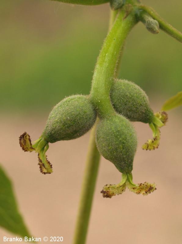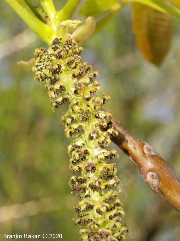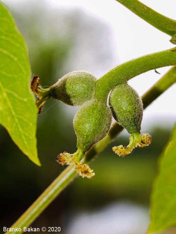 Opis: drevo z bogato razraslo krošnjo, ki sega zelo nizko in s sivkastorjavim, skoraj gladkim lubjem. Listi so lihopernato sestavljeni, 25- 40 cm veliki, sestavljeni iz 7 do 9 suličastih do jajčastih, celorobih, nepecljatih lističev. Cvetovi so enospolni, moški cvetovi so združeni v posamične, sedeče, previsne mačice, ženski cvetovi posamični ali po 2-3 skupaj, z neizrazitim cvetnim odevalom in tridelno brazdo. Plod je mesnat (mesnata lupina je zelo tanka, sprva zelena, ob zorenju počrni), koščičast enosemenski orešek ("oreh").