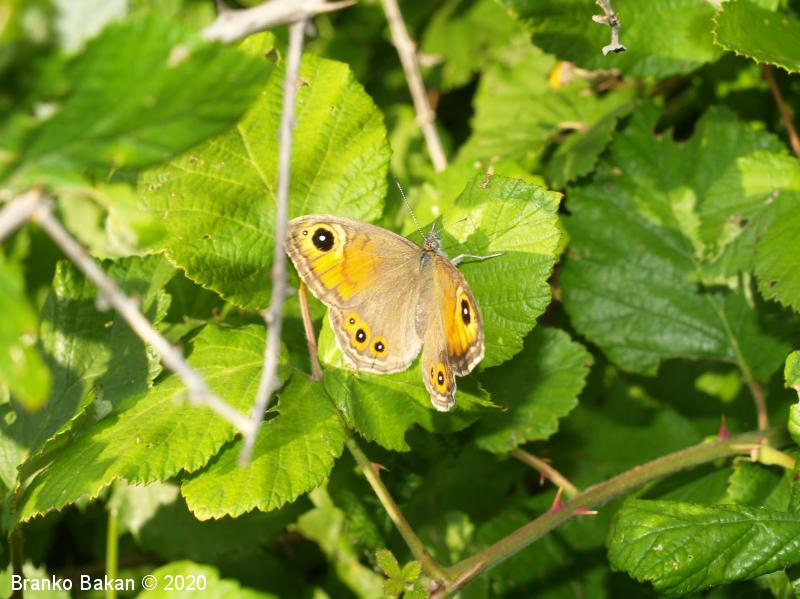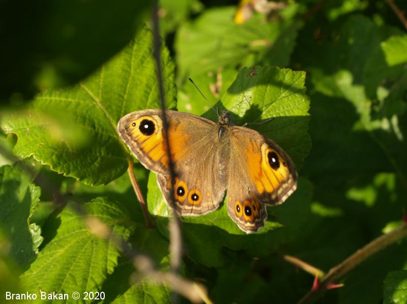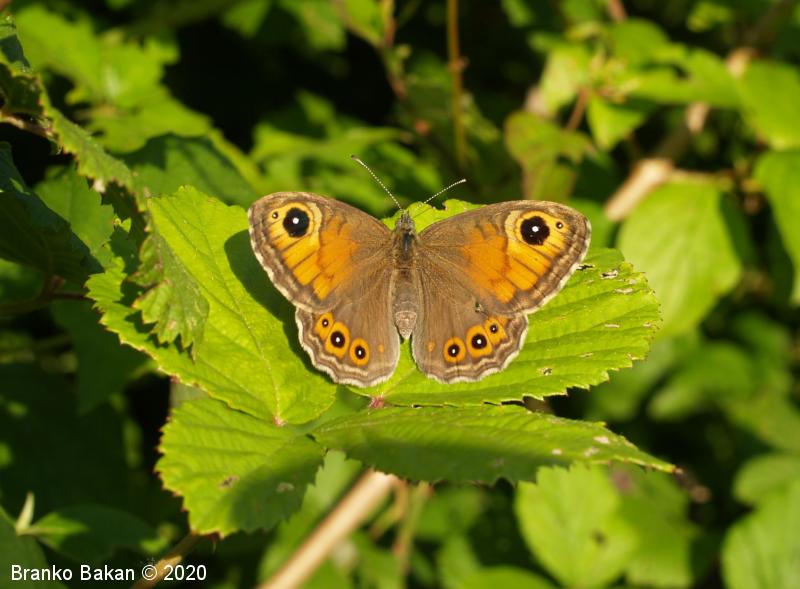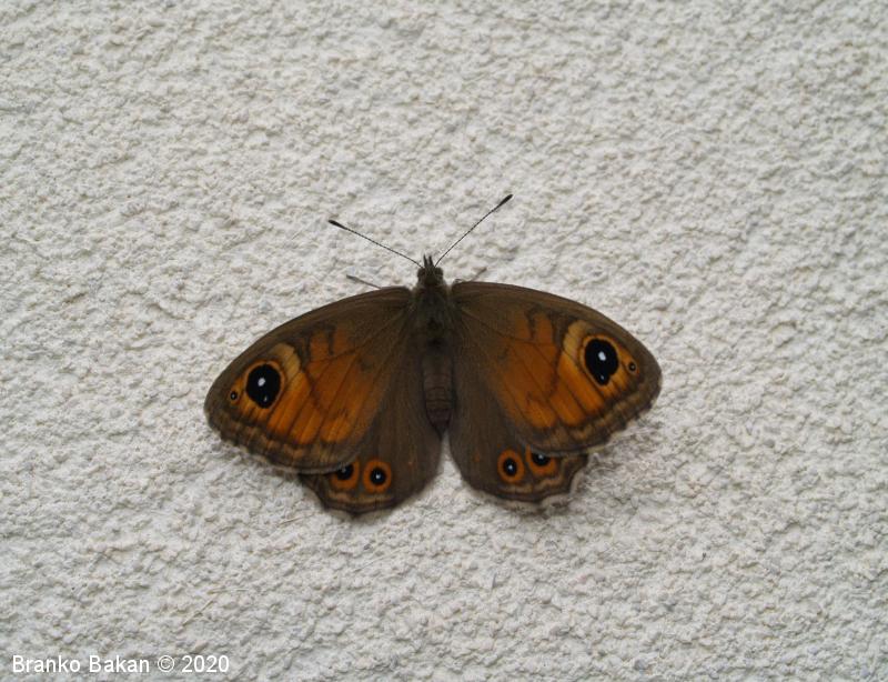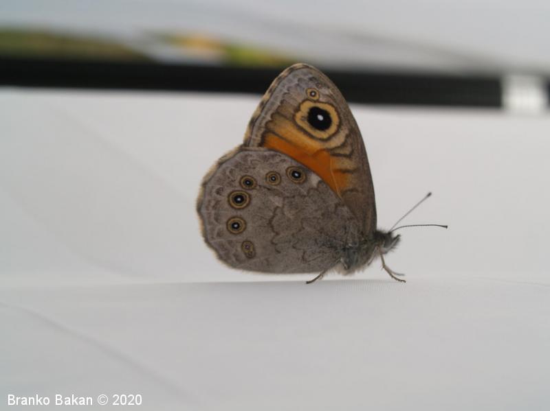 Samica: je večja in mnogo bolj pisana od samca. Večji del prednjih kril je z zgornje strani oranžnorjav, temno obrobljen in z neizrazitim, vijugastim prečnim pasom. Na prednjem delu je veliko, črno oko z belim jedrom, ob njem je večinoma še eno manjše očesce. Zadnja krila so sivorjava, z obrobnimi oranžnimi lisami, v katerih so črno obrobljena, bela očesca. Po spodnji strani je bolj ali manj podobna samcu.