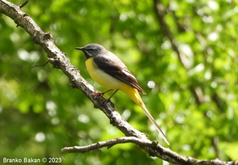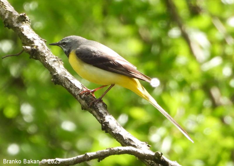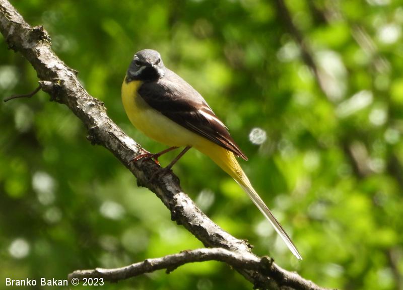 Odrasli osebki: po zgornji strani je siva, grlo je pri samcu vedno črno, pri samicah je pogosto zelo svetlo, spodnji del telesa je rumenkast (v gnezditveni sezoni intenzivno rumen, predvsem pri samcih). Čez oči poteka svetla proga, ob kljunu je daljši, bel "brk", ki poteka od baze kljuna proti spodnjemu delu lic. Peruti so temnejše, z belim pasom, ki je dobro viden v letu. Rep je zelo dolg, temen in belo obrobljen. Tudi trtica in podrepni del sta rumena. Noge so tanke, dokaj dolge, rjavkasto rožnate. V zimskem perju je obarvanost manj intenzivna.