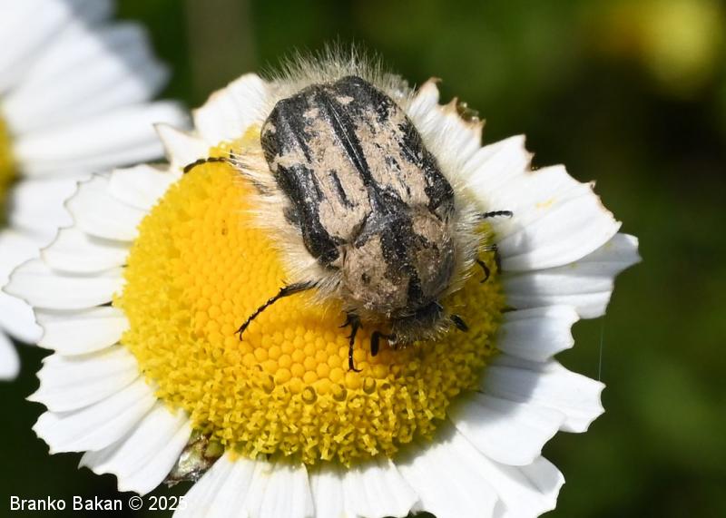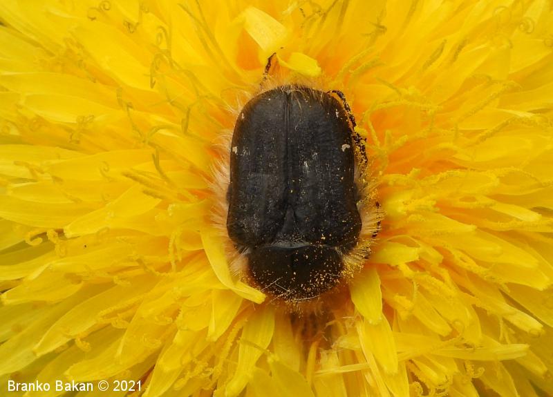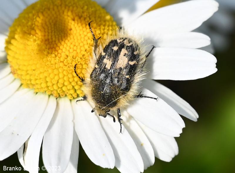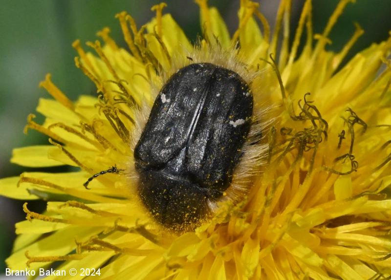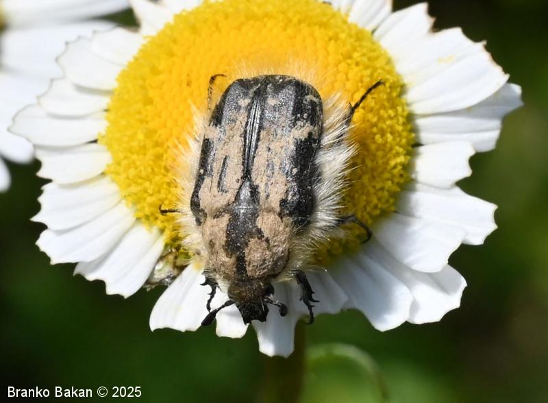 Odrasli osebki: telo je dokaj krepko, skoraj črno, nebleščeče, gosto poraslo z dolgimi, rumenorjavimi in belkastimi dlakami. Glava je drobna, sprednji del je plitvo ugreznjen. Oprsni ščit (pronotum) je precej velik, zaokrožen, z izrazitejšim hrbtnim gredljem, na vrhu in pri dnu bolj ali manj raven. Pokrovke so pri vrhu nekoliko razširjene, proti dnu nekoliko zožene, zaobljene, vzdolžno brazdaste, z belimi lisami in črticami ob robovih in z dvema značilnima prečnima lisama v spodnjem delu (obarvanost z lisami močno variira, lise pogosto tudi manjkajo). Noge so temne, krepke, sprednja stegenca s po tremi trnatimi izrastki na notranji strani.