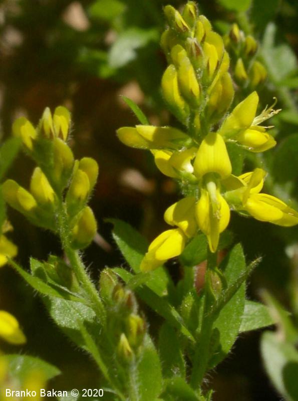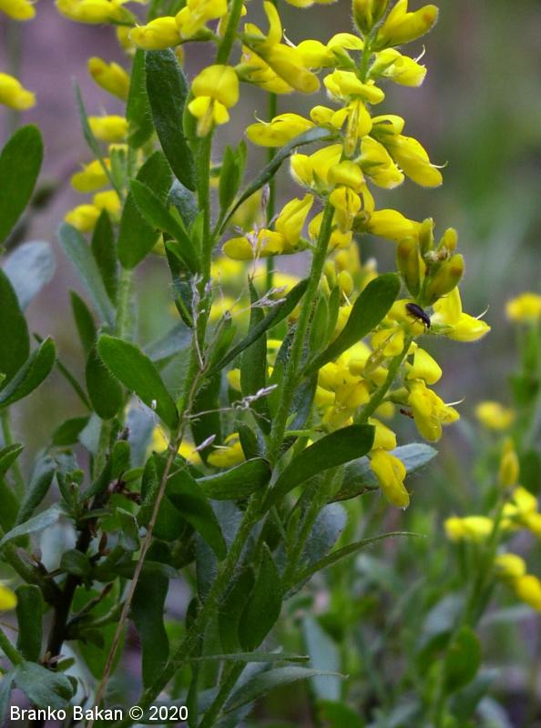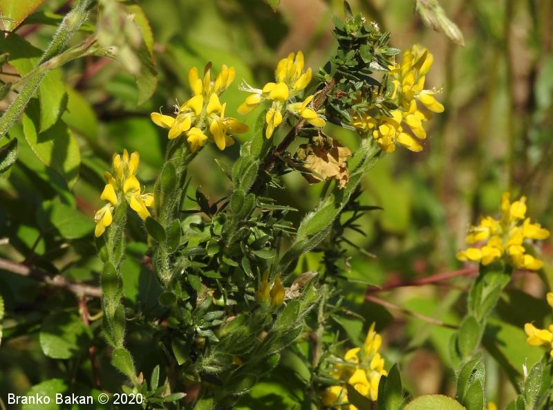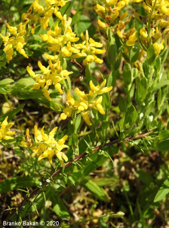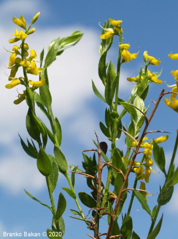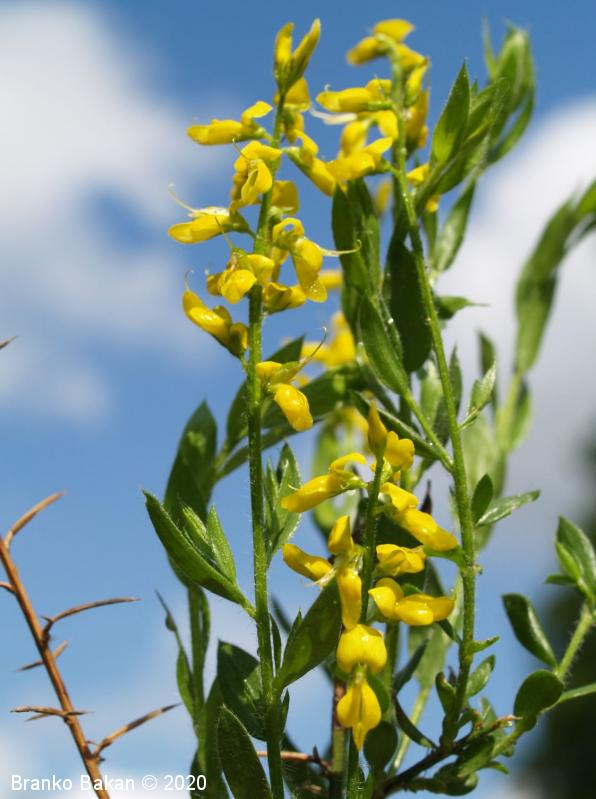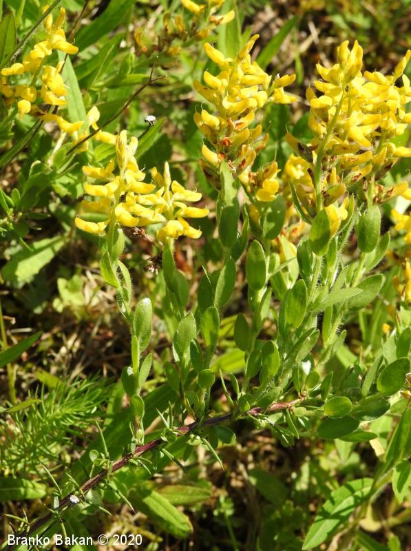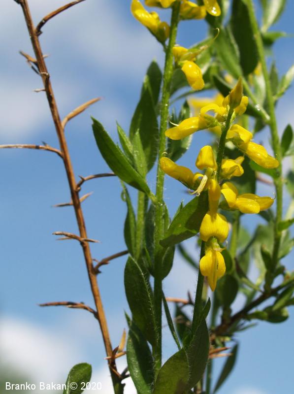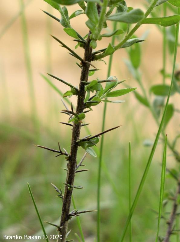 Opis: pokončen, razrasel in v spodnjem delu s trni porasel polgrmiček, z zelenimi, mladimi poganjki. Listi so premenjalno razvrščeni, sedeči, celorobi, jajčastosuličasti, po robovih štrlečedlakavi, sicer skoraj goli. Cvetovi so somerni (metuljasti), okrog 1-1.5 cm veliki, razvrščeni v ovršna, podaljšana, grozdasta socvetja, pecljati. Jadro (največji, navzgor štrleč venčni list) je golo, tako veliko kot stranski krili, ladjica (naprej štrleča venčna lista) je kratkodlakava. Čašni listi so zrasli v čašno cev, na vrhu podaljšani v šilaste čašne roglje, dlakavi. Plod je strok, po vsej površini štrlečedlakav.