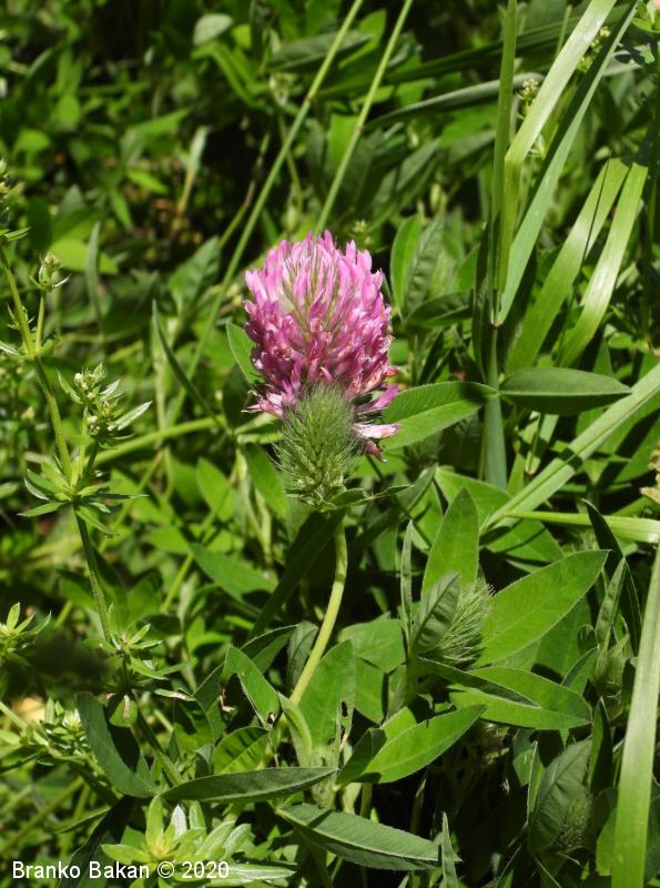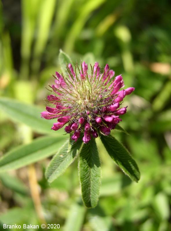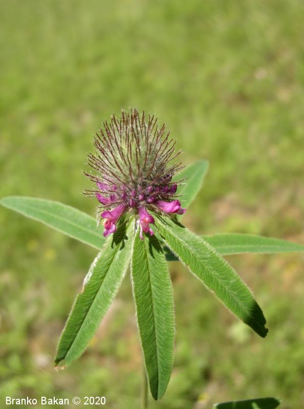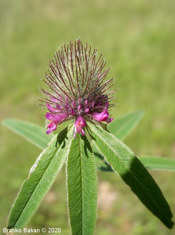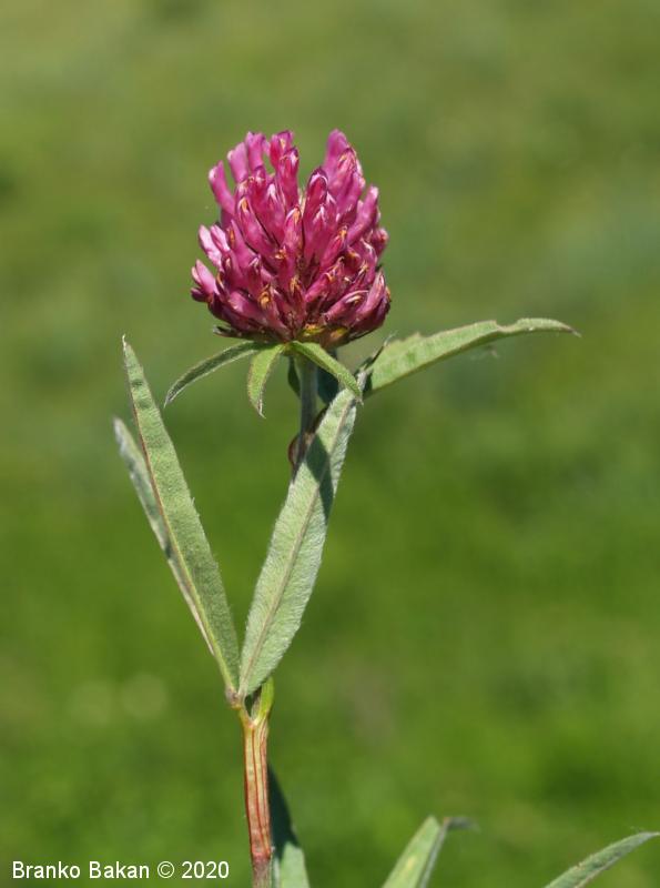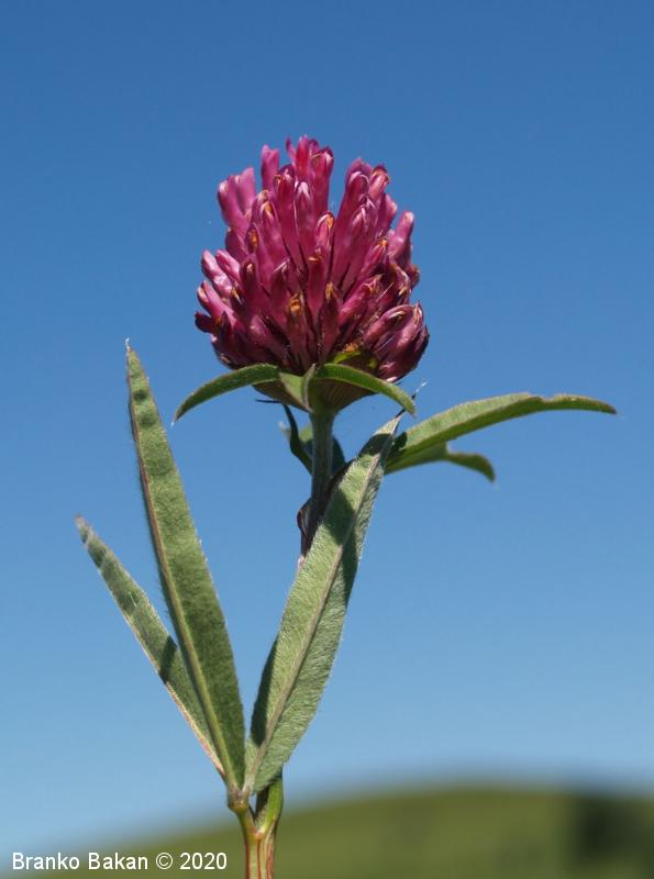 Opis: pokončna trajnica, z delno podzemnim, razraslim steblom. Listi so trojnati, dolgopecljati, deljeni v ozkosuličaste do ozko eliptične segmente, ki so kratko prileglodlakavi, po robu zelo drobno nazobčani. Cvetovi škrlatnordeči, zgoščeni v oblasta do glavičasta, ovršna, pecljata (pecelj navadno zakriva širok prilist) socvetja. Tik pod socvetjem se pogosto nahaja ovršni list. Jadro (zgornji, največji venčni list) z zelo dolgo žebico (raven, podaljšan del jadra), ki je vsaj 2-krat daljša od ploščice jadra. Čašni listi zrasli v kratko, raztresenodlakavo čašno cev, na vrhu podaljšani v ozke zobce (spodnji čašni zobec je zelo dolg, skoraj tako dolg kot žebica jadra), ki so dlakavi po robovih. Plod je strok, ki ga po cvetenju obdajajo venčni listi.